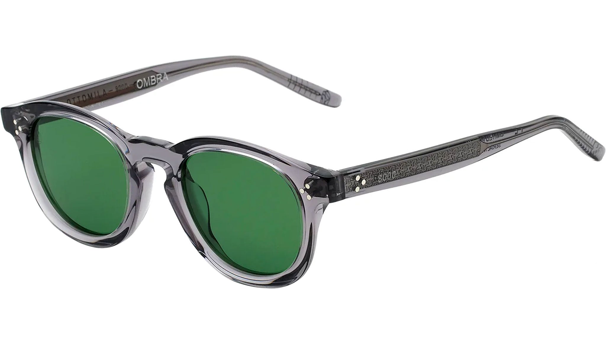 A timeless piece of eyewear designed for Ottomila, a high-end brand known for its meticulous approach to design and craft. Ombra is a contemporary reinterpretation of classic 1950s silhouettes, characterized by a keyhole nose-bridge and rounded lenses. Its curved rims were crafted from thick and sturdy Italian acetate, and carved on the sides to reveal precise, geometric edges. Minute metalwork and inscriptions complete the piece. This version comes in forest green lenses and grey semi-transparent acetate. This translucent effect highlights the personalized metal core with Frank Lloyd Wright pattern decoration in the temples-