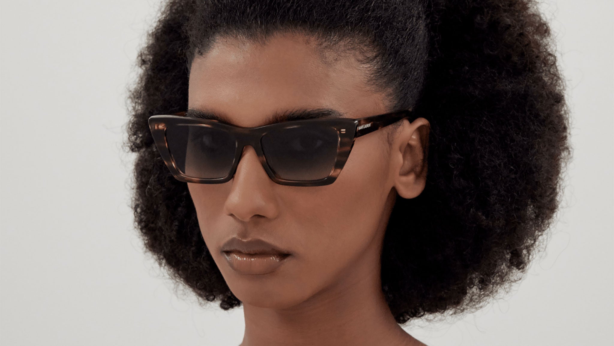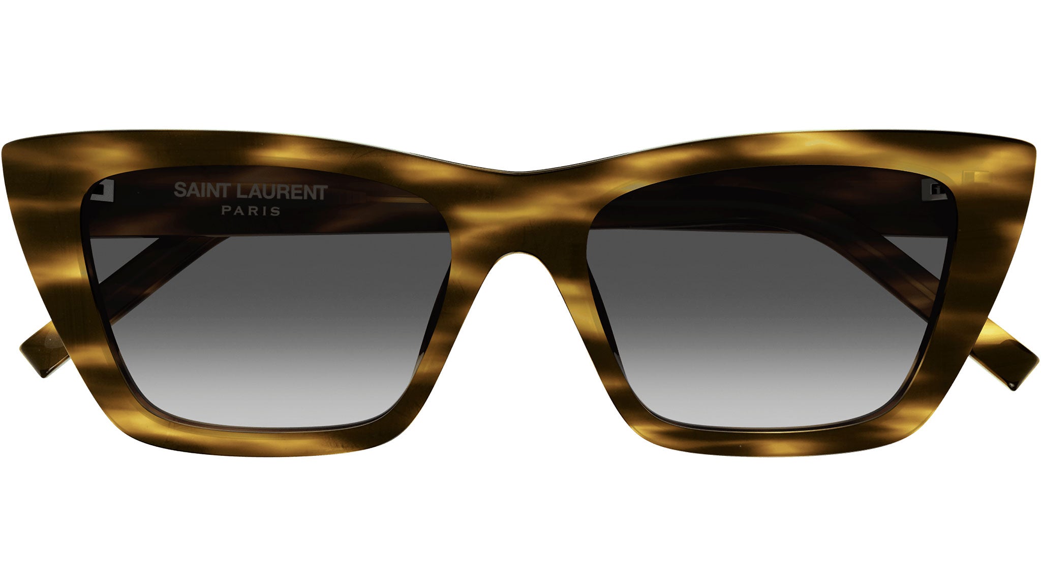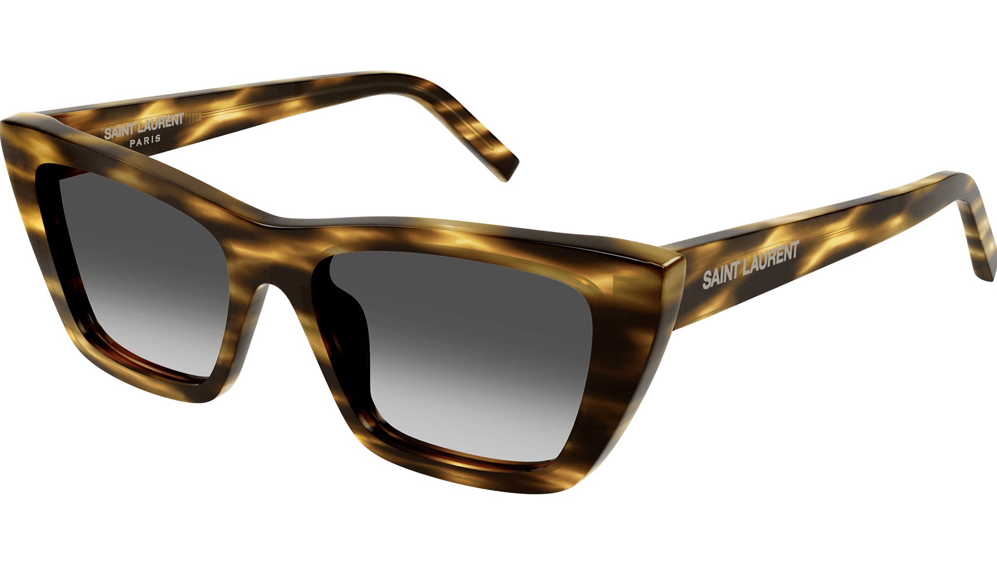 Occhiali da sole Saint Laurent modello SL 276 MICA linea New Wave codice colore 042 avana fiammato lucido in acetato forma cat eye con lenti color grigio sfumato.