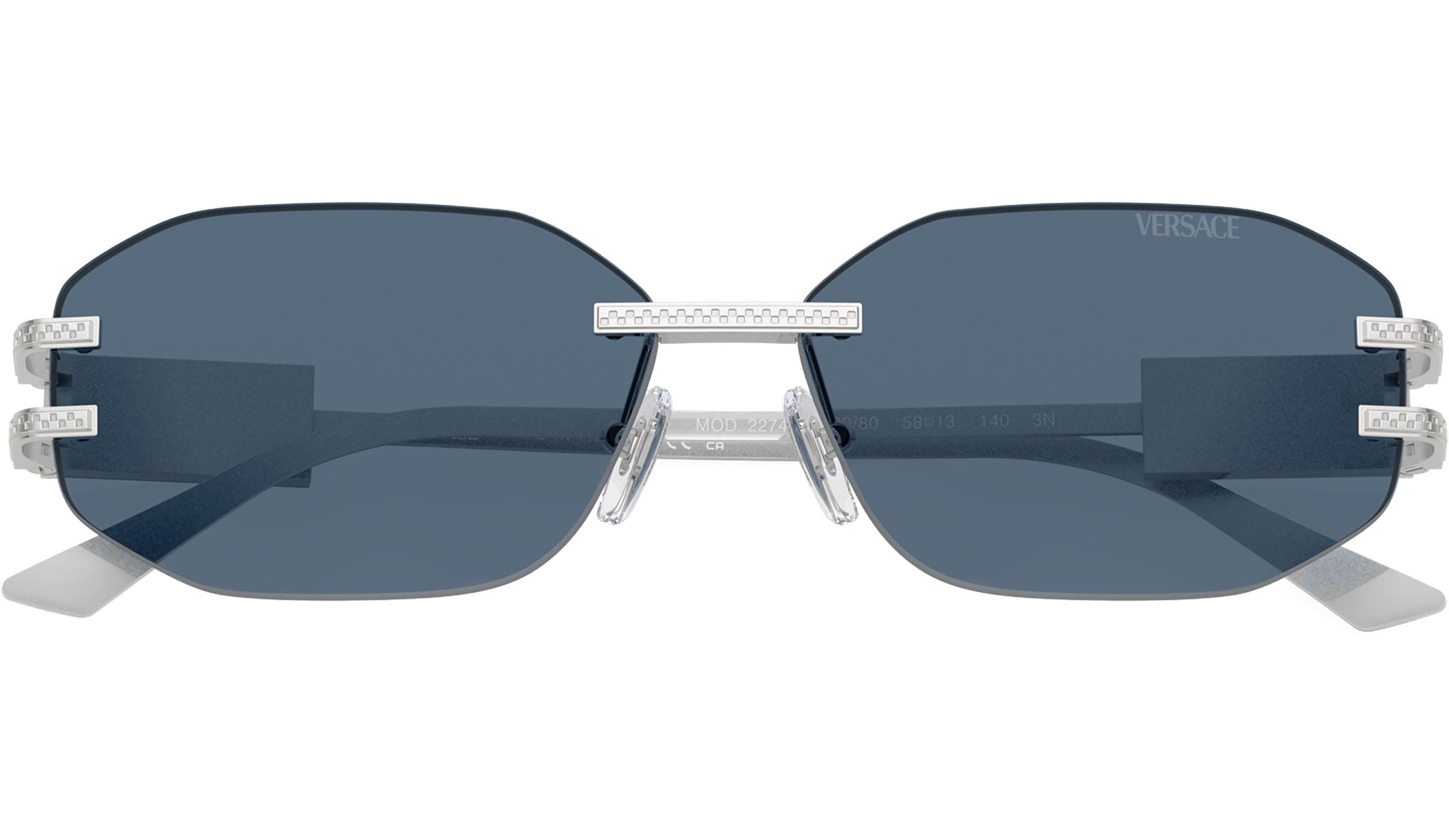 Occhiali da sole Versace donna modello 2274 rimless in metallo color argento con lenti blu scuro base 2. Naselli regolabili. Linea: Fashion Id. Codice brand: 0VE2274. Codice colore: 100080. Rivenditore autorizzato online Versace Eyewear. Ogni prodotto Versace viene consegnato con astuccio originale e accessori ed è coperto da garanzia del produttore di 12 mesi.