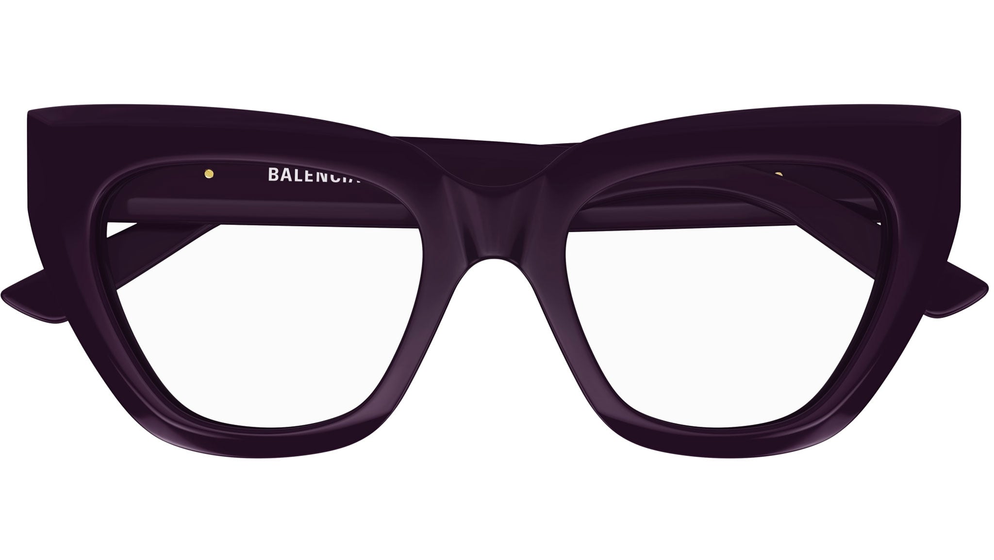 Occhiali da vista Balenciaga modello BB0238O linea Everyday codice colore 006 viola scuro tinta unita lucido in acetato forma cat eye con aste color viola.