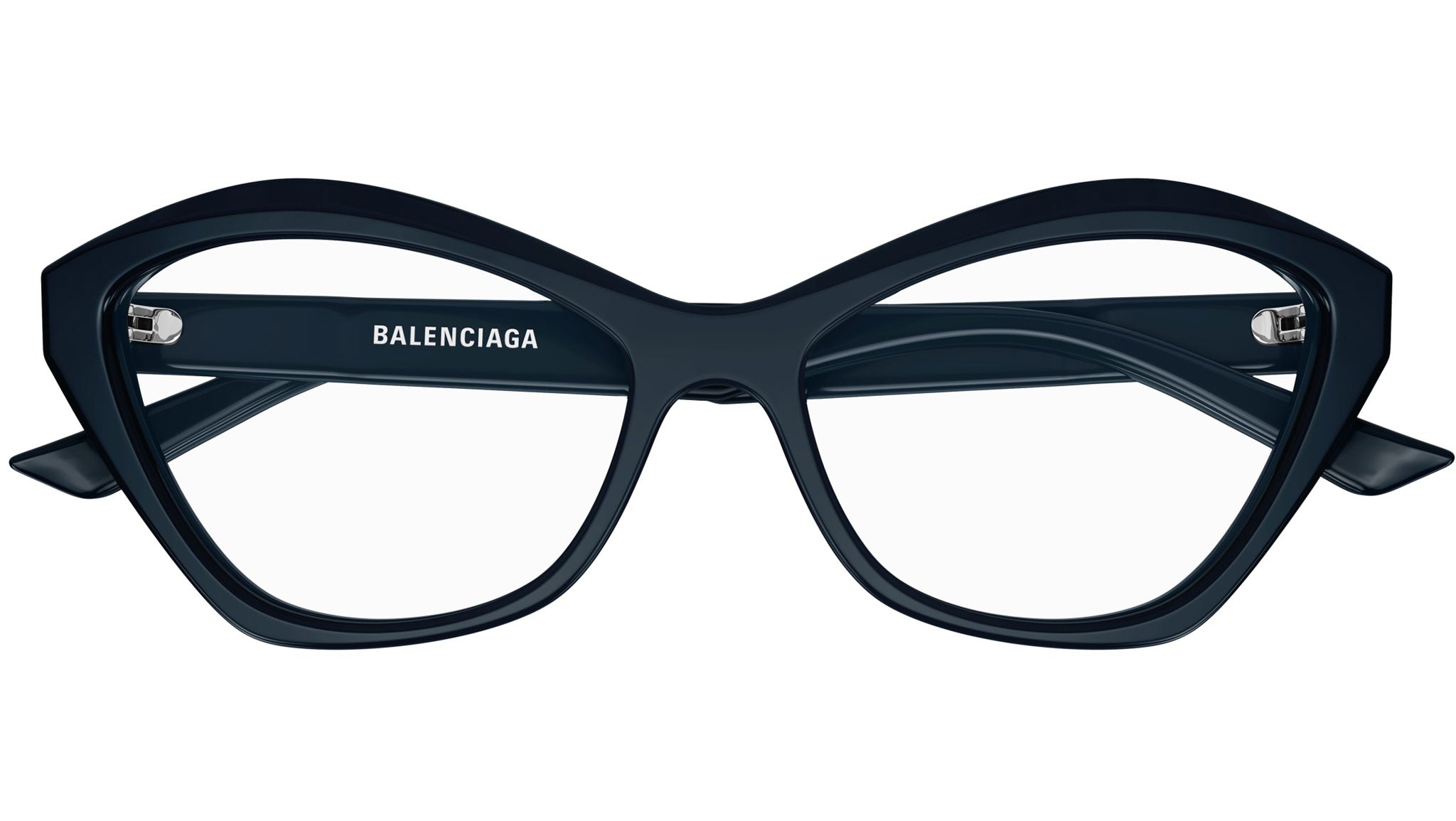 Occhiali da vista Balenciaga modello BB0341O linea Everyday codice colore 004 blu navy solido lucido in acetato riciclato forma cat eye con aste color blu.