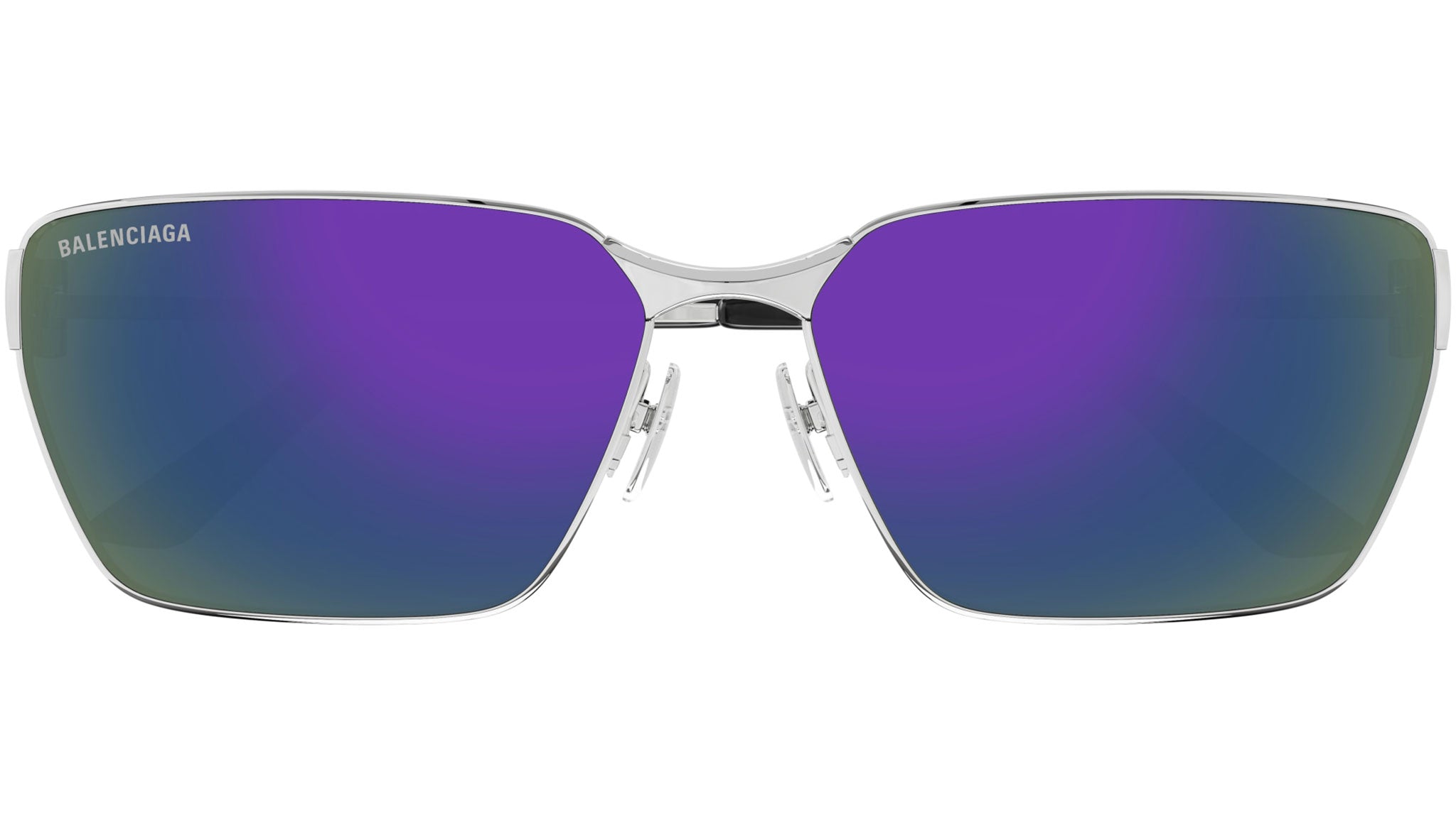 Occhiali da sole Balenciaga modello BB0374SK linea Everyday codice colore 003 argento lucido in metallo forma rettangolare con aste color argento e lenti color grigio pieno + viola doppio specchio. Rivenditore autorizzato Balenciaga online. Gli occhiali vengono consegnati con custodia e accessori originali e sono coperti dalla garanzia ufficiale di 12 mesi del produttore.