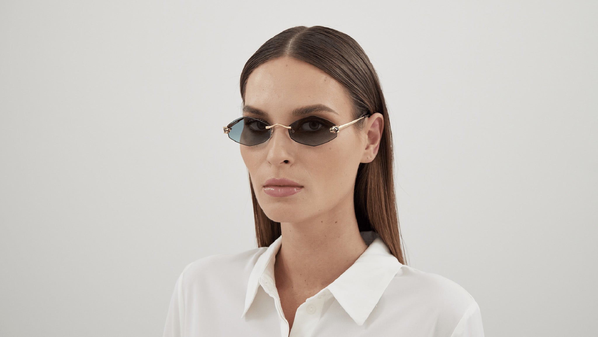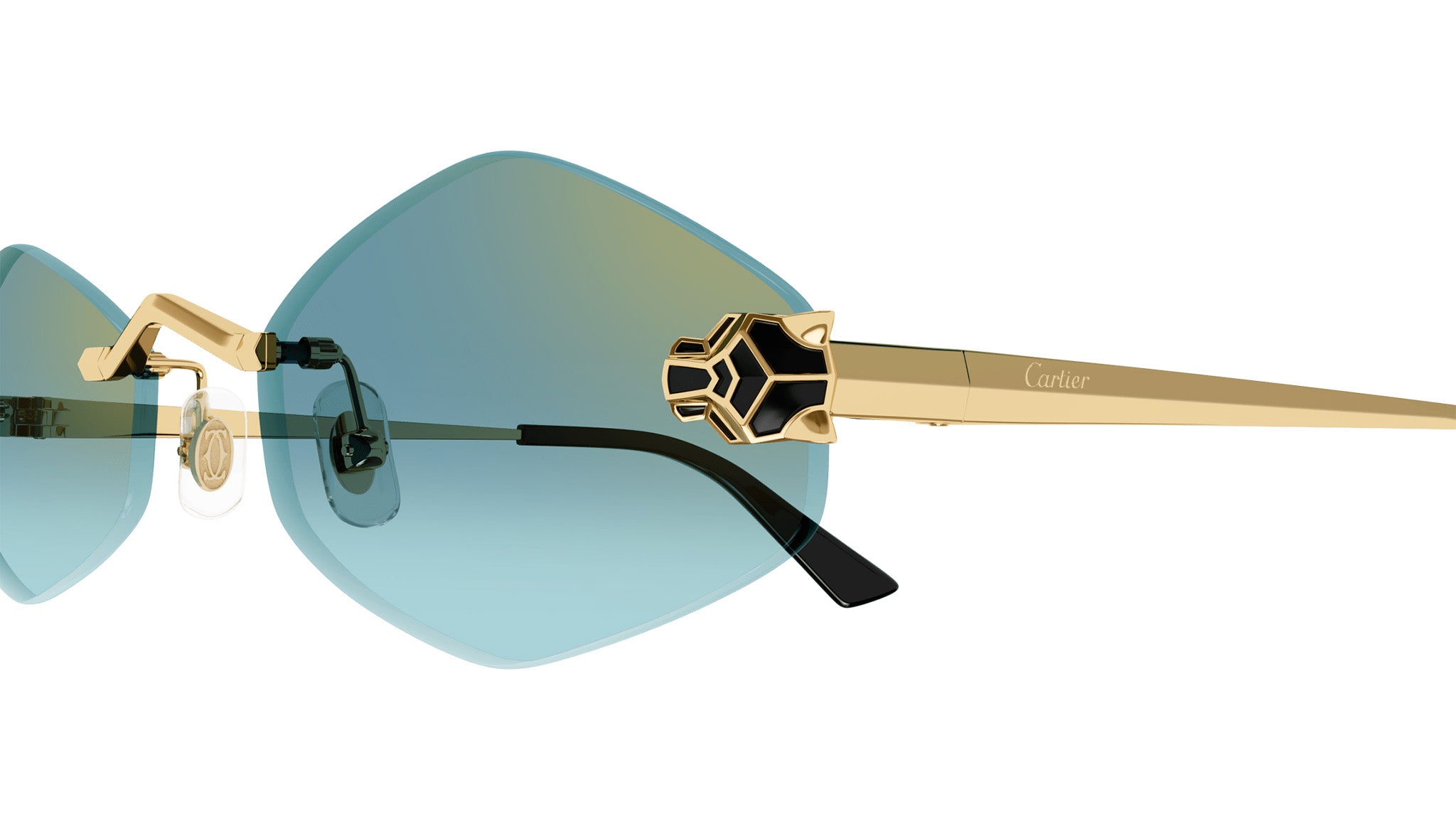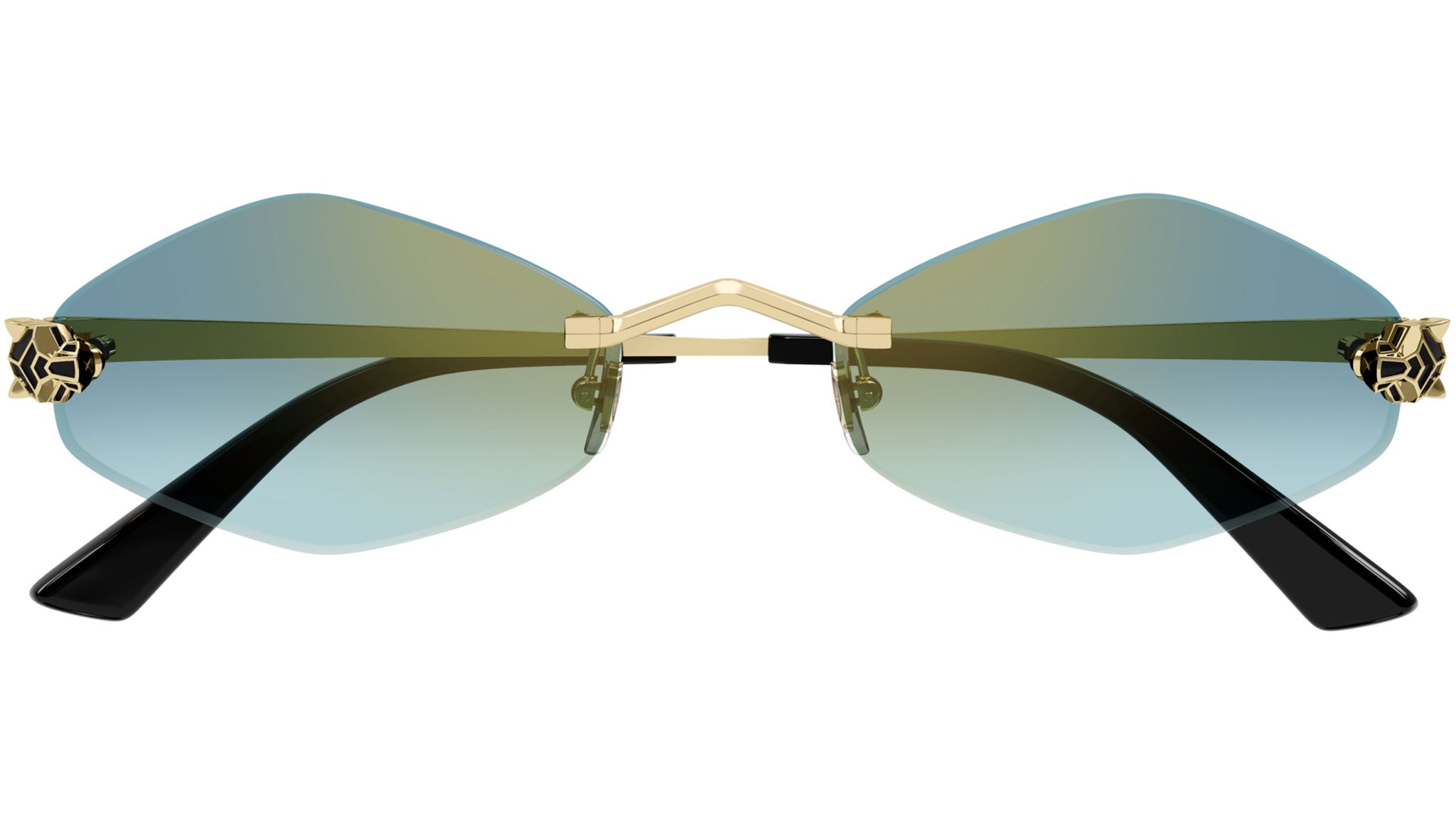 Occhiali da sole Cartier linea Core Range modello CT0433S geometric in metallo codice colore 003 oro finitura smooth con aste oro e lenti color verde intenso e turchese con flash oro .