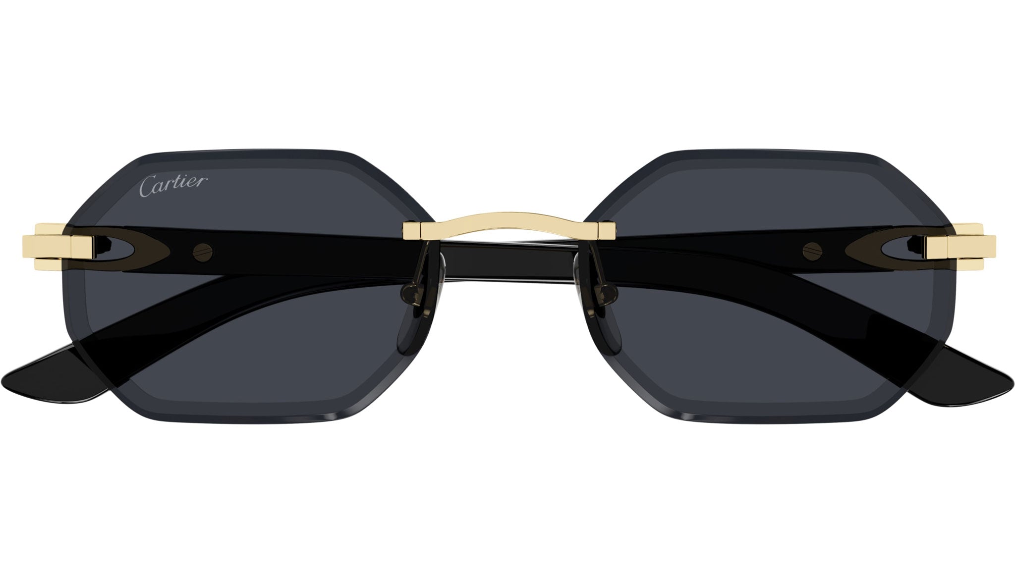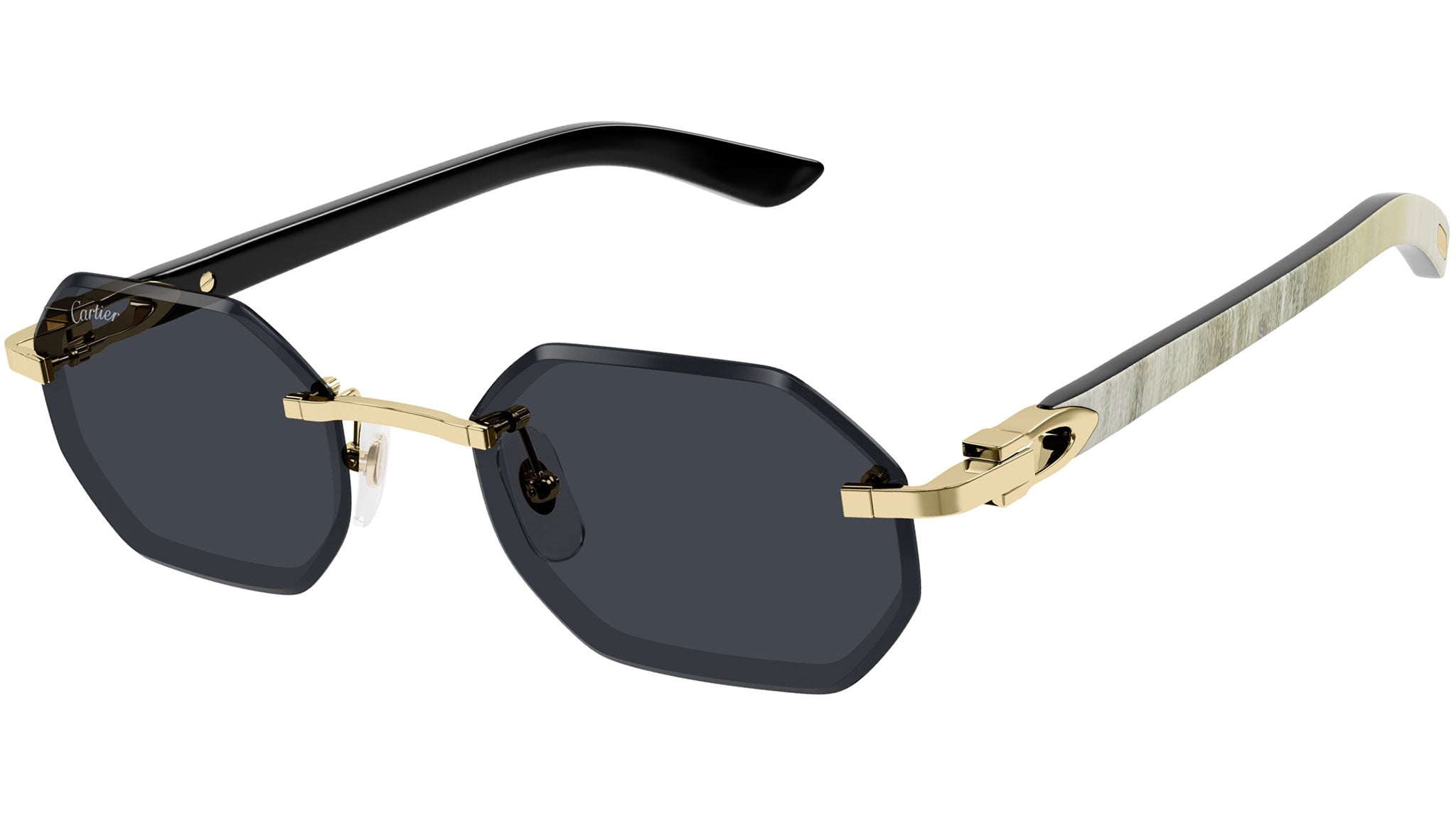 Occhiali da sole Cartier linea Exception modello CT0439S geometric in metallo codice colore 002 oro finitura smooth con aste bianco e lenti color grigio.
