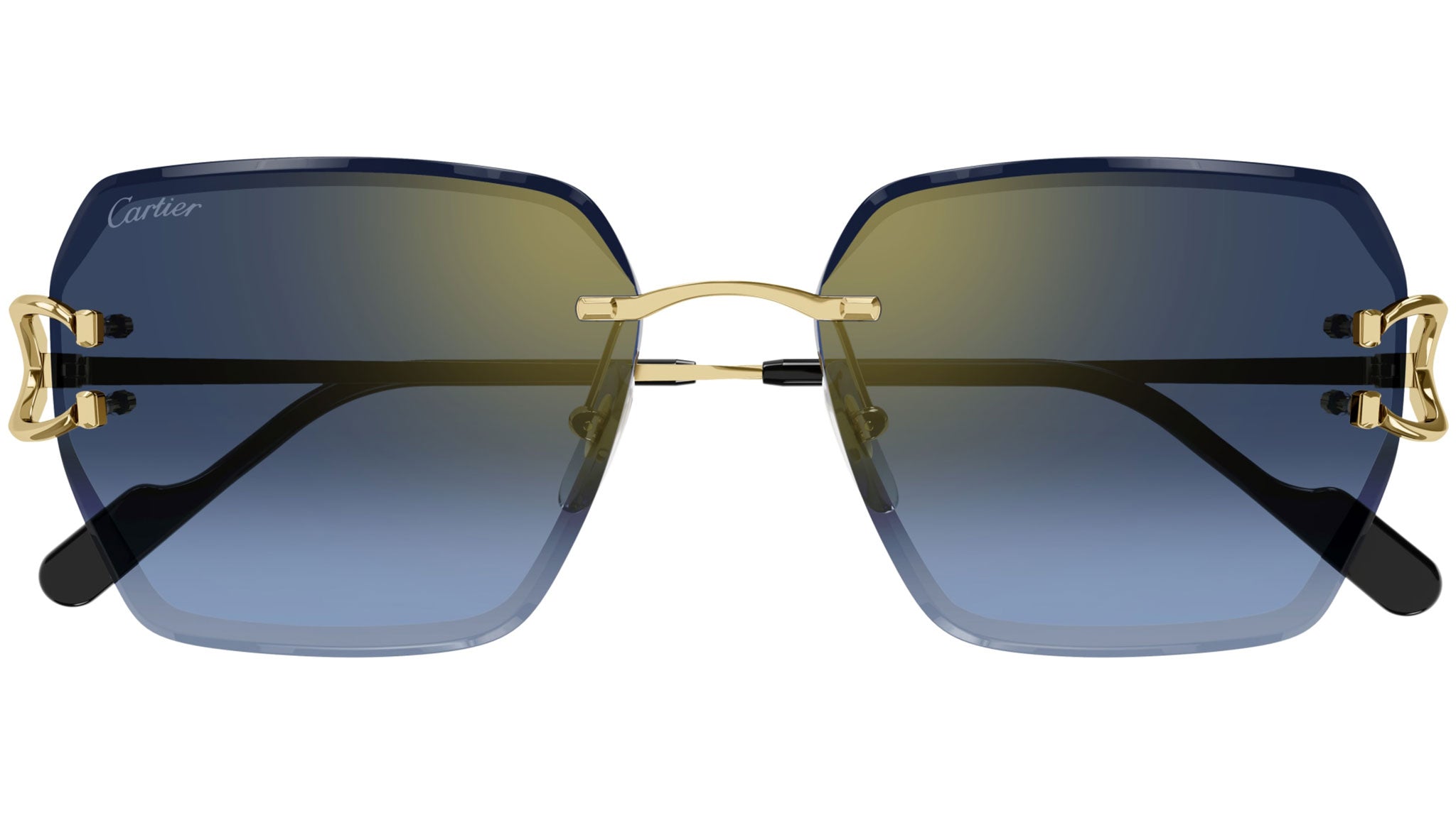 Occhiali da sole Cartier linea Core Range modello CT0466S cat eye in metallo codice colore 002 oro finitura smooth con aste oro e lenti color blu e azzurro con flash oro.