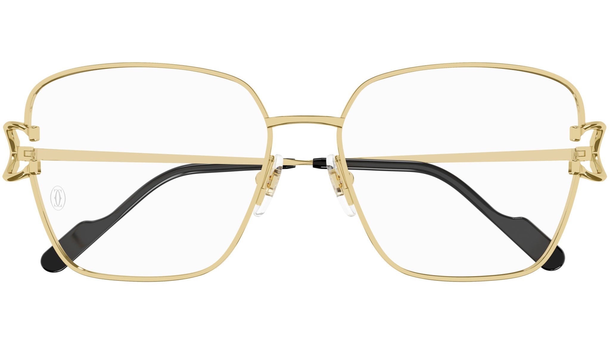 Occhiali da vista Cartier Core Range modello CT0486O cat eye in metallo codice colore 001 oro finitura smooth con aste oro e lenti demo da materiale riciclato con strato HR e filtro AR blu.