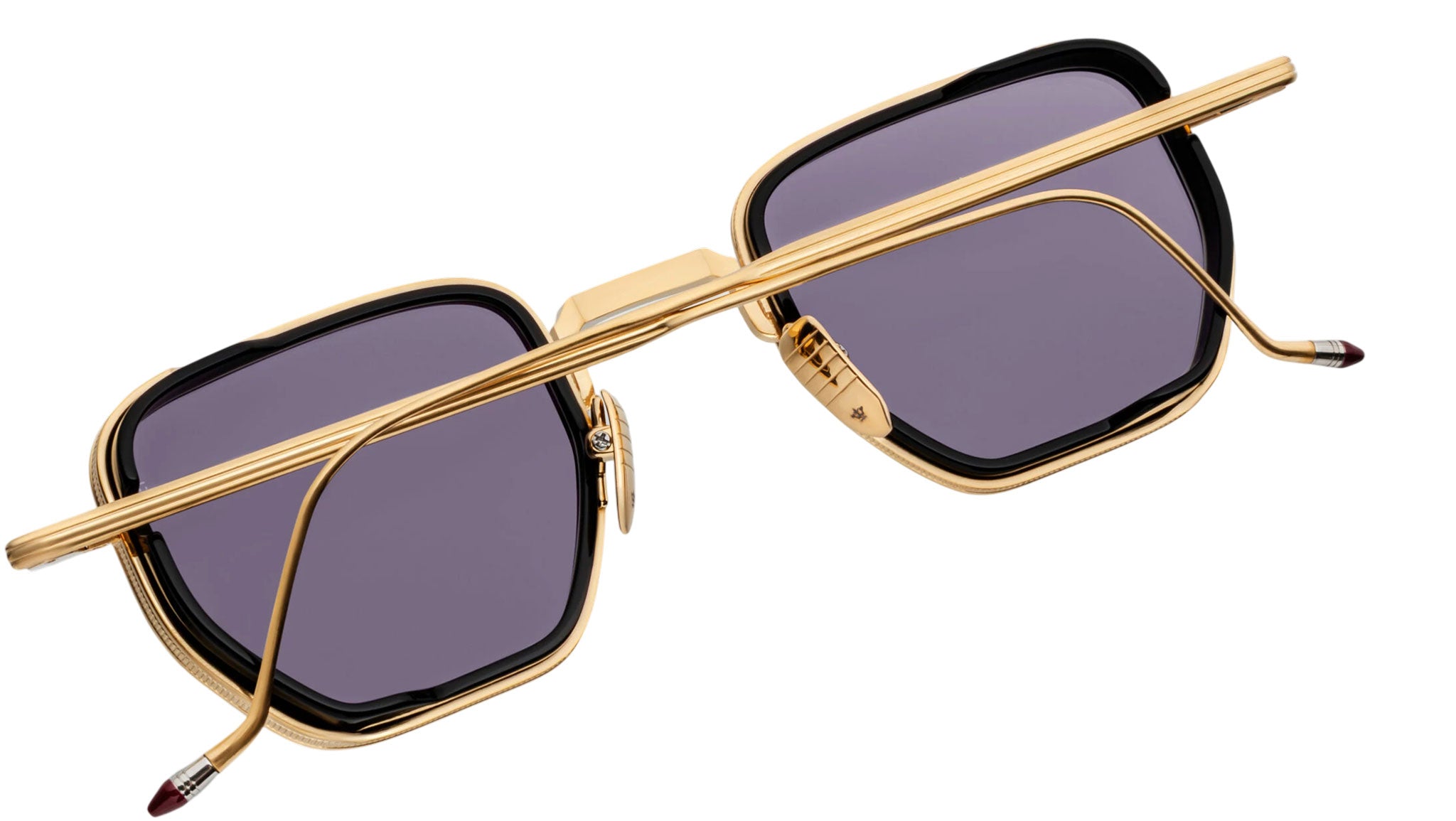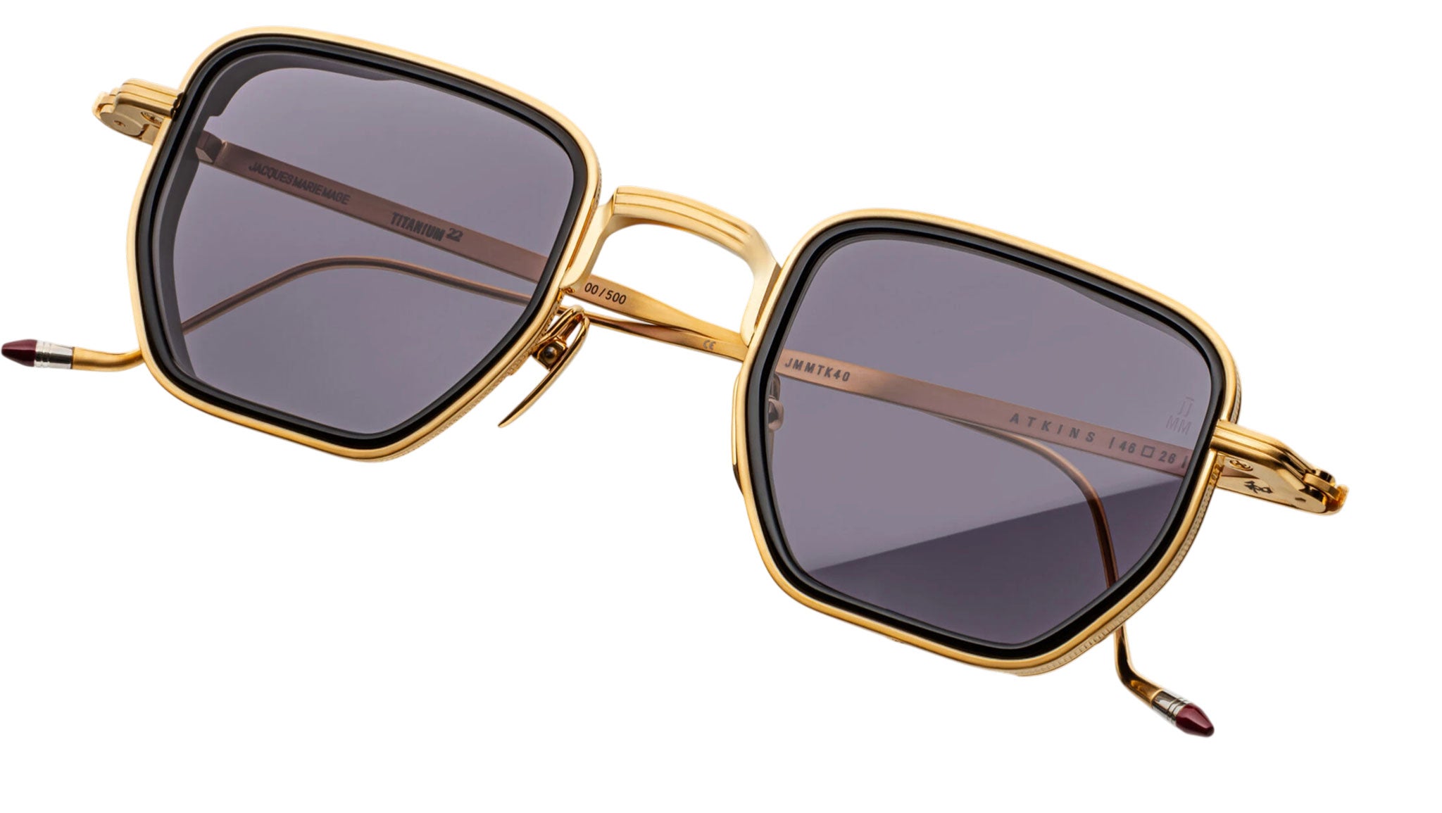 The Jacques Marie Mage Atkins presents a subtle angular lens shape distinguished by a 10mm cured acetate insert, grooved temple profiles, and sculptural tailfin temple tips that introduce additional curves and volume. A tempered combination of technical precision and material presence, this refined design channels understated confidence with a touch of cultural boldness. Balancing structural clarity with expressive detailing, the Atkins embodies a composed yet characterful silhouette crafted for modern legends in the making.