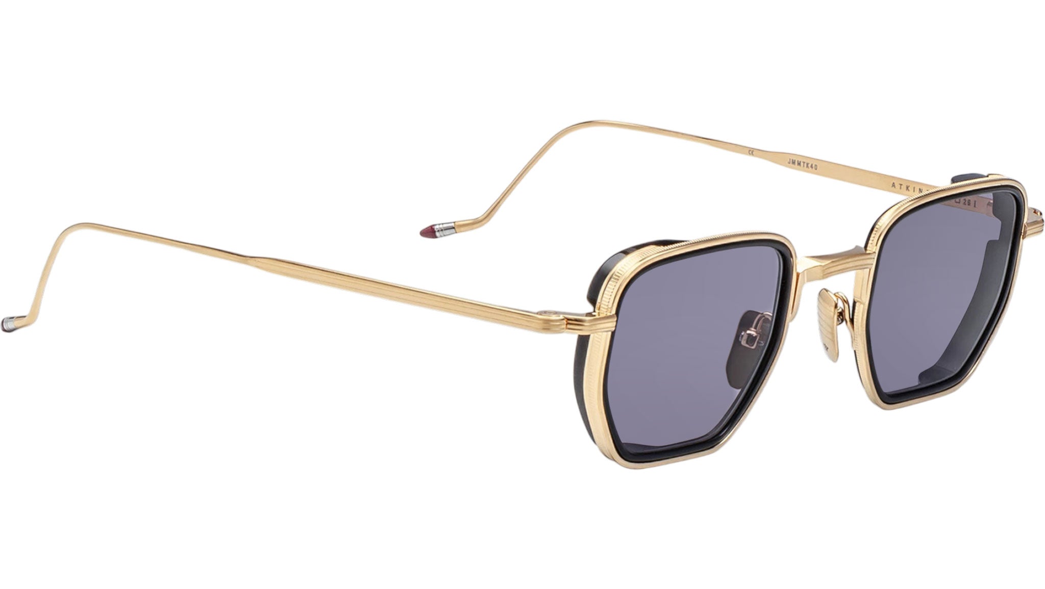 Gold 100% titanium frame with grey lenses, custom gold hairline hinge and burgundy epoxy temple tips, black acetate eyerim insert, custom nose pads with logo and hairline engraving, grey gradient CR-39 2-base lenses with backside anti-reflective treatment.
