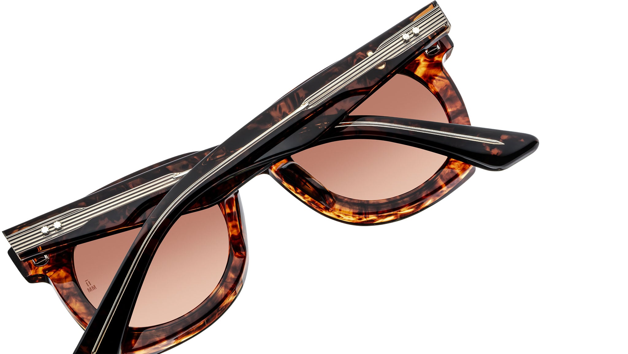 Havana 10mm cured cellulose acetate frame with custom double-laminated acetate temples featuring precious metal hardware and brown lenses, sterling silver double-arrowhead front pin, exposed sterling silver lever wirecore, sterling silver tension-secured custom ball hinge, sienna CR-39 4-base lenses with backside anti-reflective treatment.
