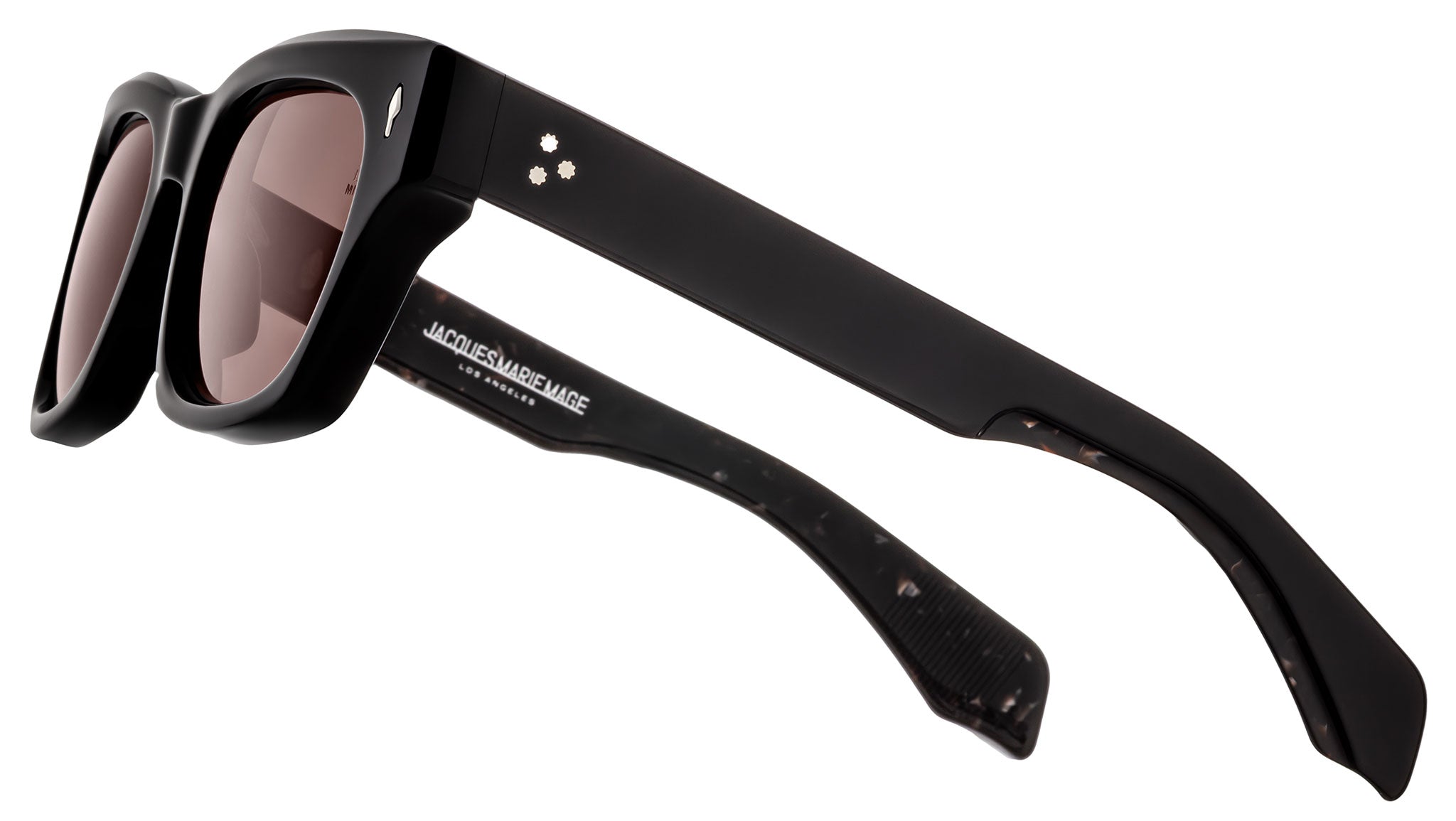 Black 10mm cured cellulose acetate frame with custom double-laminated acetate temples featuring precious metal hardware, sterling silver signature arrowhead front pin, hidden wirecore, tension-secured custom 7-barrel hinge, silver domed 3D metal cameo logo, deep brown CR-39 6-base lenses with backside anti-reflective treatment.