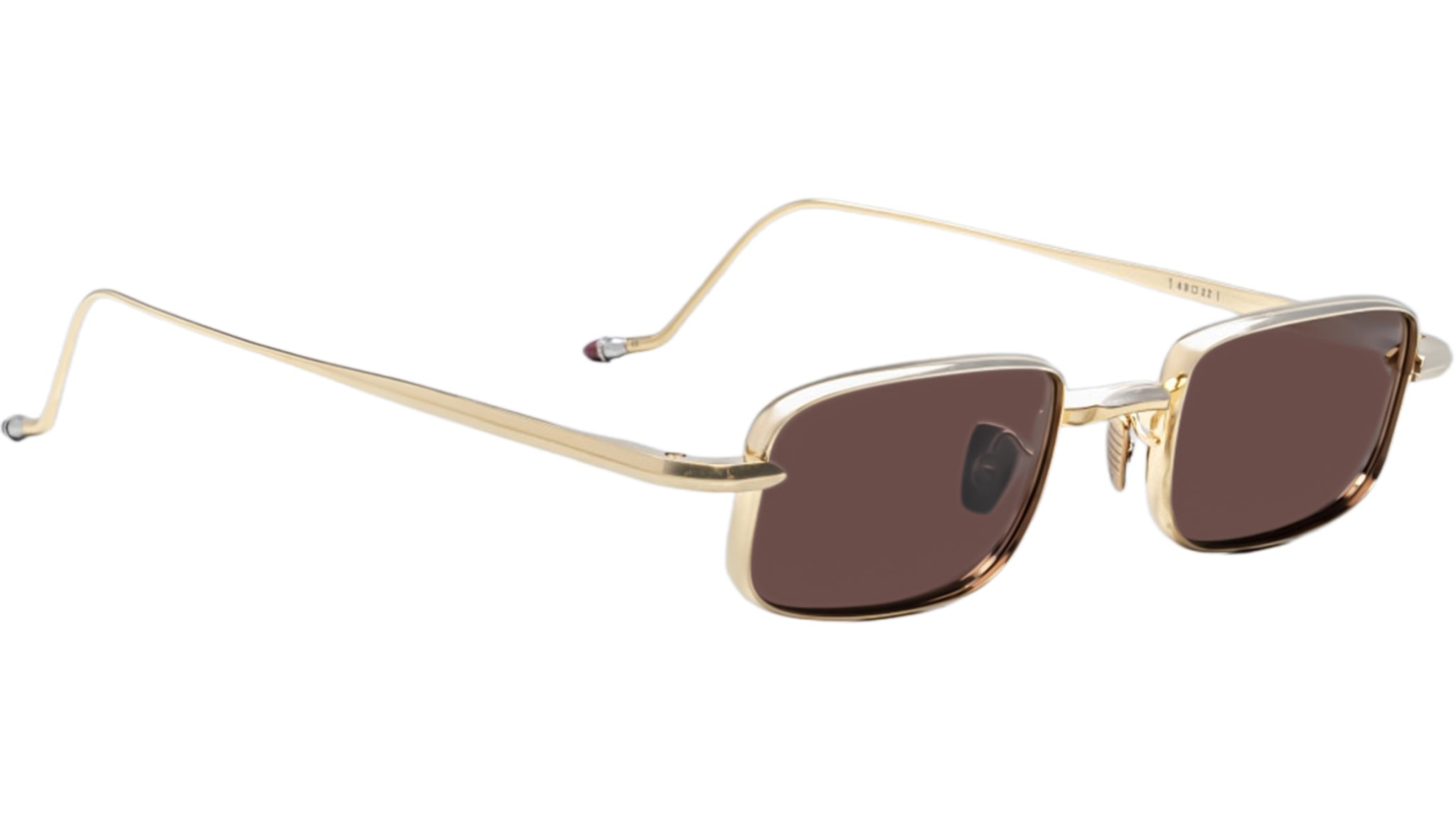 Crafted from 100% beta titanium in an elegant Moon Gold finish, this frame features Moon Gold titanium temples with burgundy epoxy tips and a Moon Gold tension-secured custom hidden hinge for a seamless design and enduring precision. Custom nose pads with logo and hairline engraving ensure comfort and refined detailing. Choco CR-39 4 base lenses provide optical clarity, a backside anti-reflective treatment, and 100% UV protection.