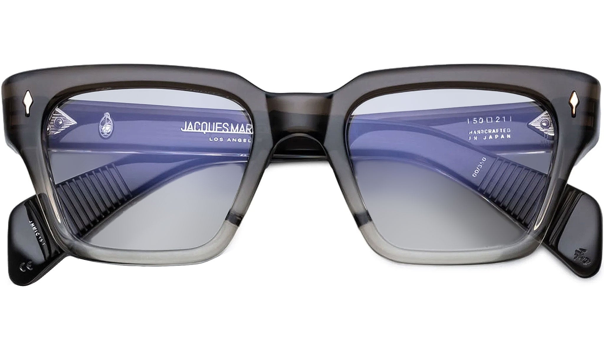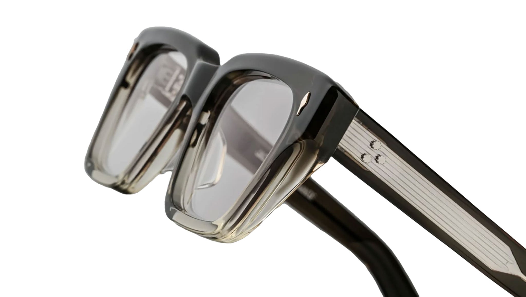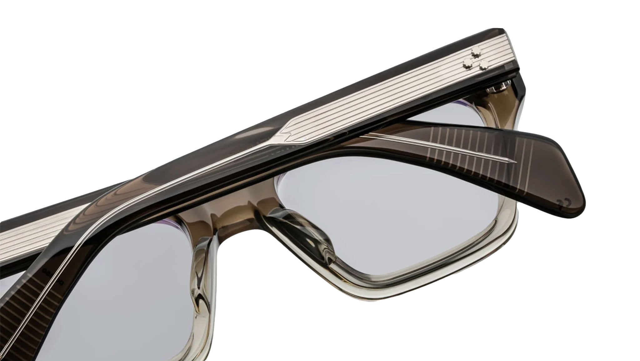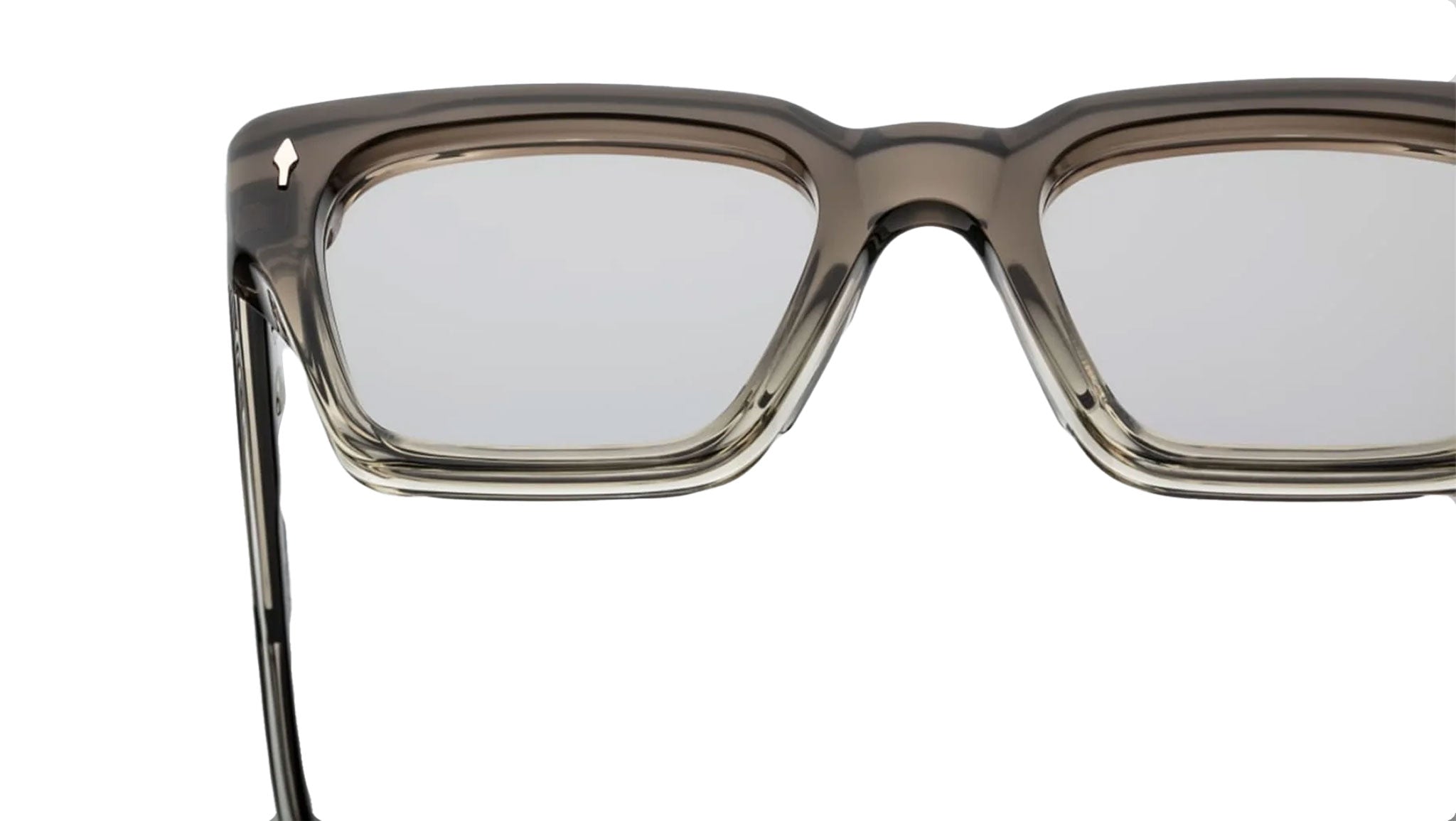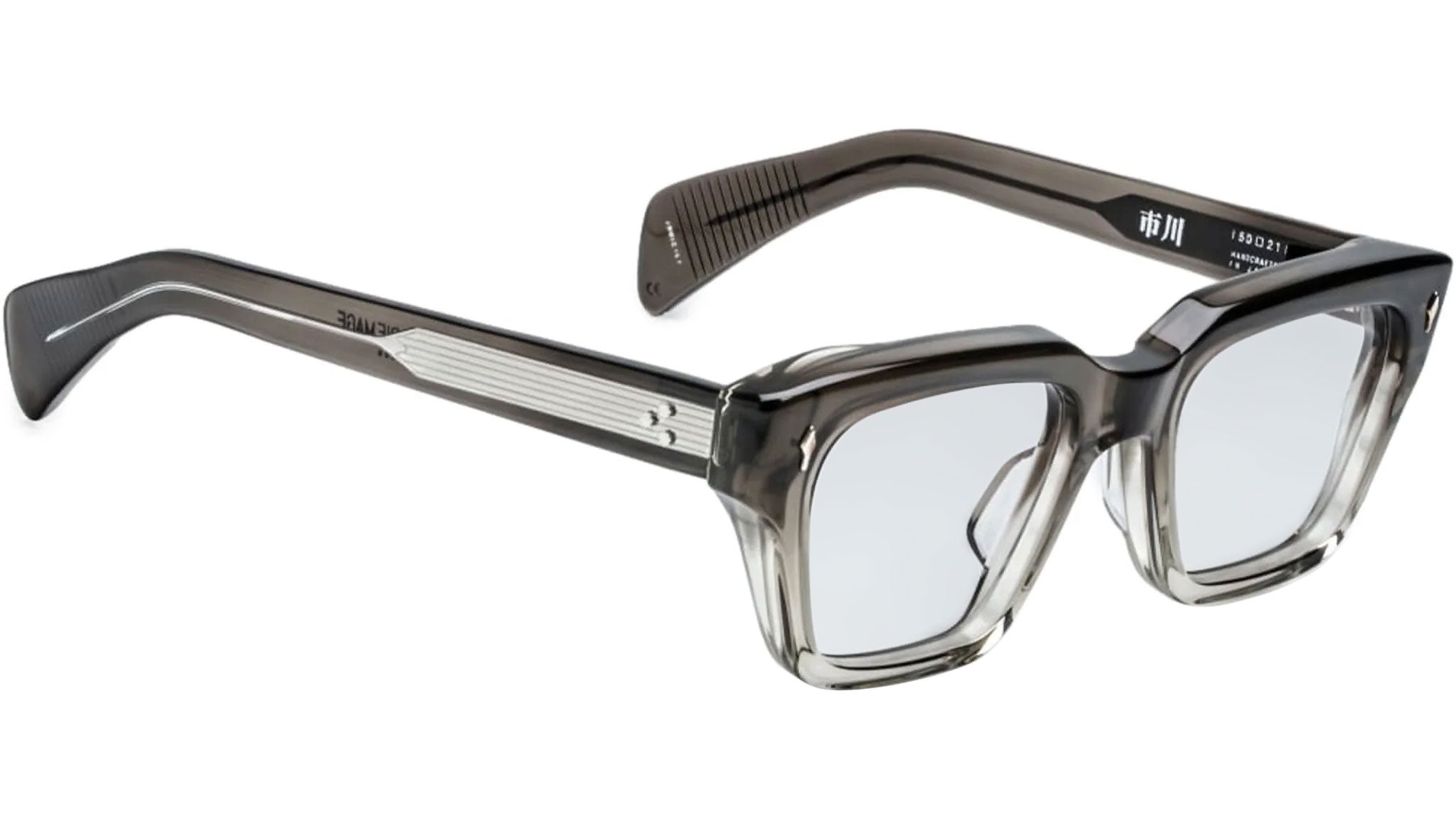 Curated 10mm smoke fade grey acetate frame. Custom double laminated acetate temples featuring precious metal hardware in sterling silver.