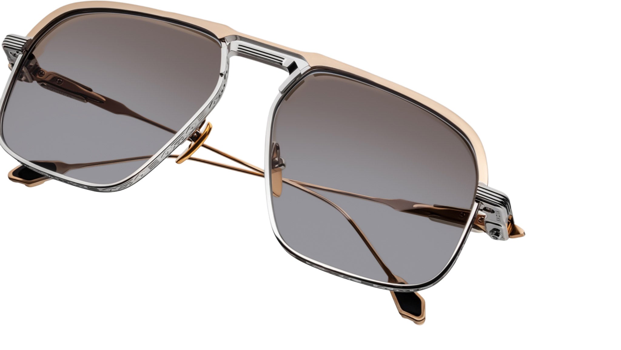 100% beta titanium frame in silver and gold with grey gradient lenses. Dark gold beta titanium temples. Sterling silver arrowhead and 18k gold-plated thunderbird cameos with turquoise inlays. Silver tension-secured custom monoblock hinge. Silver Chimayo-engraved eye rims. Dark gold top bar. Custom nose pads with logo and hairline engraving. Fumo gradient CR-39 4 base lenses with backside anti-reflective treatment and 100% UV protection.