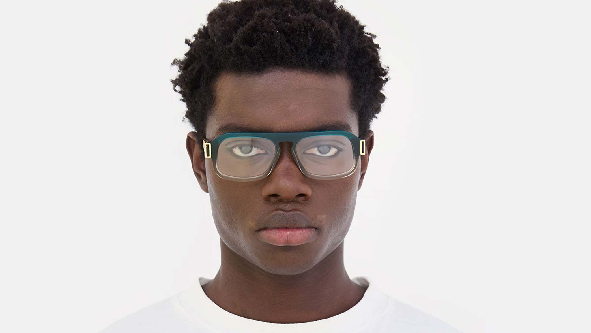 Designed exclusively for Marni, Burullus is a playful, eclectic 1970s shape characterised by a sturdy yet oversized frontal piece and unique metal temples. The model features a bold nose-bridge and wide squared lenses, with a custom-designed Marni décor joining the front and temples. A lightweight metal construction for the temples counterbalances the thick acetate front for this green fading frame with gold metal temples. Sizes: R Lens Width: 55 mm. Frame Front: Frame Side: 140 mm. Product Code Size R: GFY
