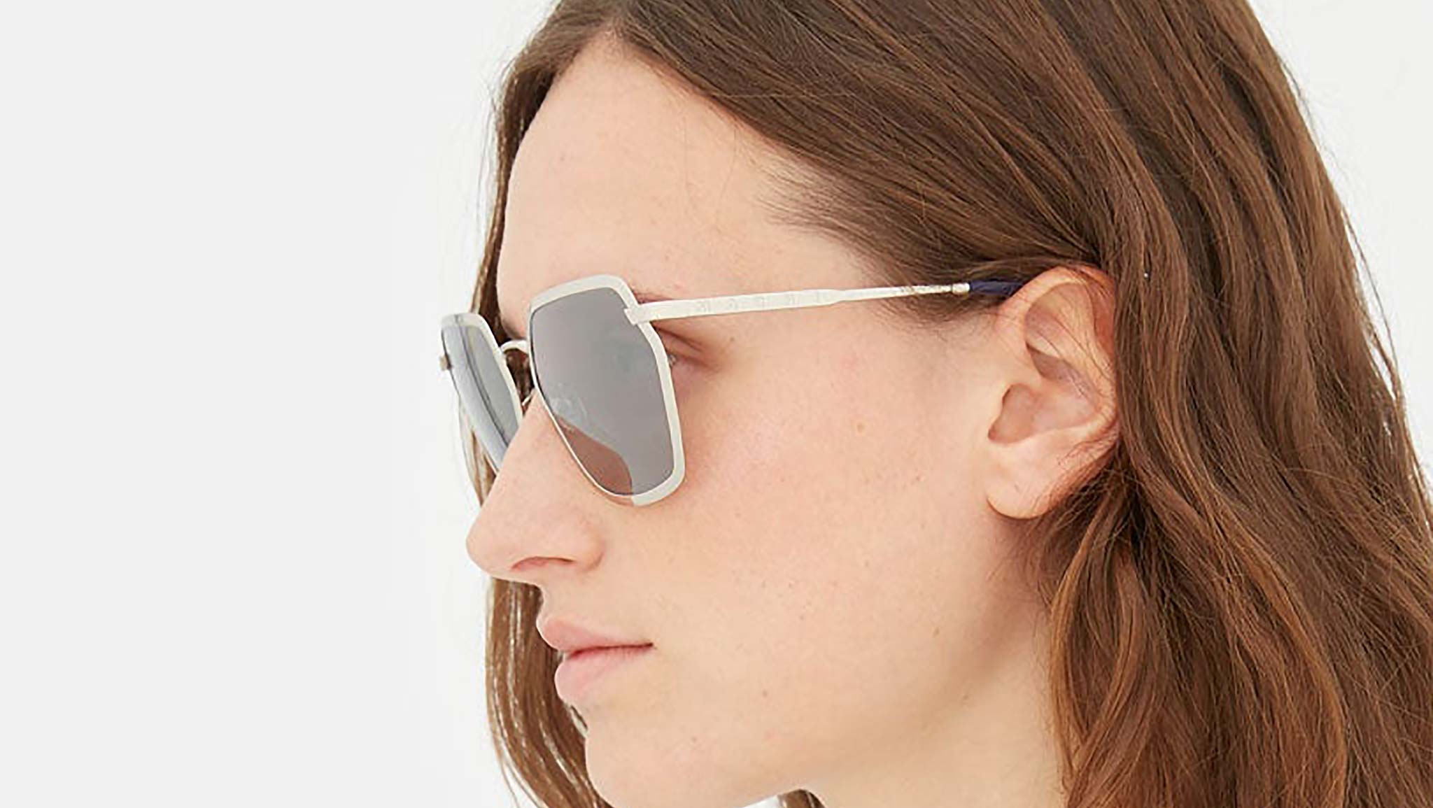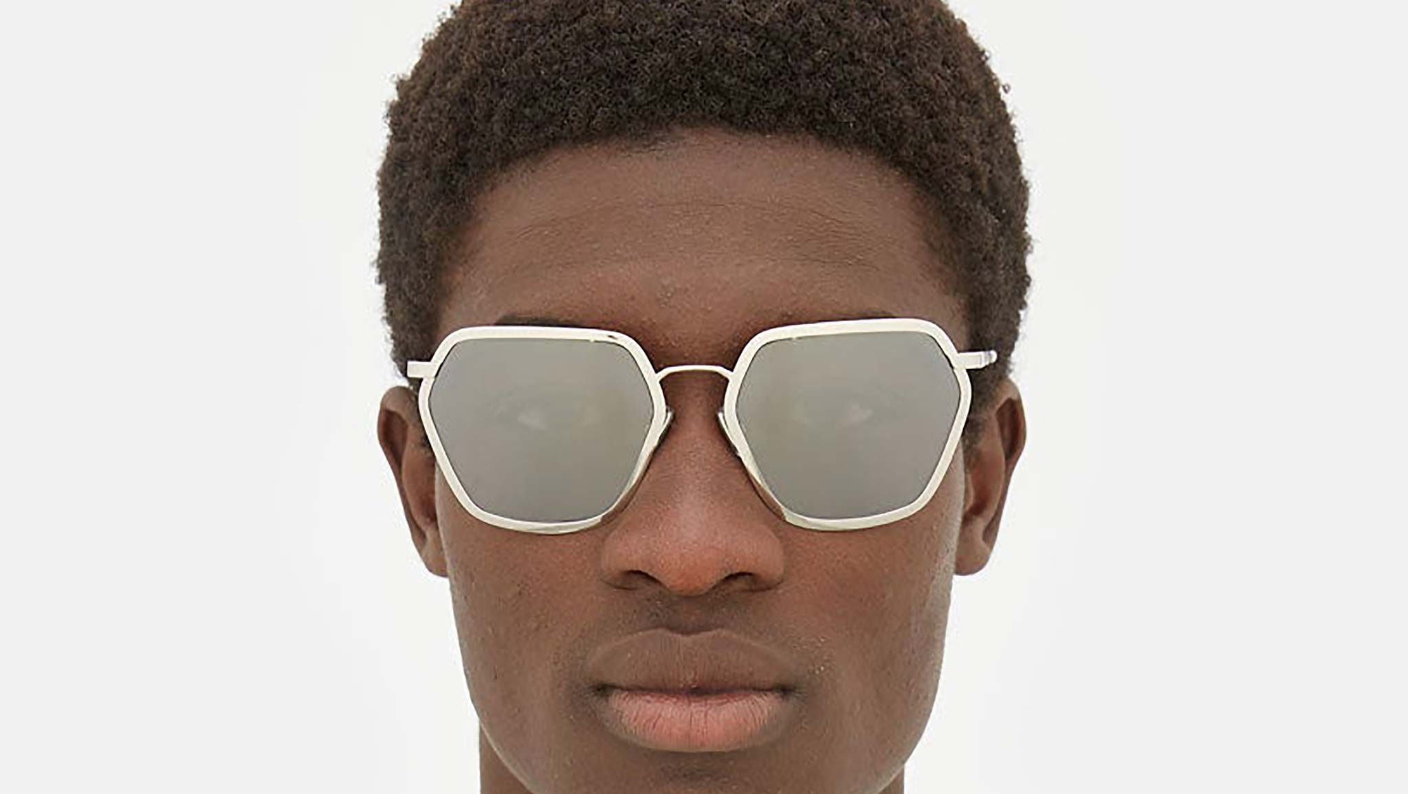 Designed exclusively for Marni, Great Noligwa Mine is a sophisticated metal silhouette characterised by an unexpected geometric shape and appealing oversized fit. It was inspired by a timeless vintage aesthetics, adapted for a contemporary style with a sharper, more streamlined design. The model’s distinctive lenses feature an asymmetrical hexagonal shape, encased within thick metal rims. A curved nose-bridge and sleek temples complete the piece. This model comes with a shiny silver metal finish and light tinted grey lenses. Sizes: R Lens Width: 59 mm. Frame Front: Frame Side: 145 mm. Product Code Size R: EQ2