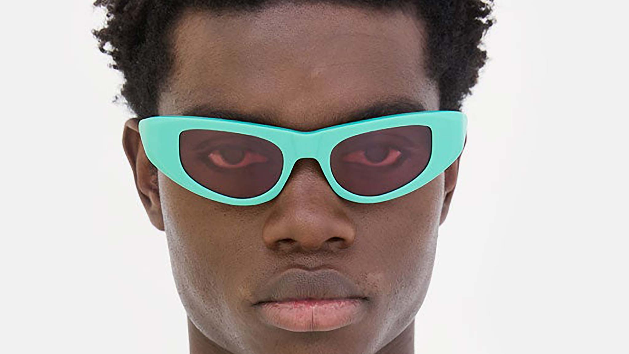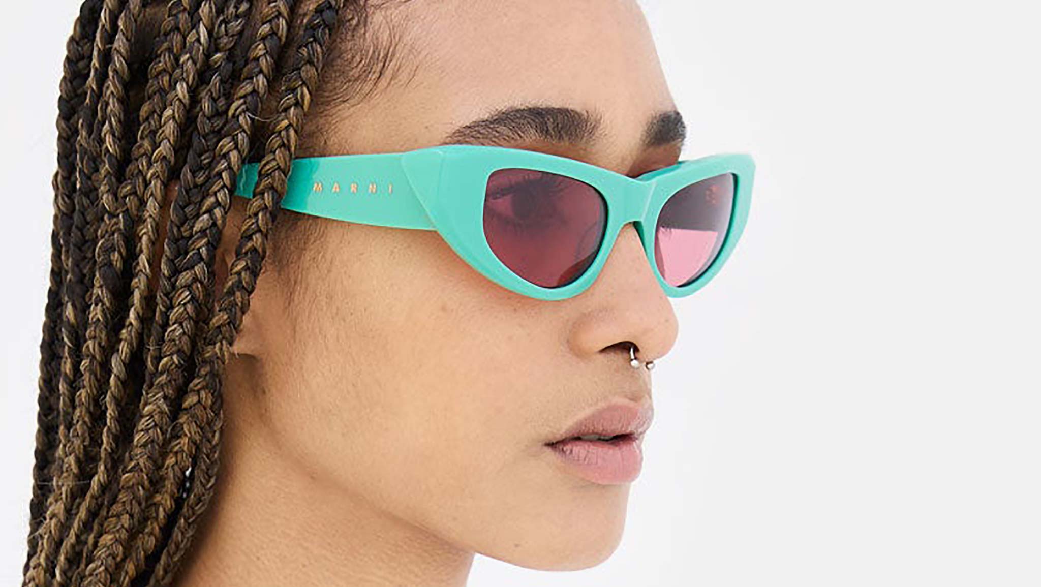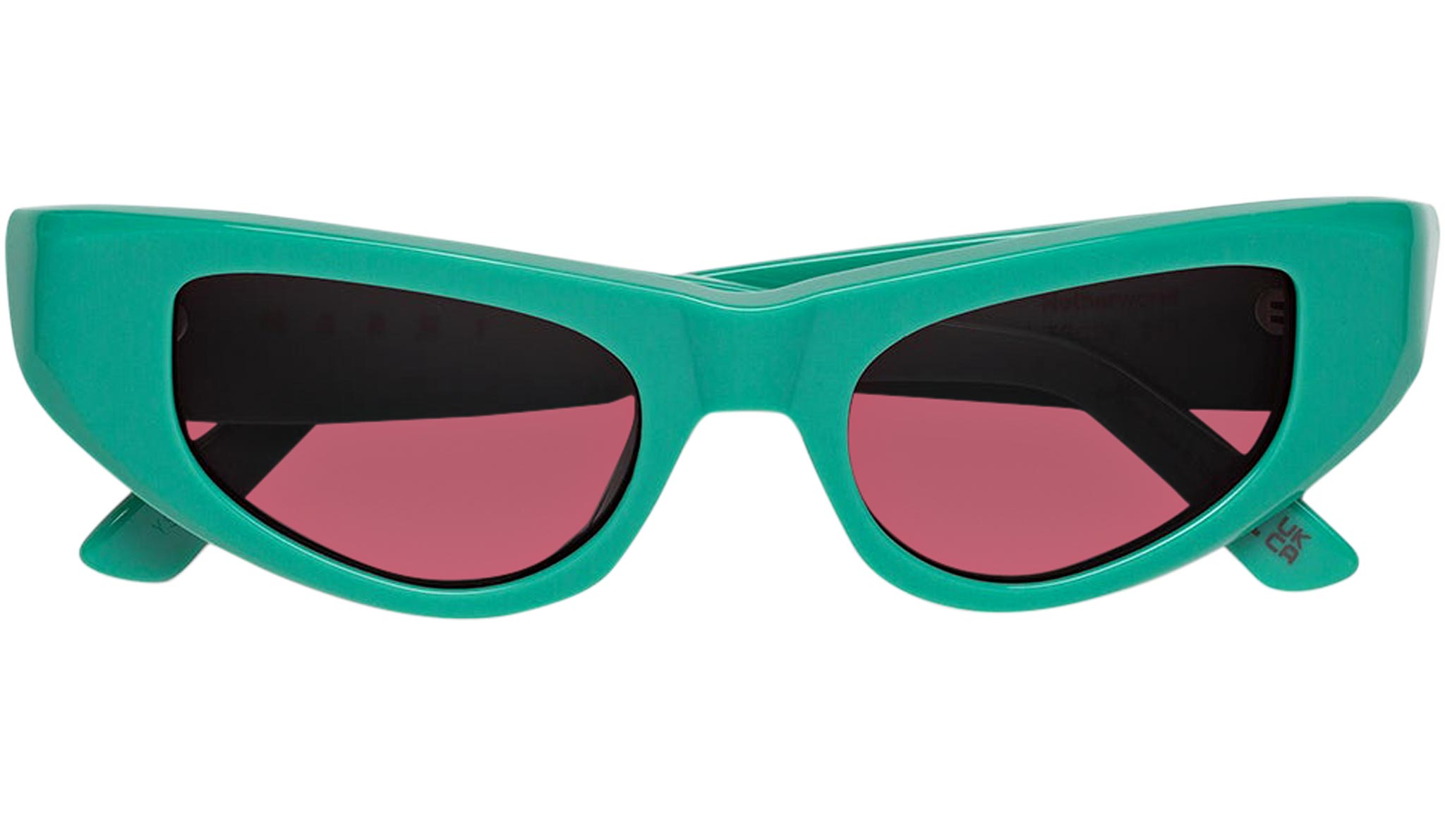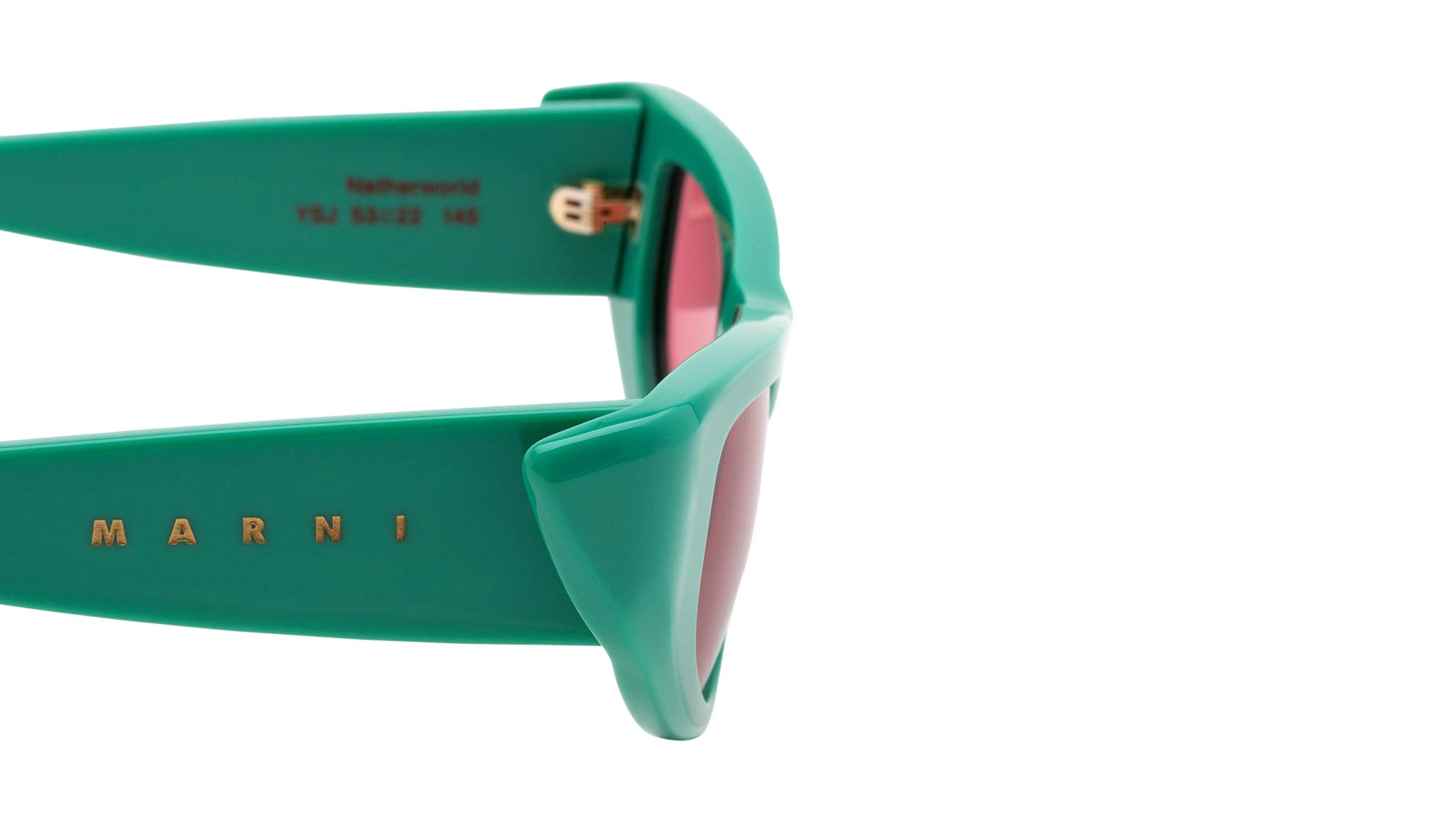 Designed exclusively for Marni, Netherworld is a bold frame characterised by sharp angles and precise geometries. The model features slanted lenses encased within thick acetate rims, curved around the temples to form a triangular décor on the sides. Thick acetate temples match the overall compact, sturdy and slightly serious character of the frame. This version comes in playful teal acetate with pink tinted lenses and gold detailing. Sizes: R Lens Width: 53 mm. Frame Front: Frame Side: 145 mm. Product Code Size R: YSJ