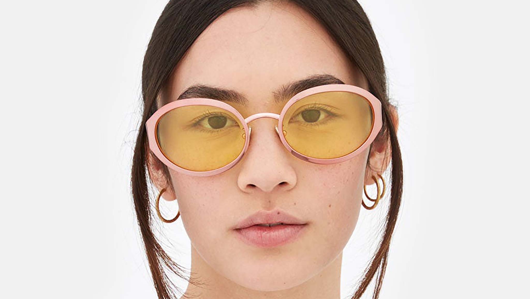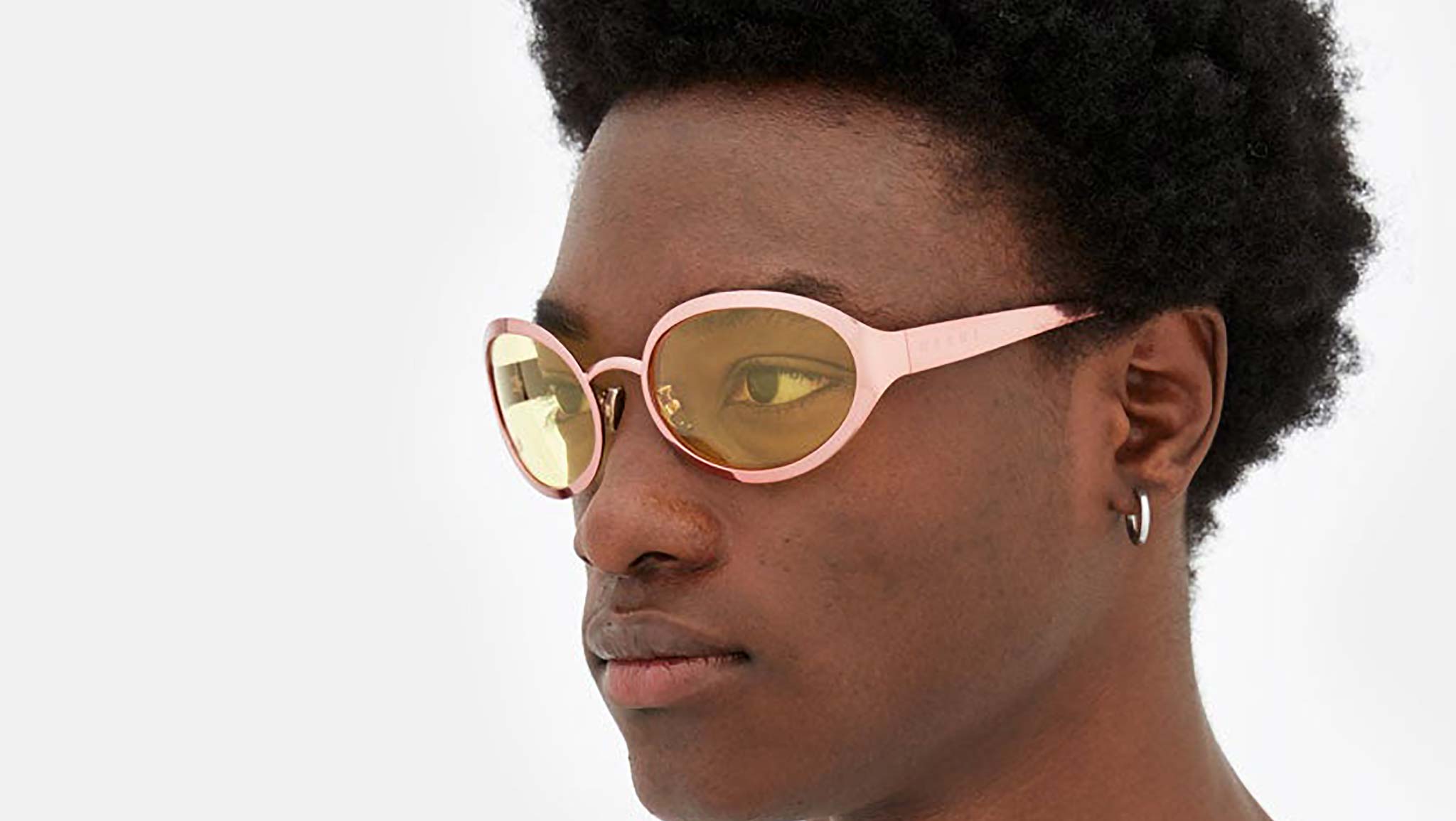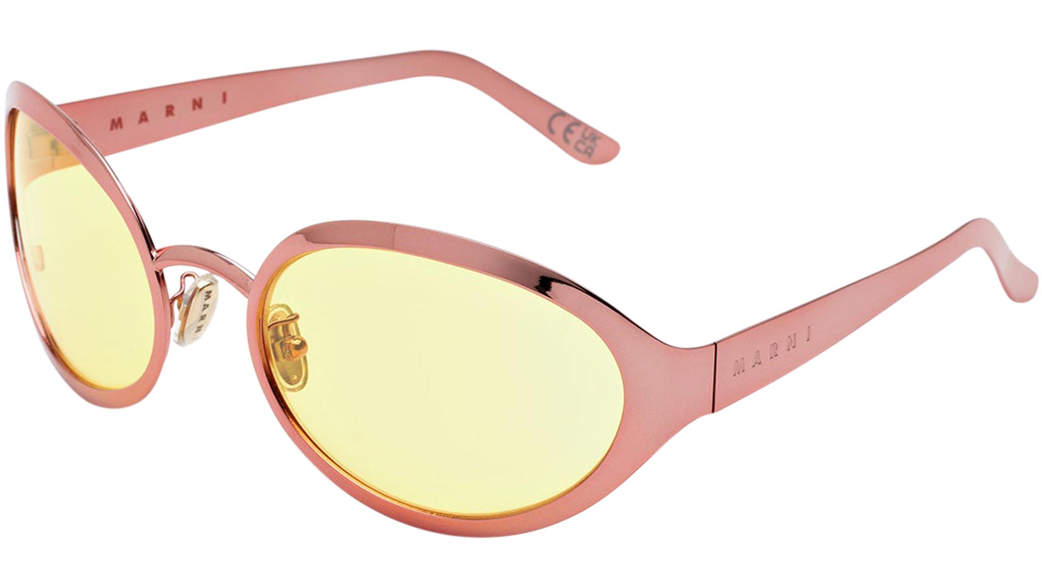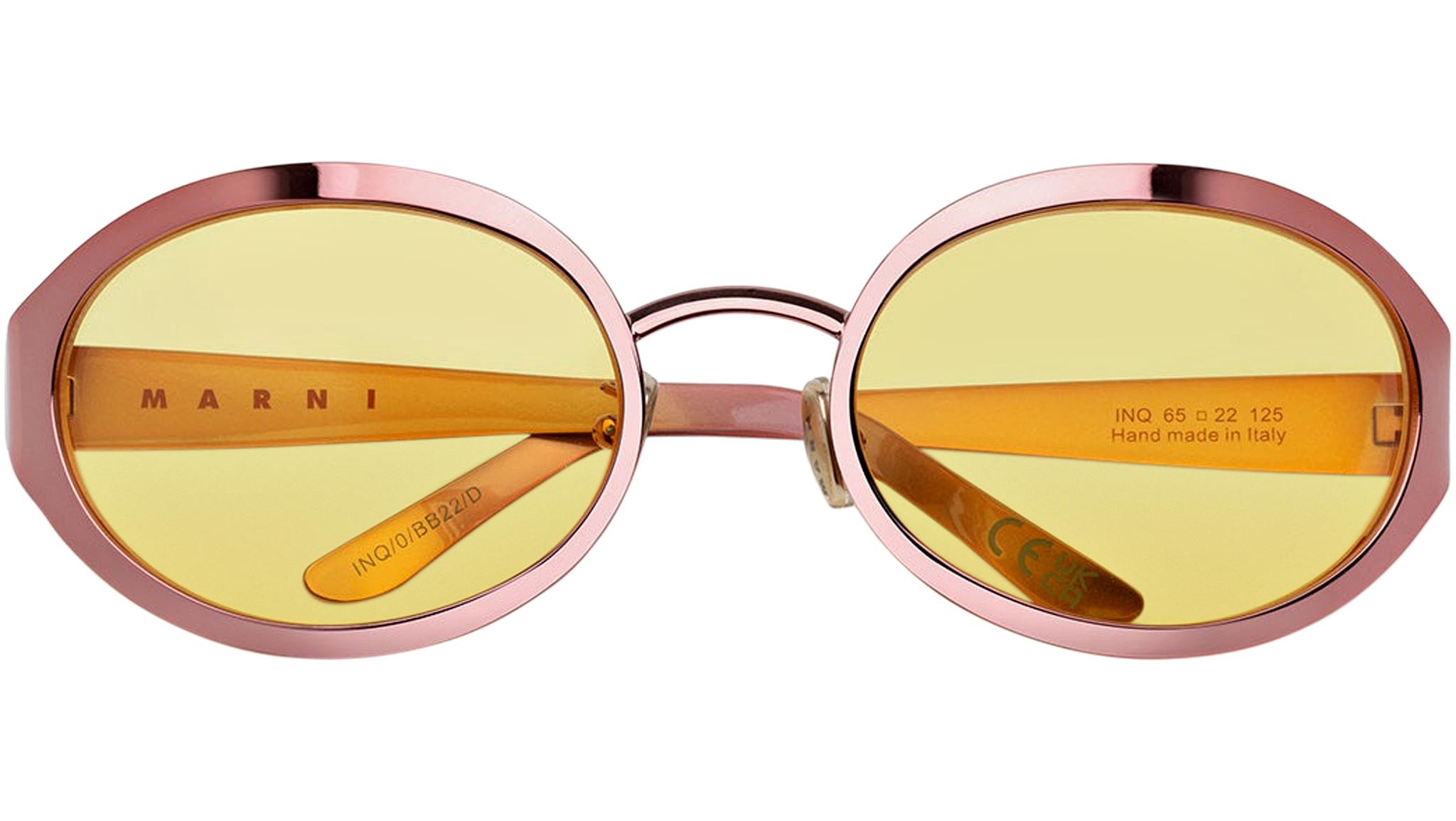 Designed exclusively for Marni, To-Sua is an innovative shape that welcomes the return of metal frames. An oversized design, To-Sua revisits the classic oval frames with a fresh sportswear-inspired approach. Lightweight and ultra-chromed metal rims have been moulded to form a wrap-around shape, for a quirky and unexpected piece of eyewear that merges high-tech design with contemporary style. This model is available in a bronze metallic finish and wrap-around yellow lenses. Sizes: R Lens Width: 65 mm. Frame Front: Frame Side: 125 mm. Product Code Size R: INQ