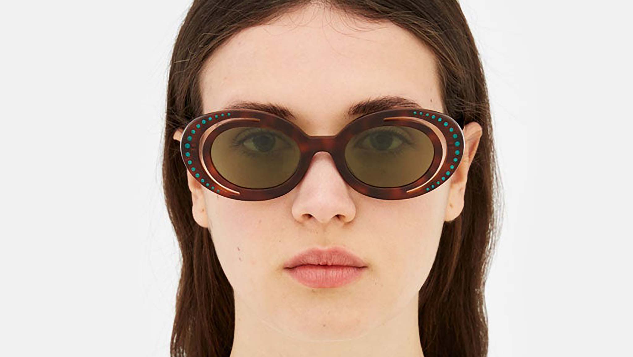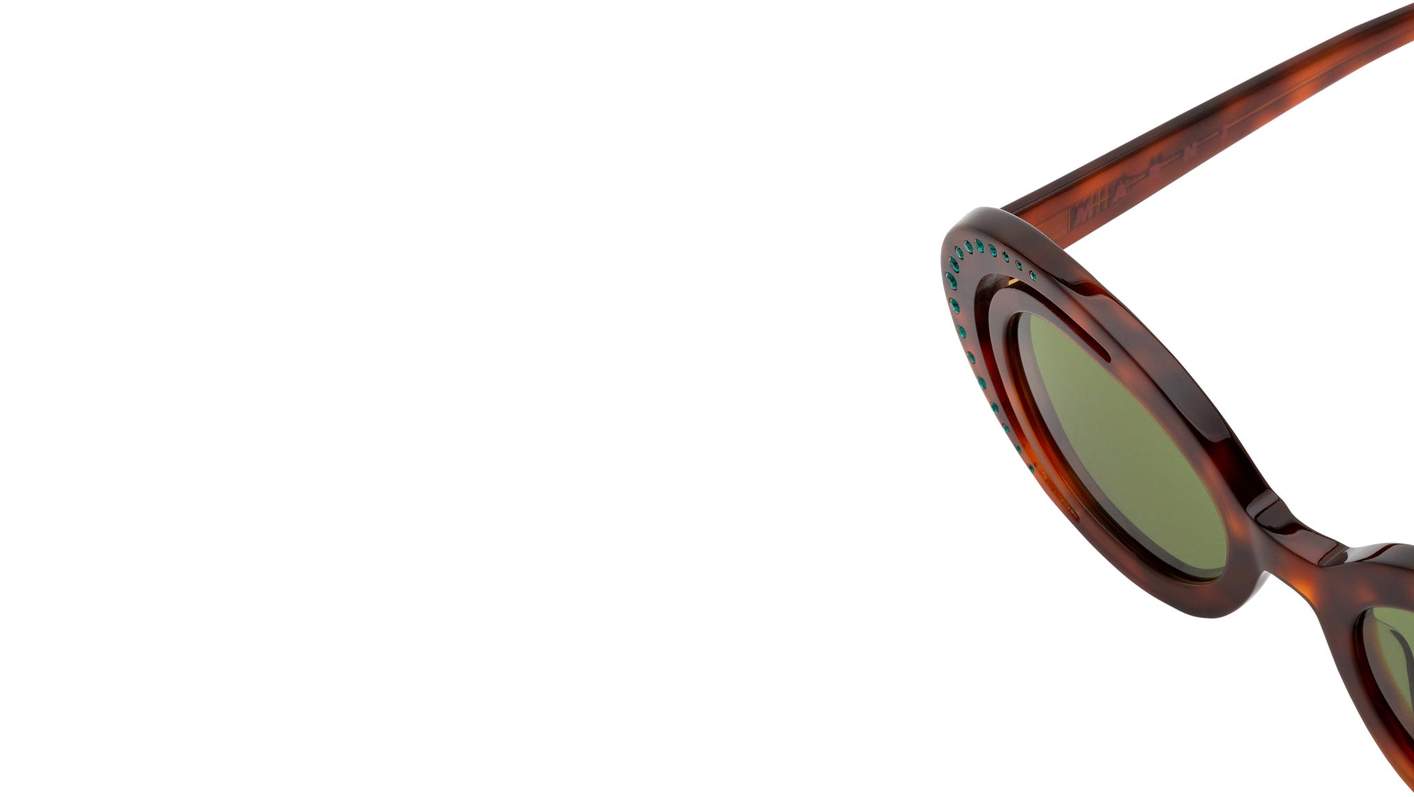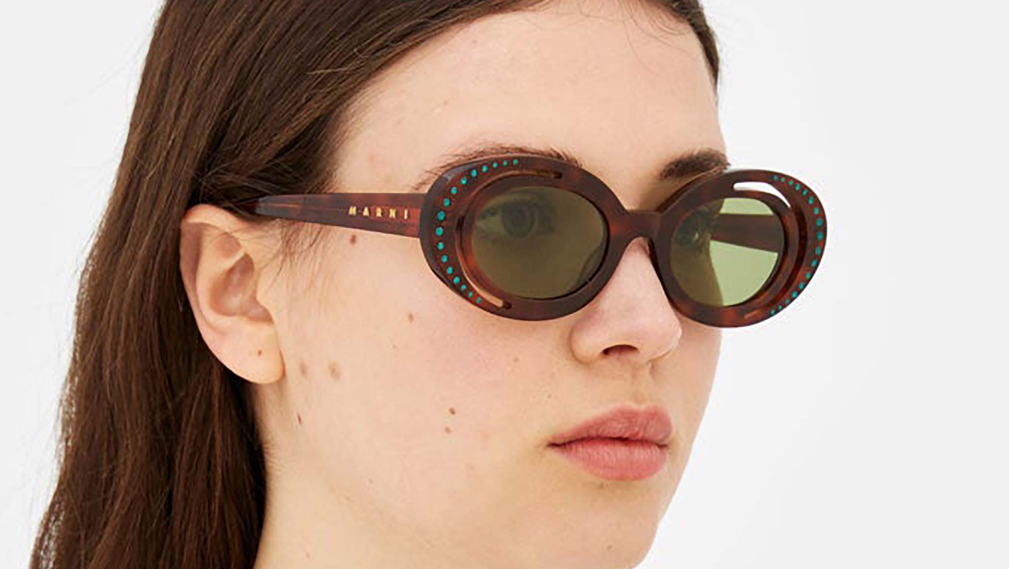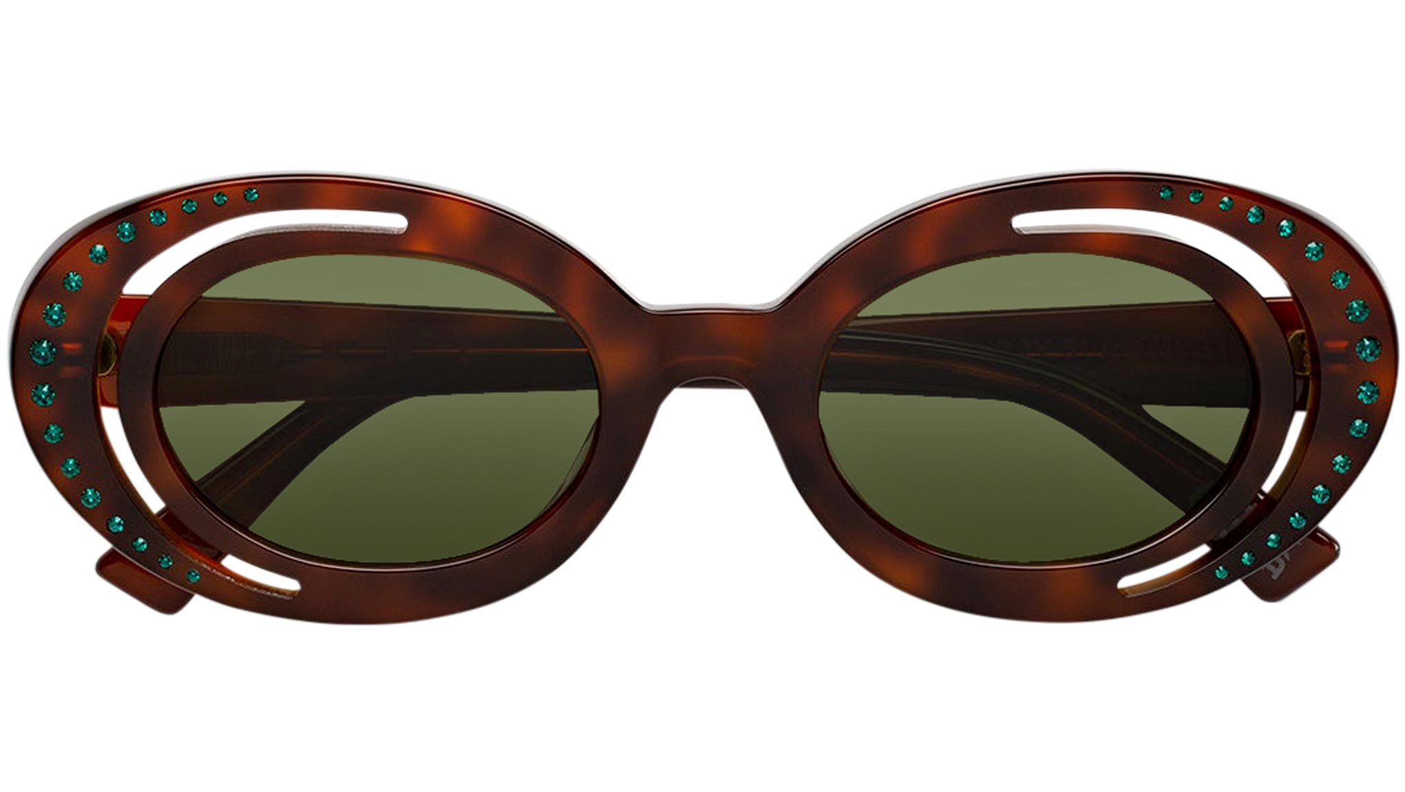 Designed exclusively for Marni, Zion Canyon is a unique silhouette characterised by an innovative, unexpected design and construction that elevates the oval frame. The model’s curvaceous and space-like rims have been completely carved out to form a half-moon shape on the outer edge. Sophisticated gems encased within the external acetate rings further elevate the piece’s shape while showcasing exceptional craftmanship and know-how of the made in Italy. This model is available in a warm Havana acetate with bottle green lenses. Sizes: R Lens Width: 51 mm. Frame Front: Frame Side: 145 mm. Product Code Size R: O2Y