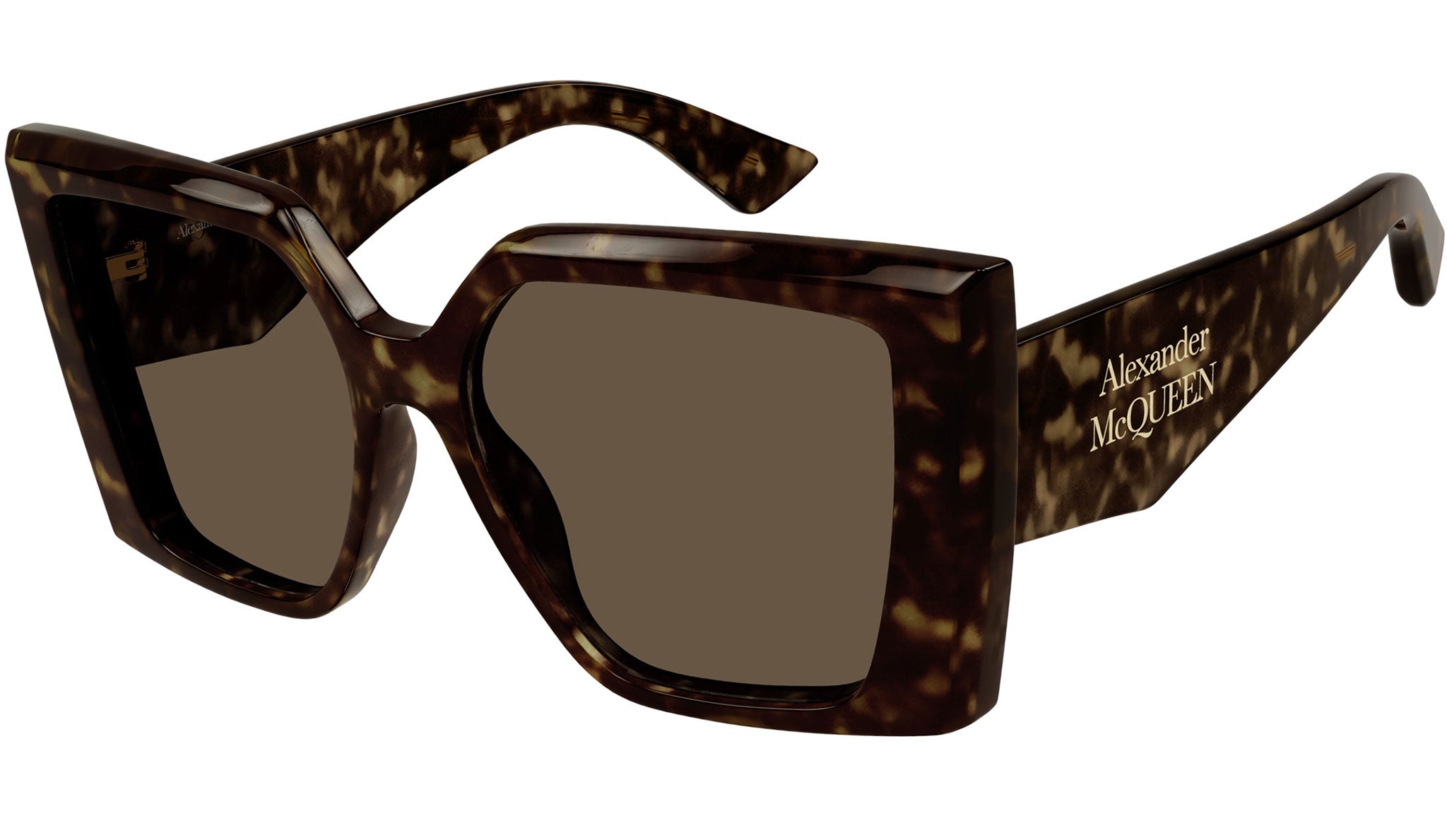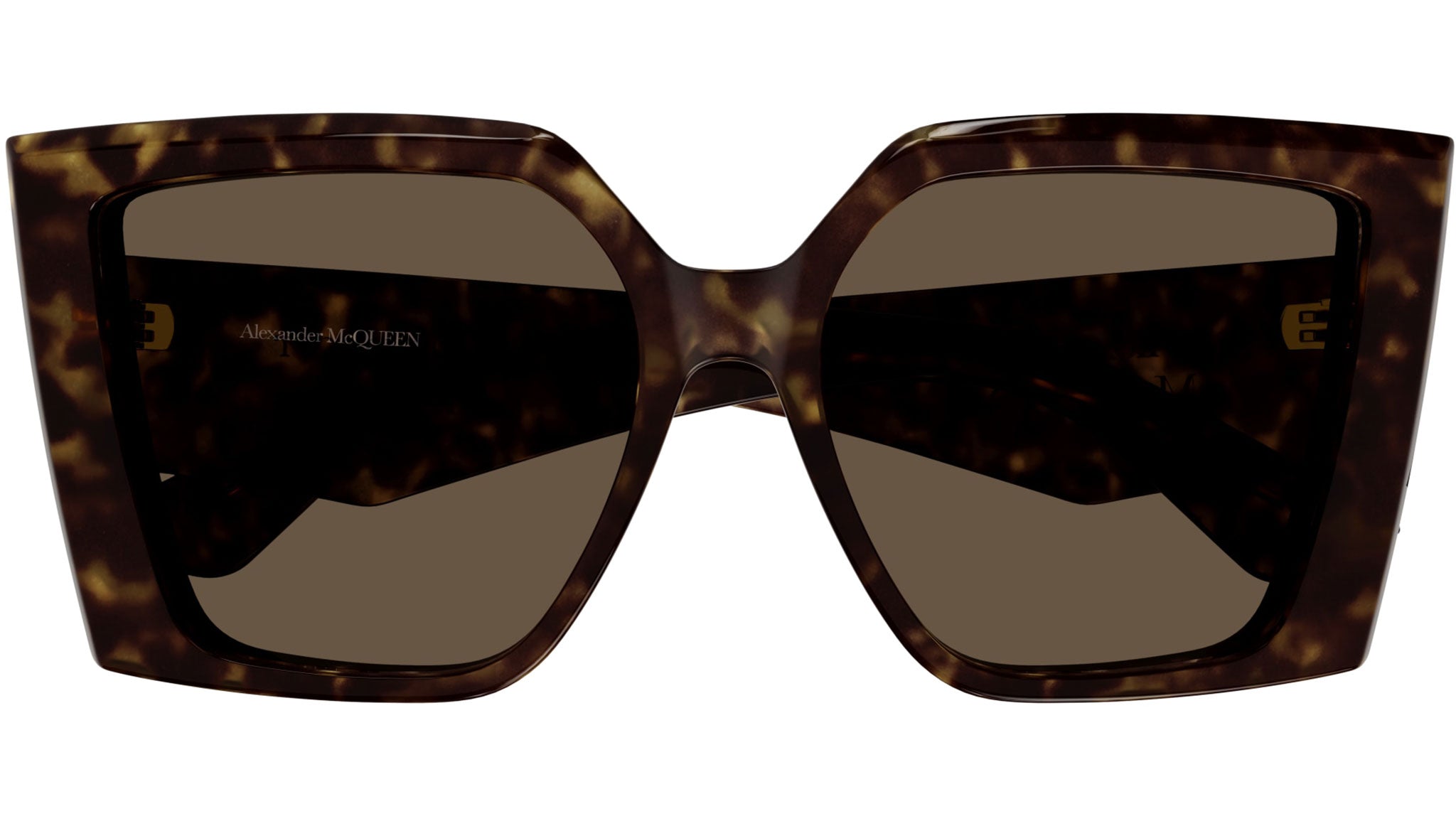 Occhiali da sole Alexander McQueen Casual Lines modello AM0467S in acetato riciclato rettangolare, codice colore 002 tartaruga scuro lucido con aste tartaruga e lenti color marrone tinta unita. Rivenditore autorizzato Alexander McQueen online. Gli occhiali vengono consegnati con custodia e accessori originali e sono coperti dalla garanzia ufficiale di 12 mesi del produttore.