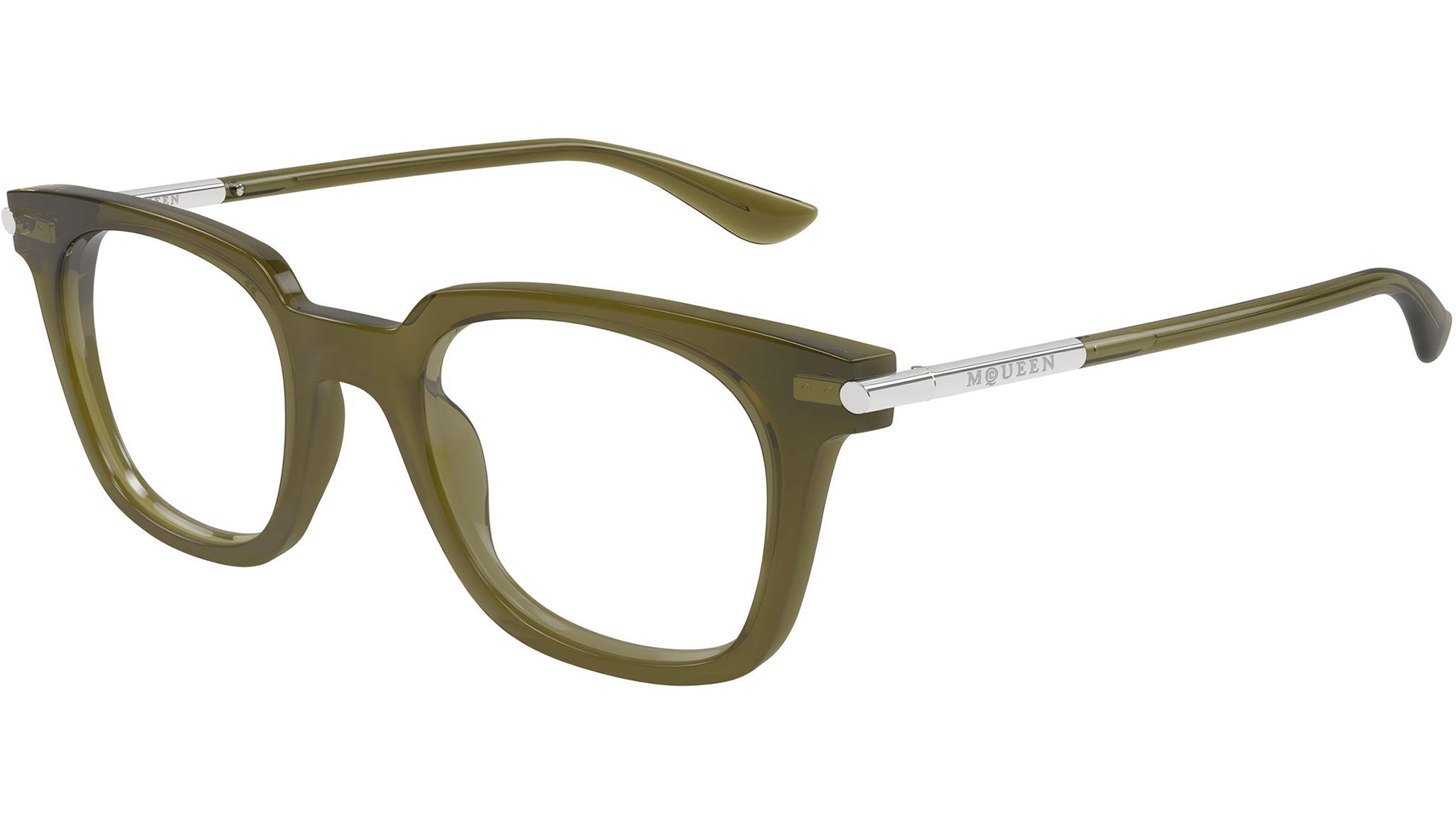 Occhiali da sole Alexander McQueen T-Bar modello AM0521O in acetato riciclato rettangolari codice colore 004 verde trasparente lucido con aste argento e lenti color lenti demo. Rivenditore autorizzato Alexander McQueen online. Gli occhiali vengono consegnati con custodia e accessori originali e sono coperti dalla garanzia ufficiale di 12 mesi del produttore.