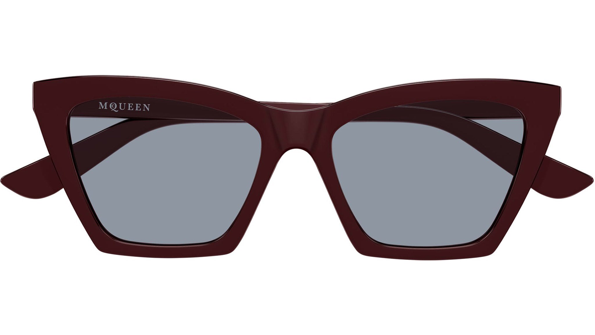 Occhiali da sole Alexander McQueen Logo modello AM0536S in acetato riciclato cat eye codice colore 004 bordeaux intenso lucido con aste rosso e lenti color azzurro tinta unita. Rivenditore autorizzato Alexander McQueen online. Gli occhiali vengono consegnati con custodia e accessori originali e sono coperti dalla garanzia ufficiale di 12 mesi del produttore.