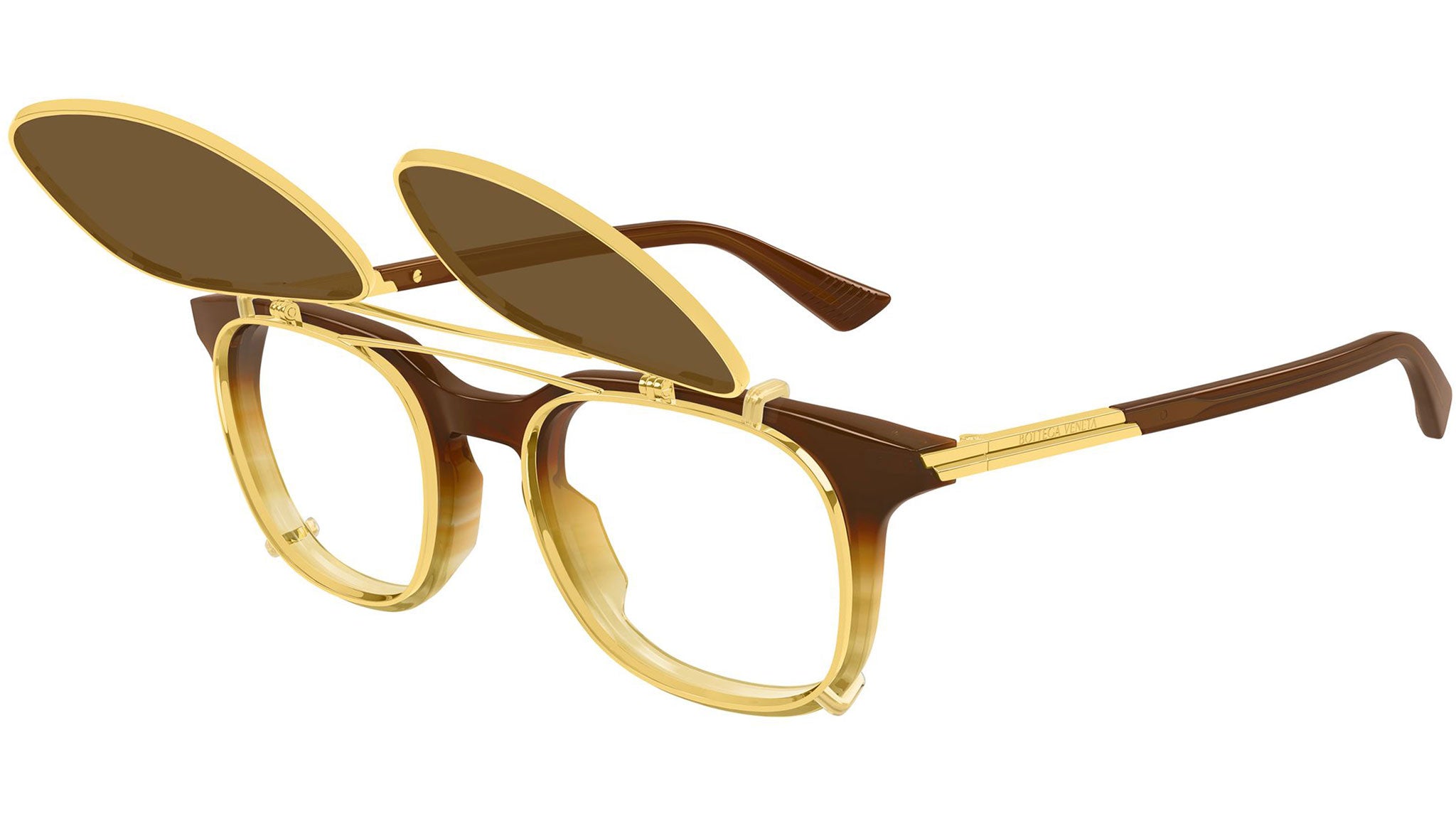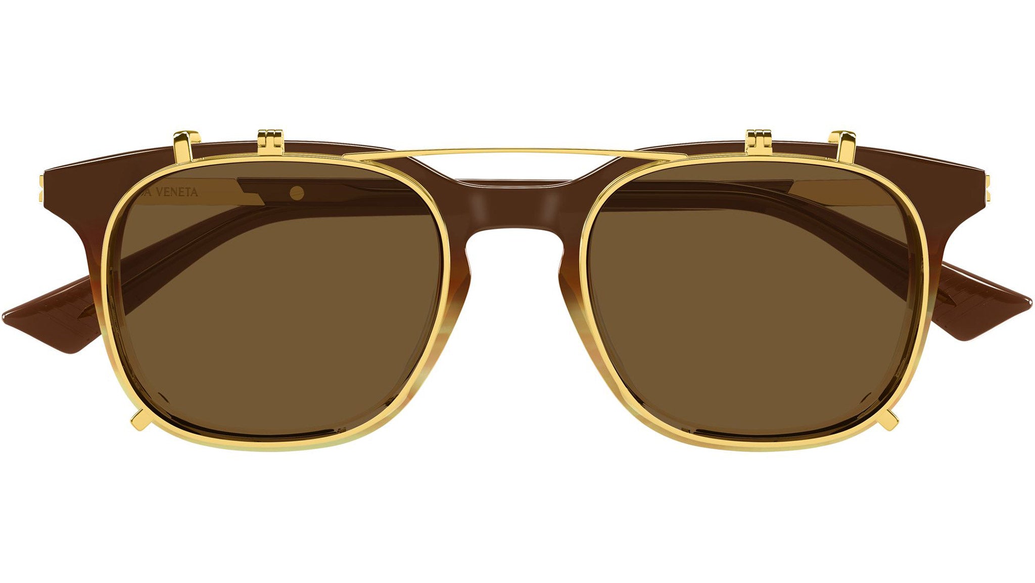 Occhiali da sole Bottega Veneta BV1429S 002 uomo con montatura rettangolare in acetato riciclato marrone mélange trasparente lucido sfumato a giallo miele e lenti trasparenti con clip-on marrone nincotine. Linea: Ribbon. Codice modello: BV1429S. Codice colore: 002. Made in Italy. Rivenditore autorizzato Bottega Veneta online. Gli occhiali vengono consegnati con custodia e accessori originali e sono coperti dalla garanzia ufficiale di 12 mesi del produttore.