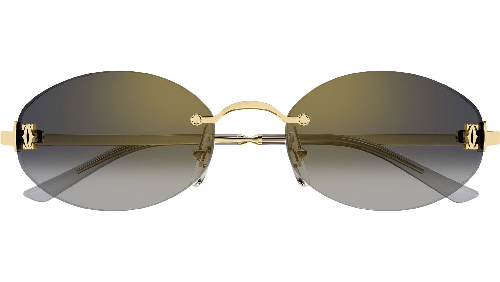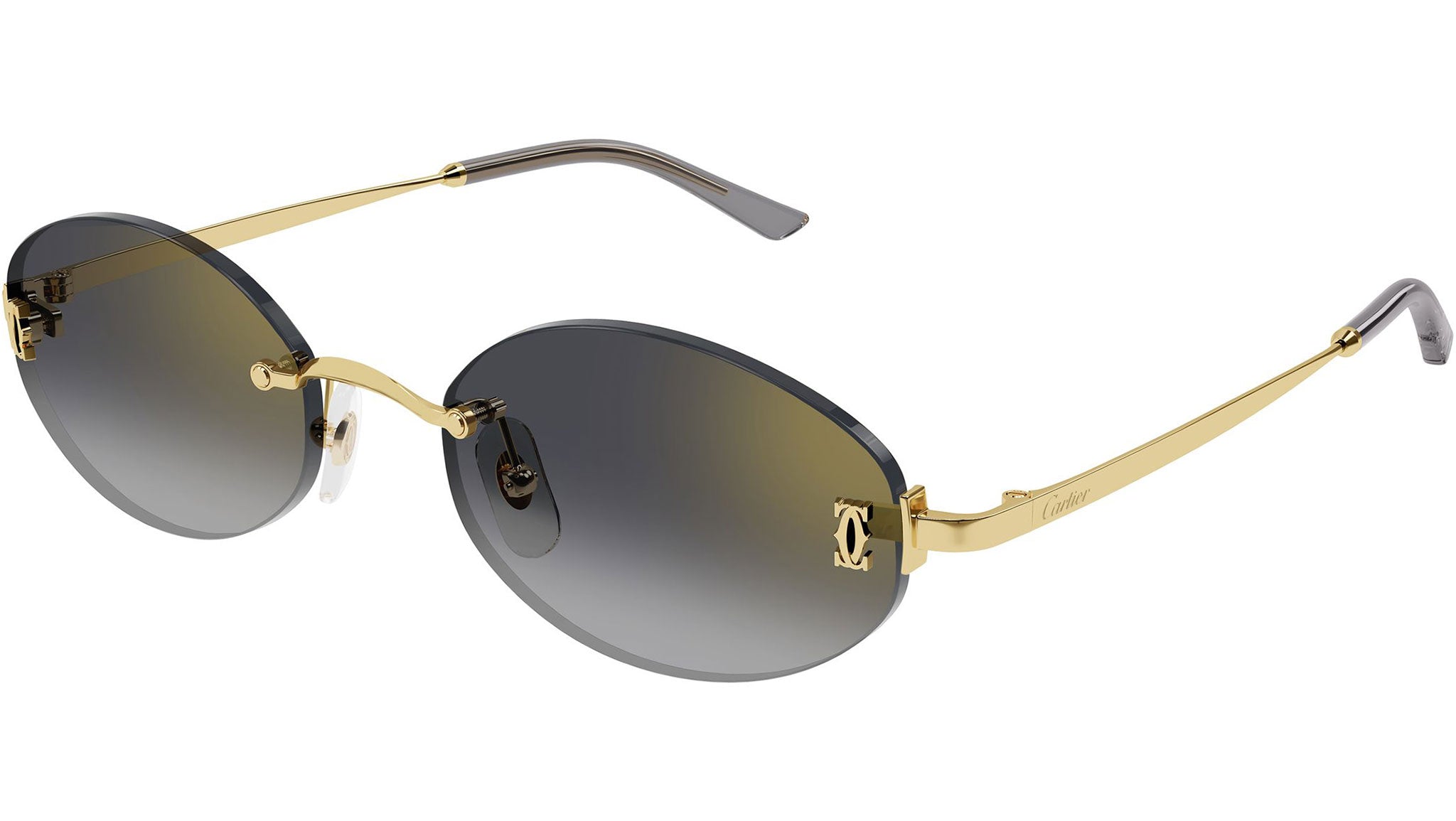 Occhiali da sole Cartier CT0592S 001 donna con montatura ovale in metallo color oro finitura smooth e lenti grigio sfumato con flash dorato. Linea: Core Range. Codice modello: CT0592S. Codice colore: 001. Made in France. Rivenditore autorizzato Cartier online. Gli occhiali vengono consegnati con custodia e accessori originali e sono coperti dalla garanzia ufficiale di 12 mesi del produttore.