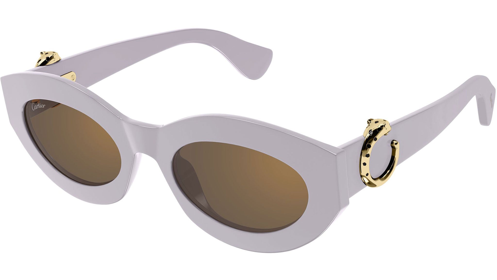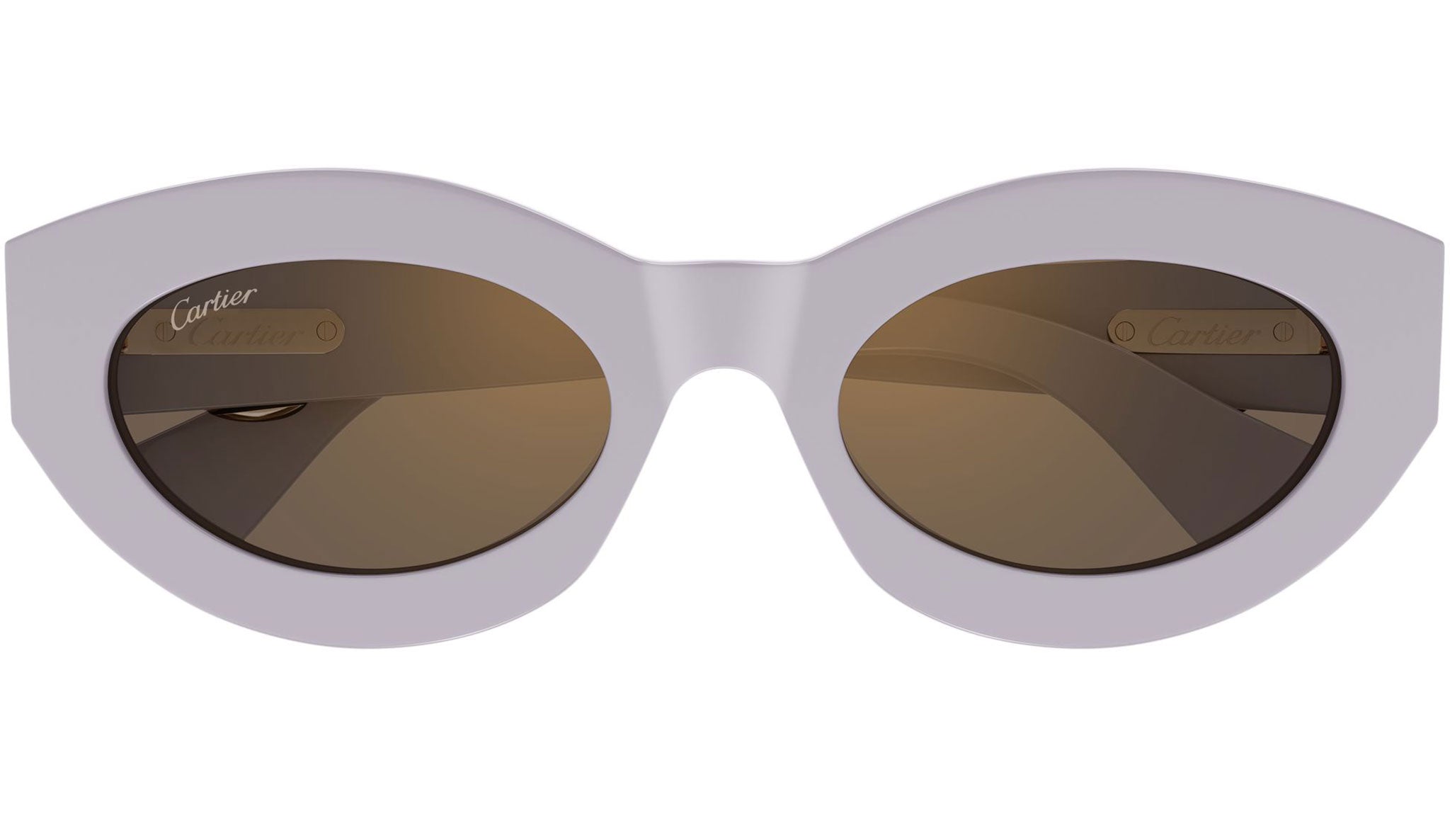Occhiali da sole Cartier CT0638S 005 donna con montatura ovale in acetato riciclato color lavanda chiaro grigiastro e lenti marrone rossastro ultra profondo. Linea: Contemporary. Codice modello: CT0638S. Codice colore: 005. Made in Italy. Rivenditore autorizzato Cartier online. Gli occhiali vengono consegnati con custodia e accessori originali e sono coperti dalla garanzia ufficiale di 12 mesi del produttore.