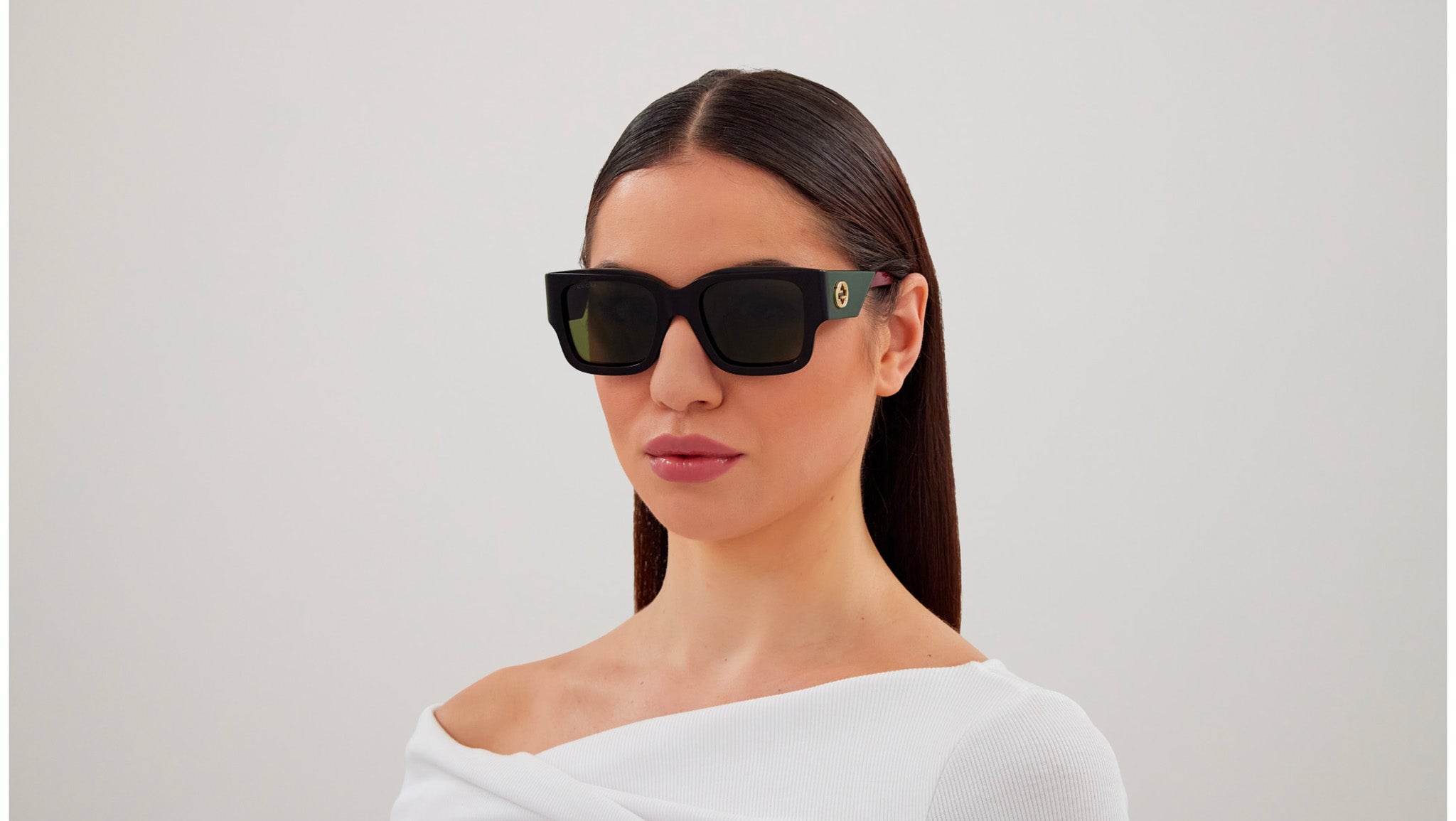 Occhiali da sole Gucci modello GG1663S linea GG Logo in acetato riciclato forma rettangolare codice colore 002 tartaruga scuro lucido con aste rosso e lenti verde scuro tinta unita. Rivenditore autorizzato Gucci online. Gli occhiali vengono consegnati con custodia e accessori originali e sono coperti dalla garanzia ufficiale di 12 mesi del produttore.