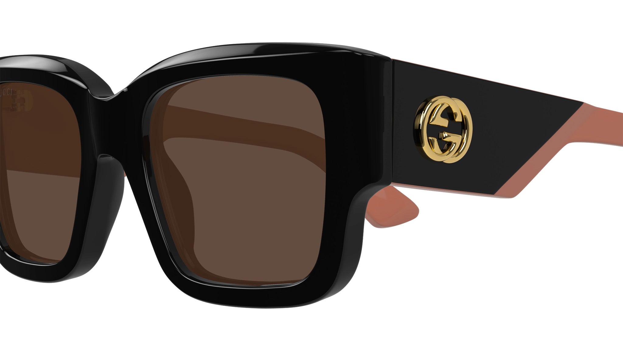 Occhiali da sole Gucci modello GG1663S linea GG Logo in acetato riciclato forma rettangolare codice colore 004 nero lucido con aste rosa e lenti marrone tinta unita. Rivenditore autorizzato Gucci online. Gli occhiali vengono consegnati con custodia e accessori originali e sono coperti dalla garanzia ufficiale di 12 mesi del produttore.