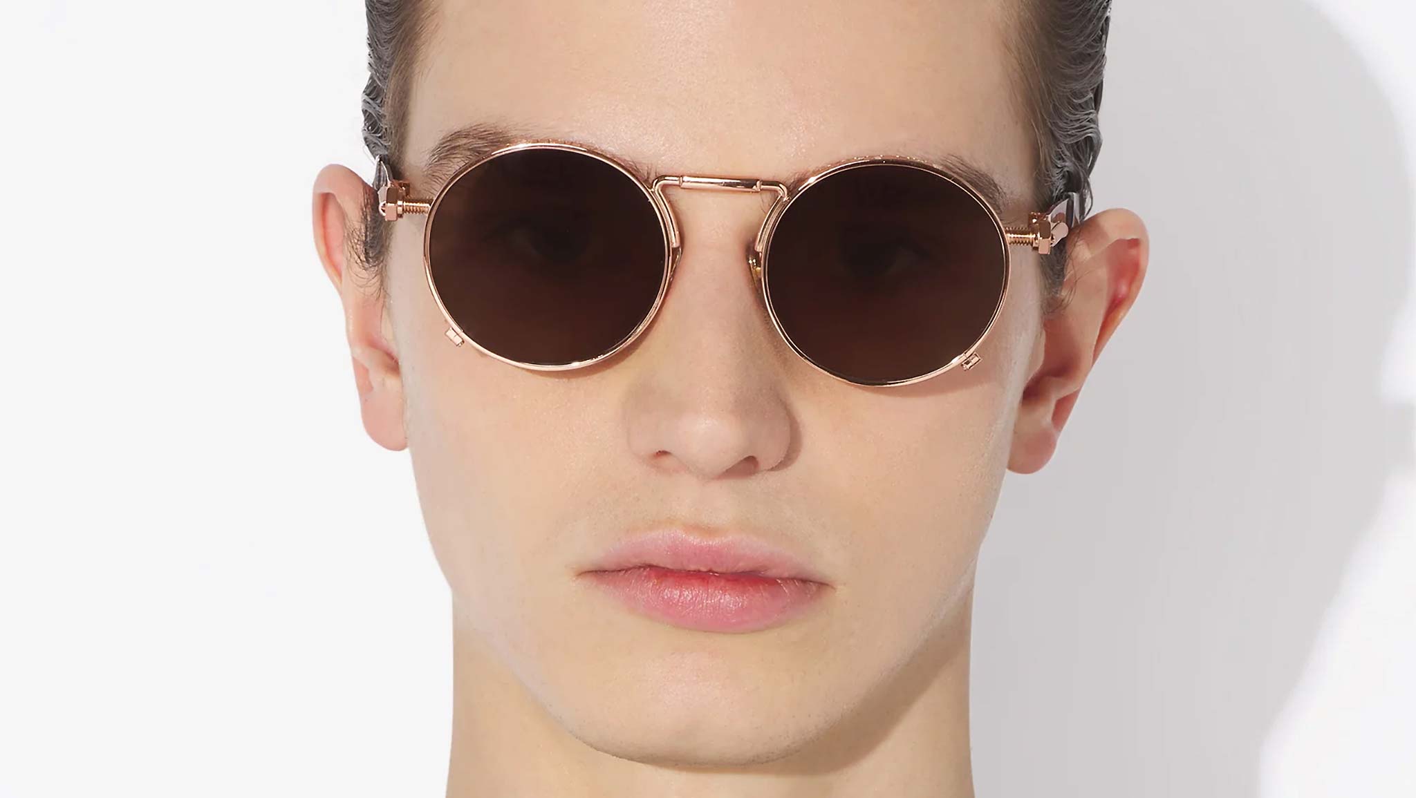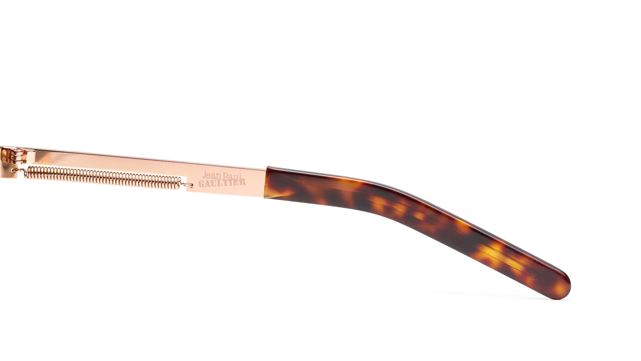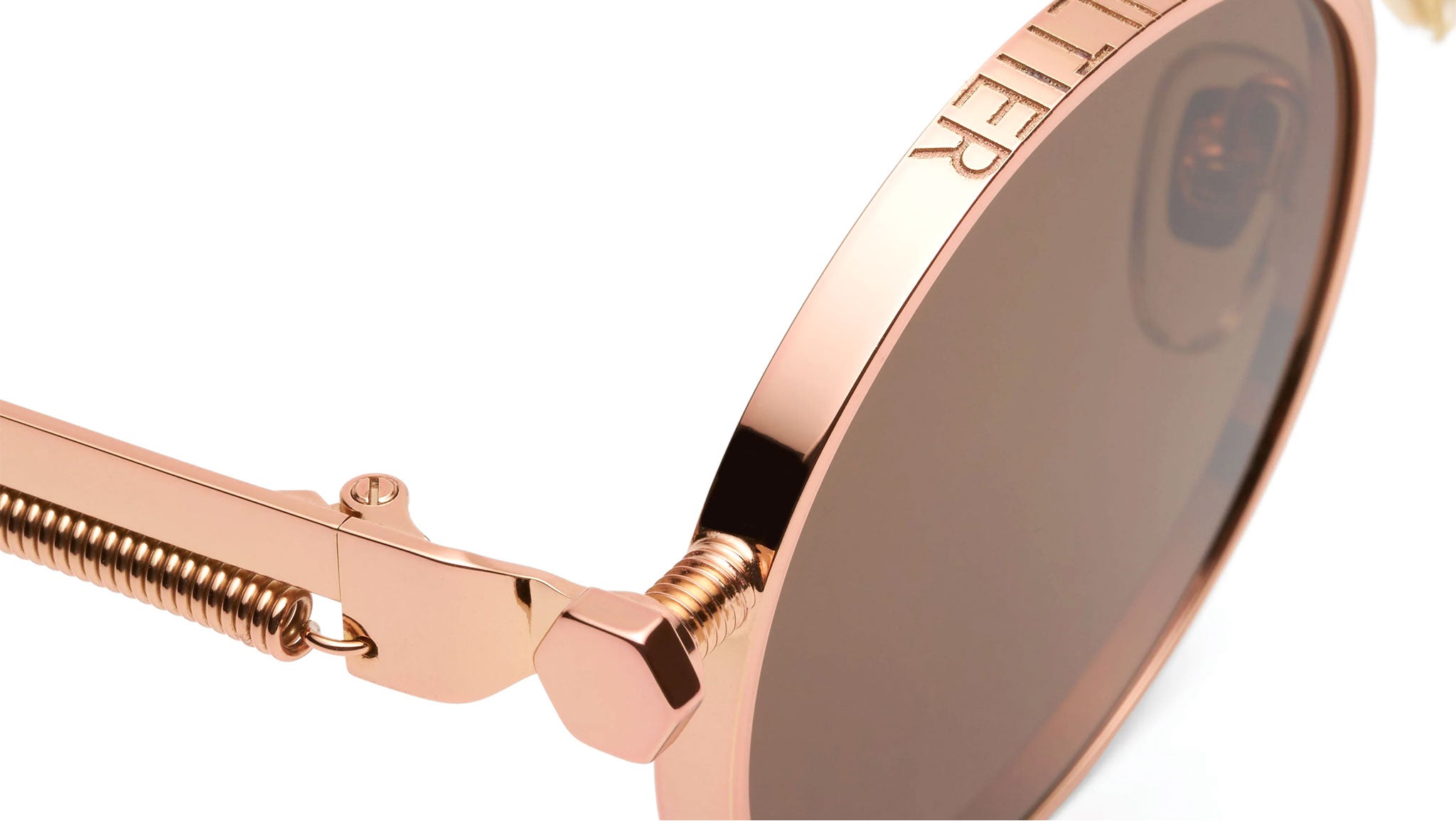 The Jean Paul Gaultier Ressort metal sunglasses showcase a refined round silhouette with gold-toned frames, distinguished by a unique spring detail along the temples that adds a touch of mechanical sophistication. Made in France, this model features high-performance lenses with Category 3 UV filters, offering reliable sun protection along with anti-glare and anti-scratch treatments for enhanced visual comfort and durability. Crafted from a combination of stainless steel, nickel silver, and acetate, the construction is elevated by premium Mazzucchelli acetate temple tips, ensuring both luxury and comfort. The discreet Jean Paul Gaultier logo completes the design with a signature of exclusivity.