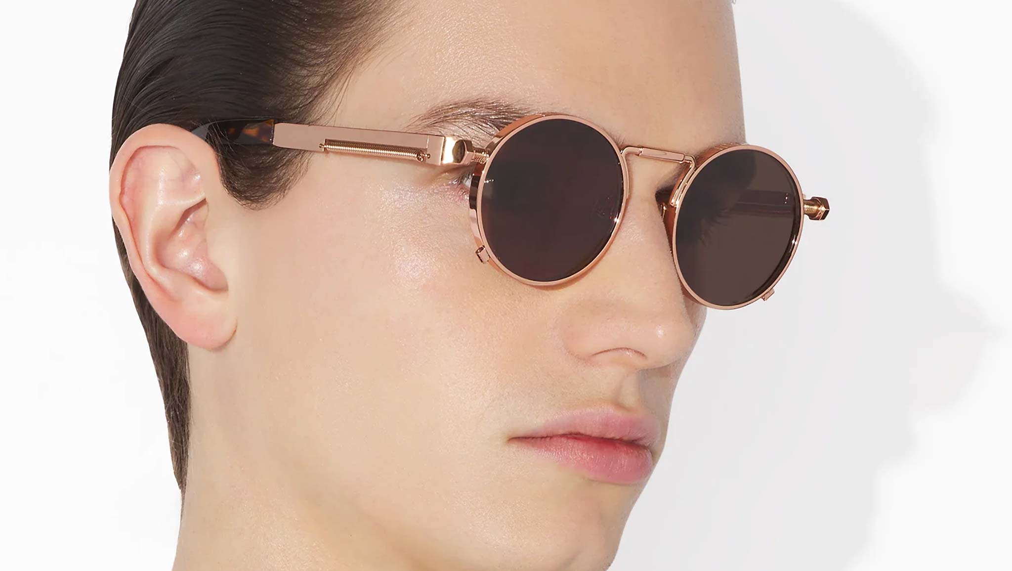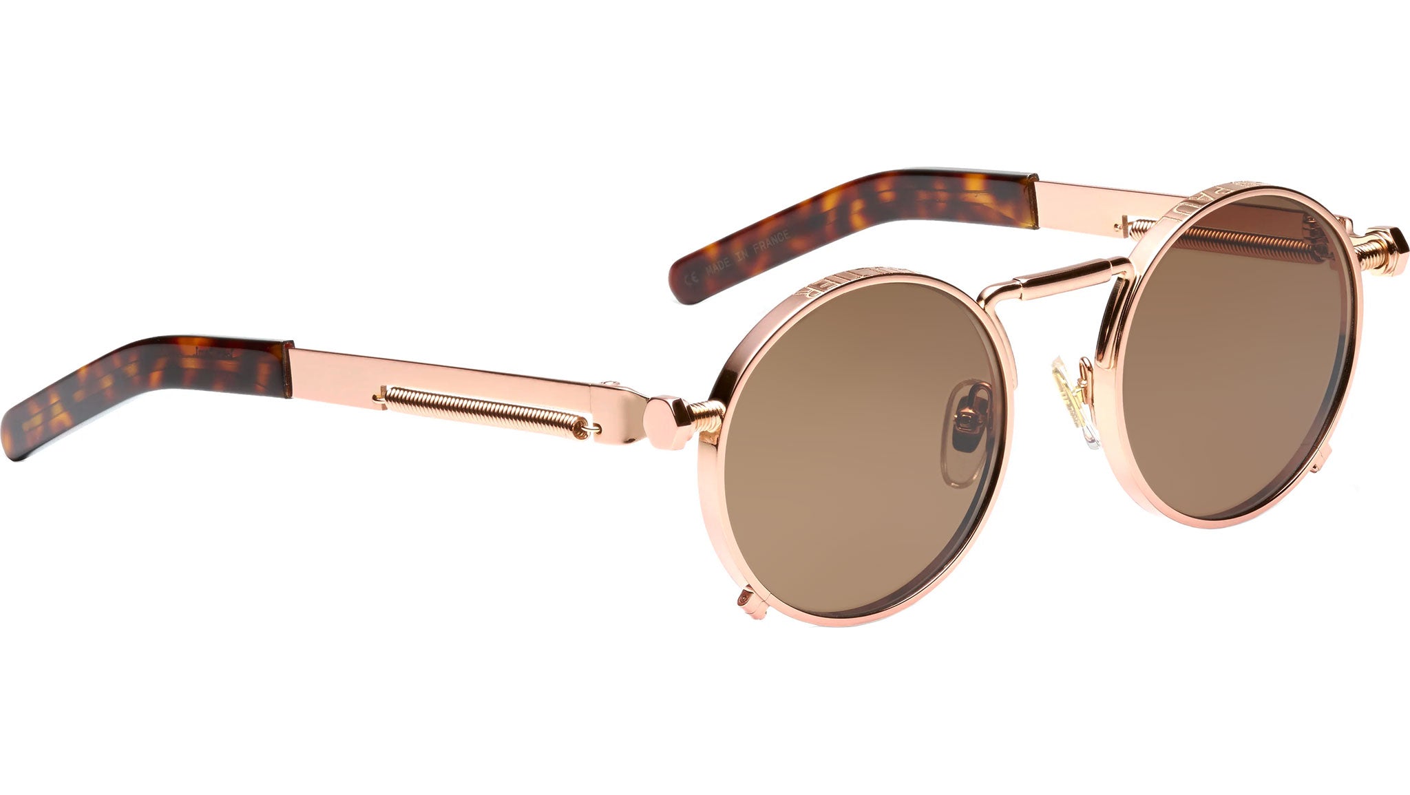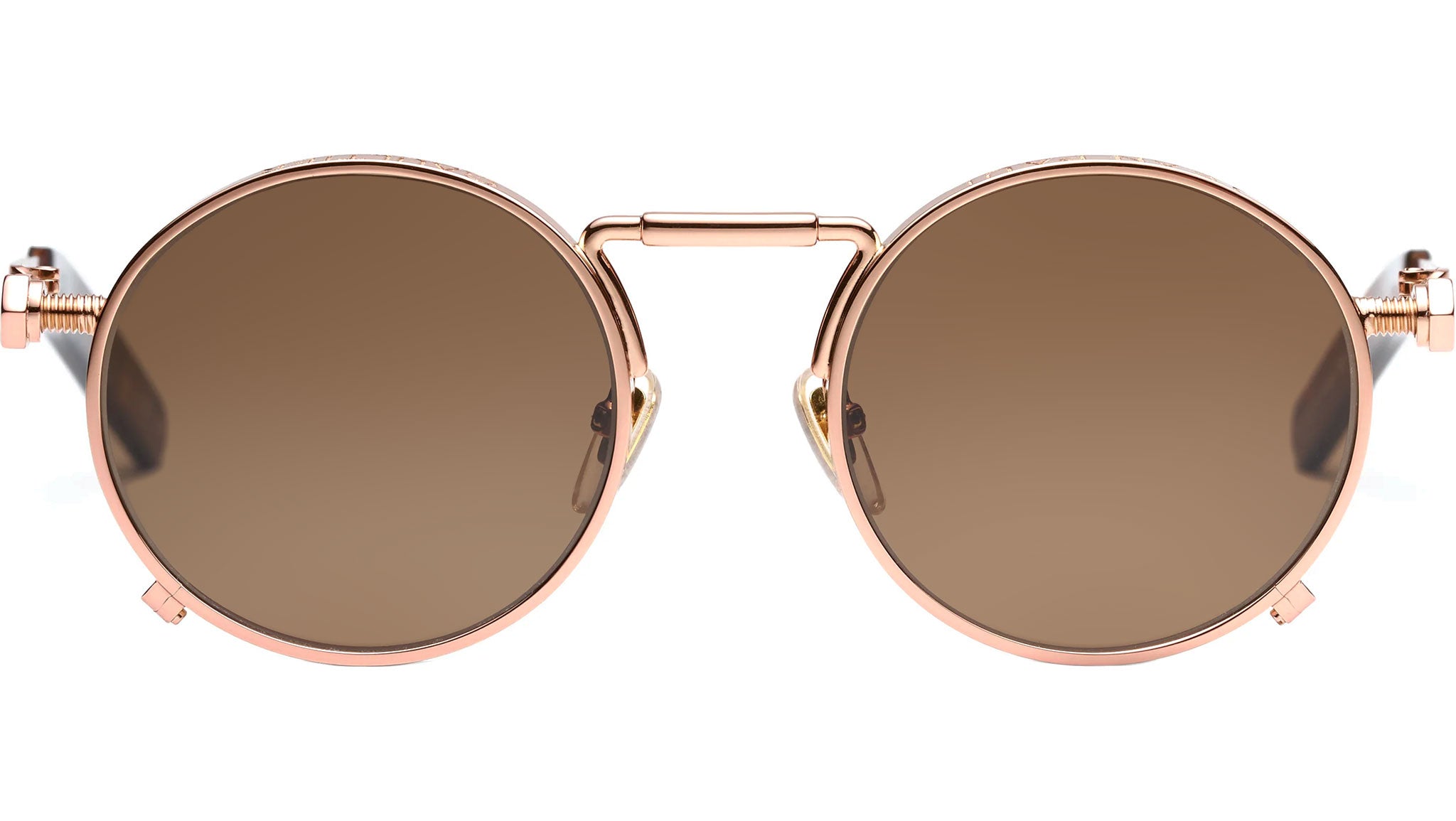 The Jean Paul Gaultier Ressort metal sunglasses showcase a refined round silhouette with gold-toned frames, distinguished by a unique spring detail along the temples that adds a touch of mechanical sophistication. Made in France, this model features high-performance lenses with Category 3 UV filters, offering reliable sun protection along with anti-glare and anti-scratch treatments for enhanced visual comfort and durability. Crafted from a combination of stainless steel, nickel silver, and acetate, the construction is elevated by premium Mazzucchelli acetate temple tips, ensuring both luxury and comfort. The discreet Jean Paul Gaultier logo completes the design with a signature of exclusivity.