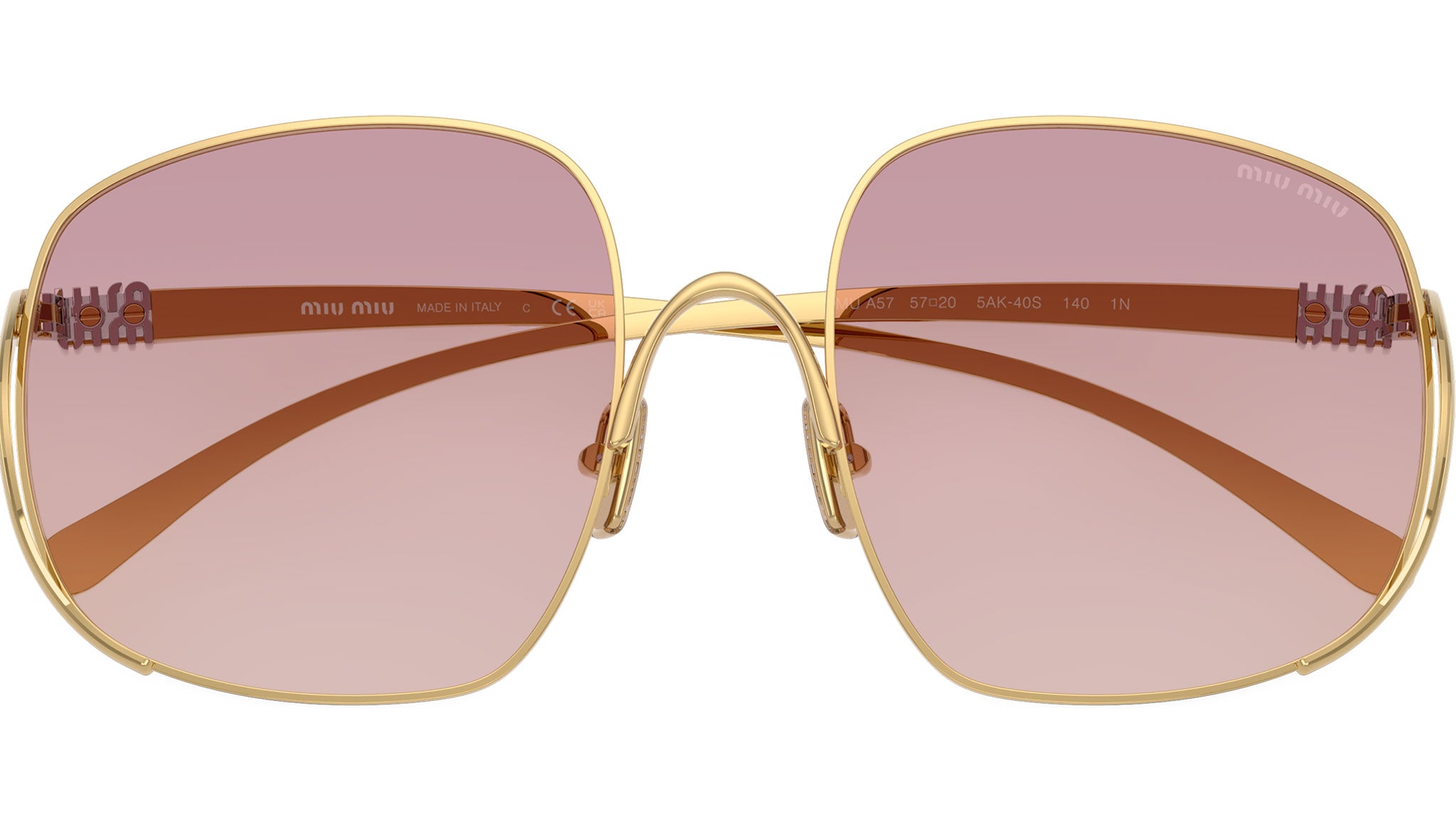 Occhiali da sole Miu Miu MU A57S 5AK40S donna con montatura quadrata in metallo oro e lenti in bio poliammide color marrone sfumato viola. Naselli regolabili. Linea: Main Collection. Codice modello: 0MU A57S. Codice colore: 5AK40S. Made in Italy. Rivenditore autorizzato Miu Miu online. Gli occhiali vengono consegnati con custodia e accessori originali e sono coperti dalla garanzia ufficiale di 12 mesi del produttore.