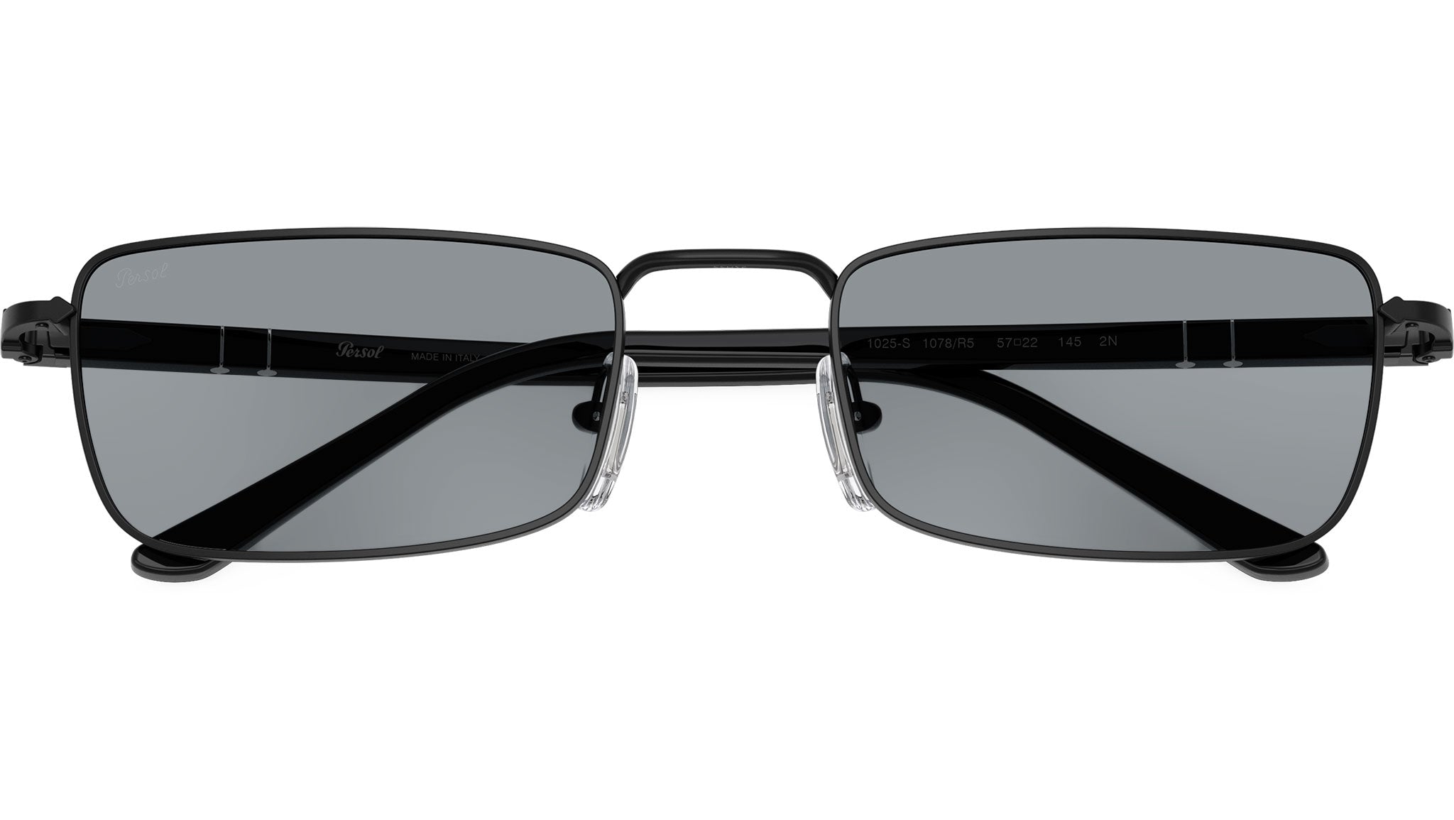 Occhiali da sole Persol unisex modello PO1025S 1078R5 con montatura rettangolare in metallo nero e lenti in cristallo grigio base 2.5. Naselli regolabili. Linea: Sartoria. Codice Brand: 0PO1025S. Codice colore: 1078R5. Rivenditore autorizzato online Persol Eyewear. Ogni prodotto Persol viene consegnato con astuccio originale e accessori ed è coperto da garanzia del produttore di 12 mesi.