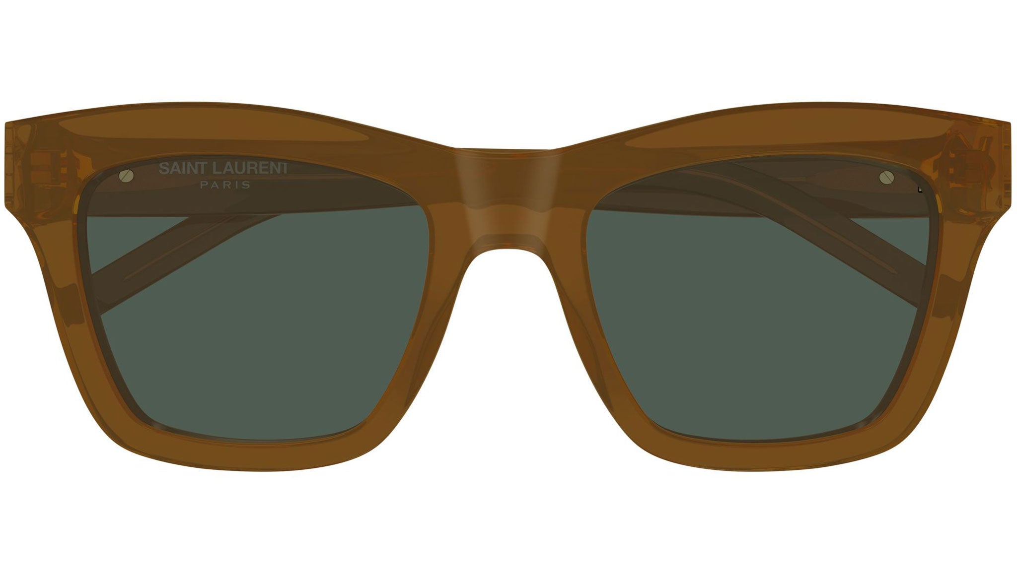 Occhiali da sole Saint Laurent SL M156 005 donna con montatura cat eye in acetato riciclato marrone cognac trasparente e lenti verde tinta unita. Linea: Monogram. Codice modello: SL M156. Codice colore: 005. Made in Italy. Rivenditore autorizzato Saint Laurent online. Gli occhiali vengono consegnati con custodia e accessori originali e sono coperti dalla garanzia ufficiale di 12 mesi del produttore.