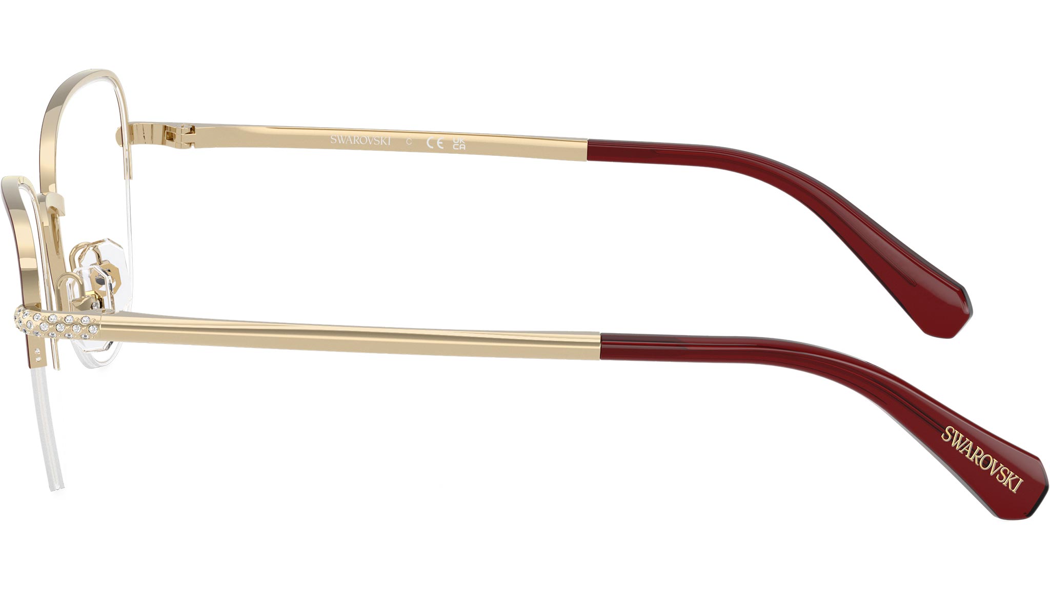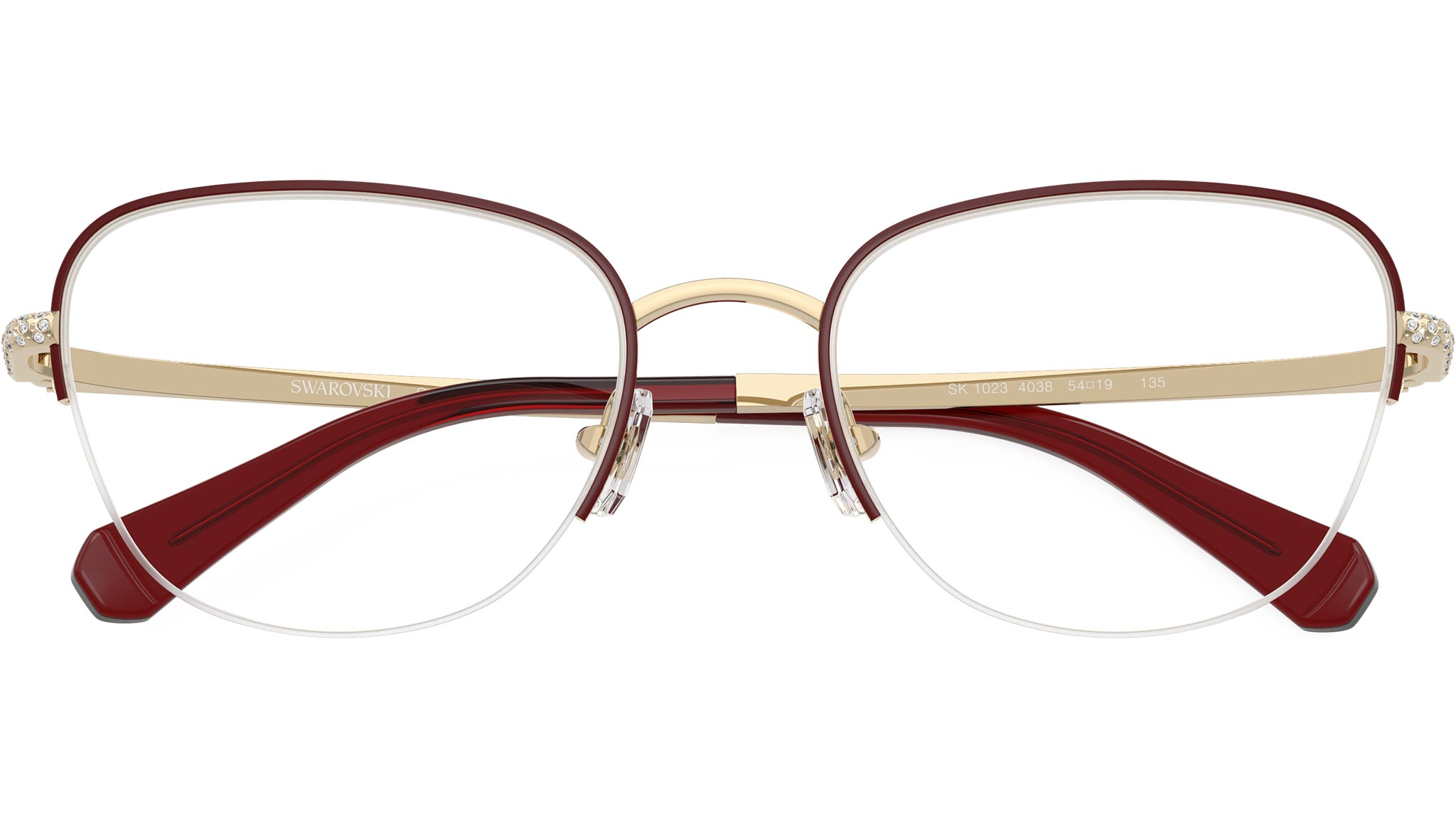 Occhiali da vista Swarovski SK1023 4038 donna, con montatura cat eye in metallo color oro chiaro / canna di fucile bordeaux e lenti demo. Naselli regolabili. Linea: Science of Facets. Codice modello: SK1023. Codice colore: 4038. Rivenditore autorizzato Swarovski Eyewear online. Ogni prodotto Swarovski viene consegnato con astuccio originale e accessori ed è coperto da garanzia del produttore di 12 mesi.