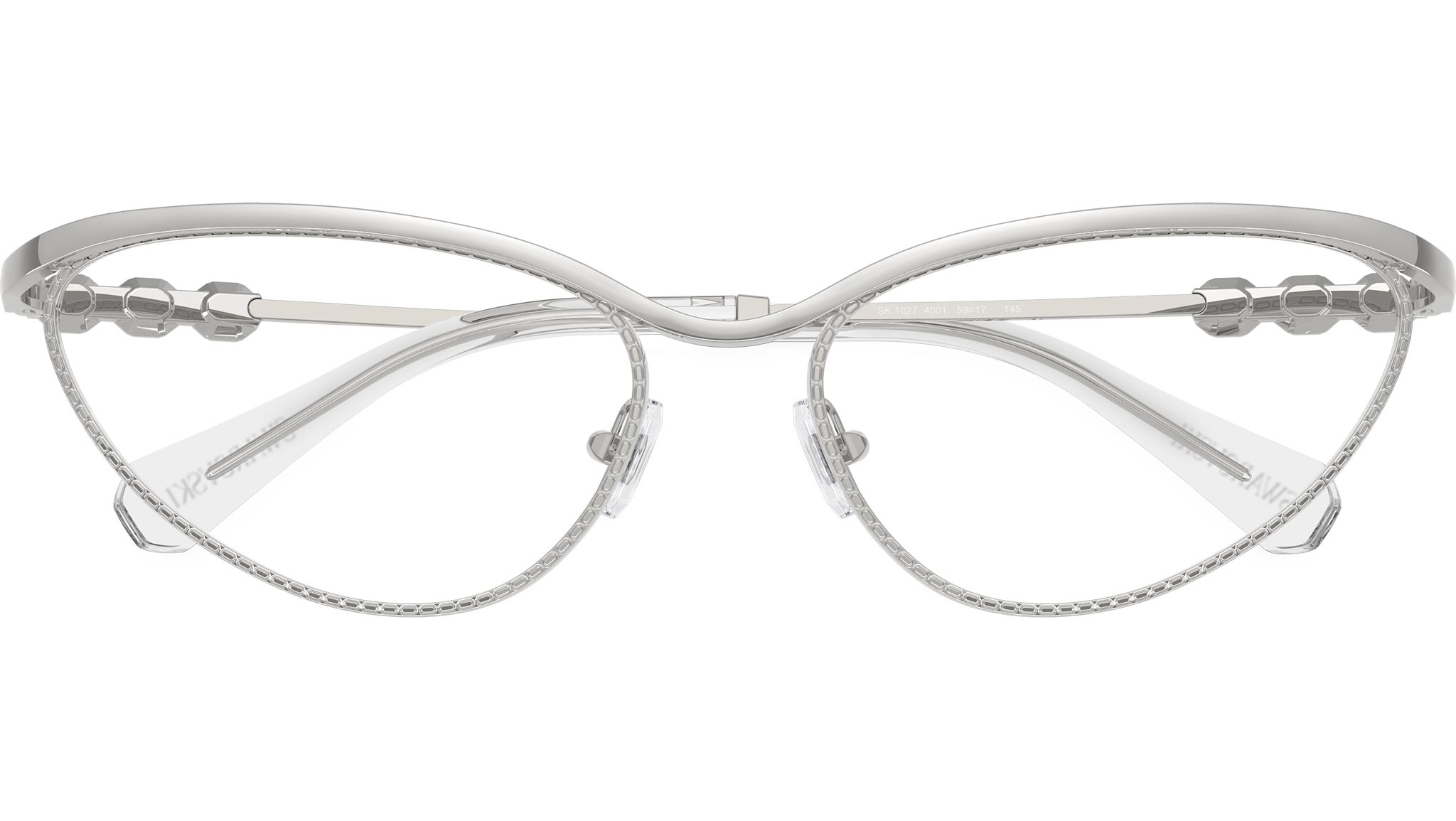 Occhiali da vista Swarovski SK1027 4001 donna, con montatura cat eye in metallo color argento e lenti demo. Naselli regolabili. Linea: Science of Facets. Codice modello: SK1027. Codice colore: 4001. Rivenditore autorizzato Swarovski Eyewear online. Ogni prodotto Swarovski viene consegnato con astuccio originale e accessori ed è coperto da garanzia del produttore di 12 mesi.
