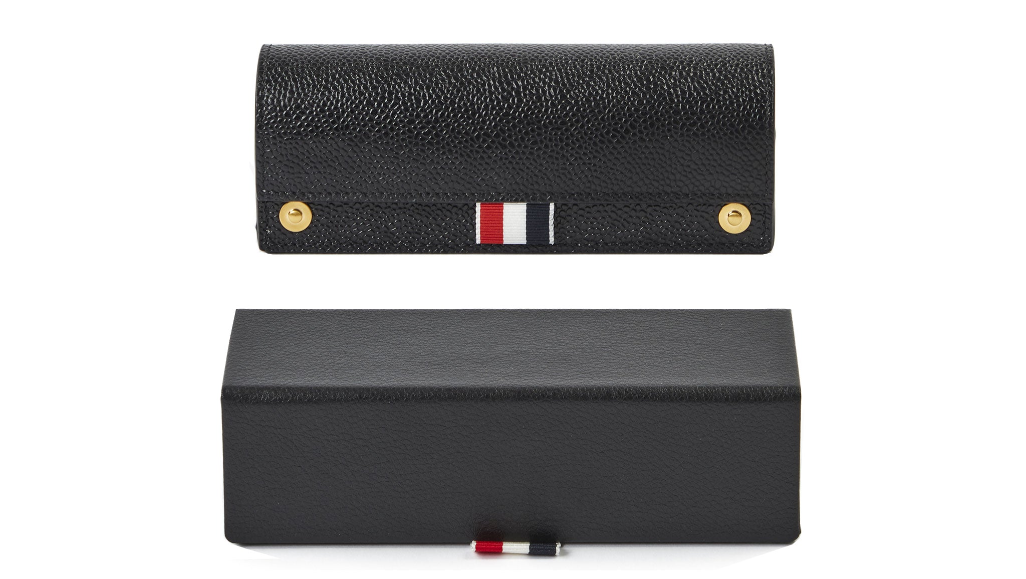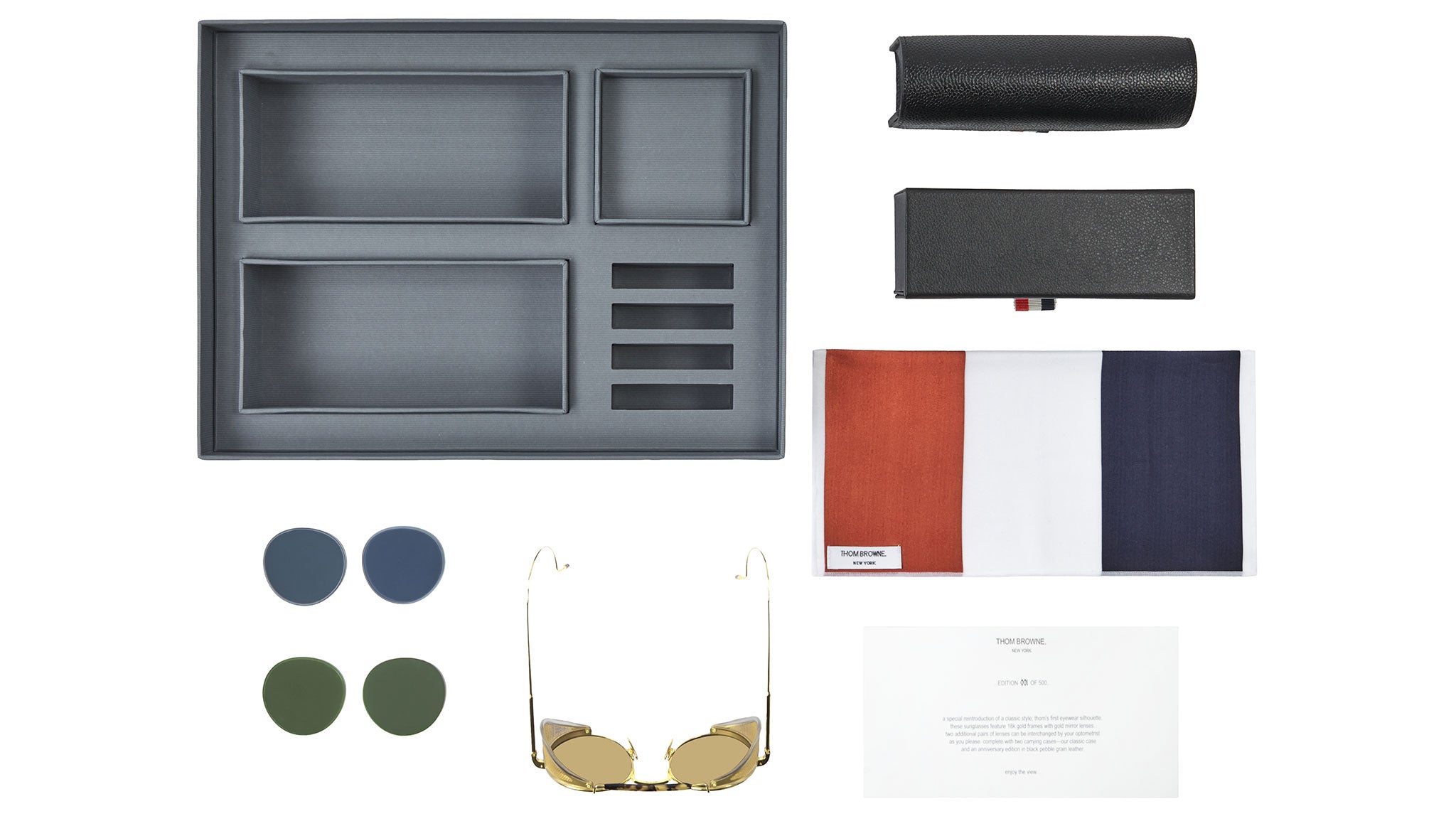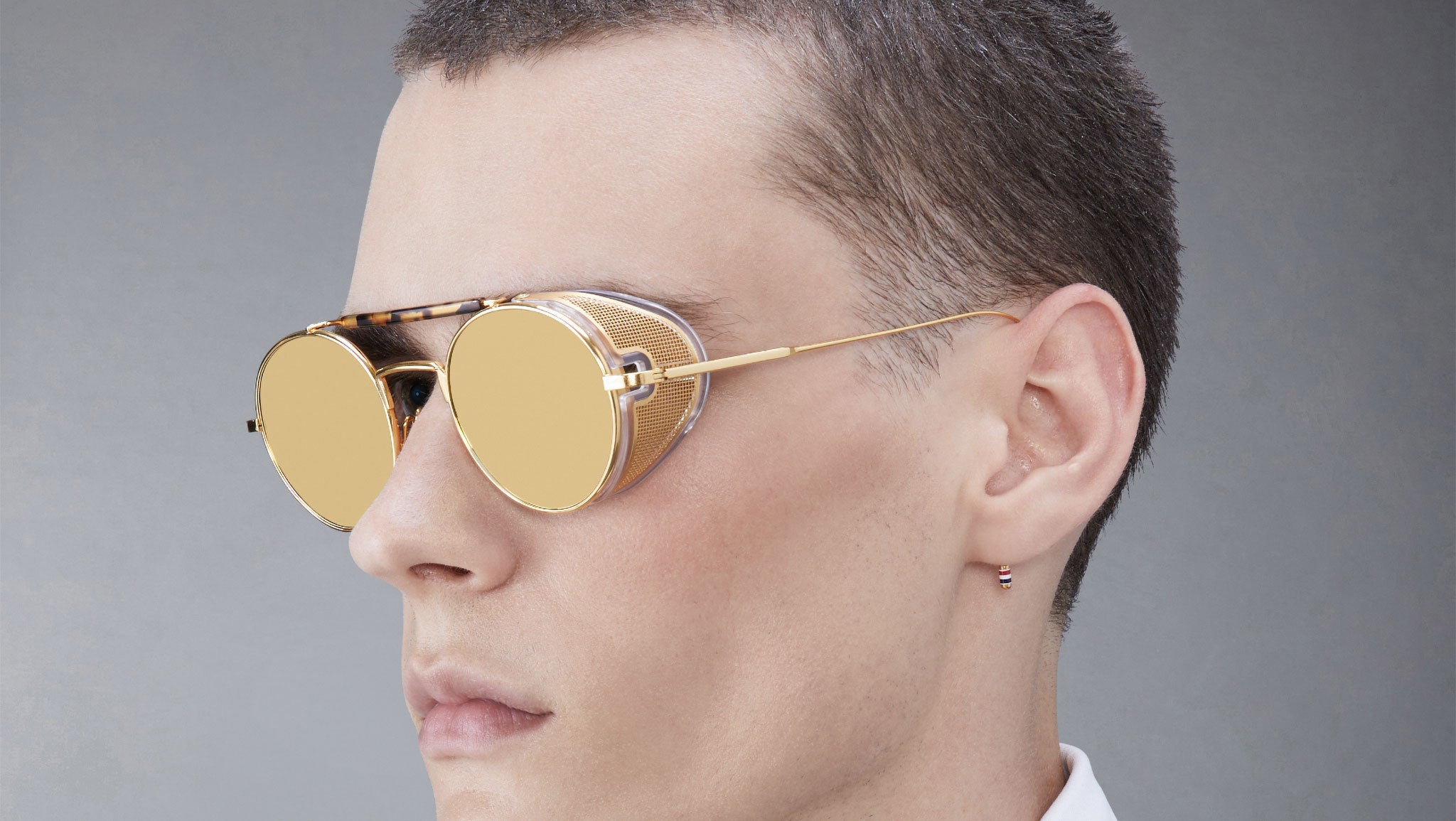 Realizzato a mano in Giappone, il TB-001 è integralmente di titanio, che conferisce leggerezza e durabilità. La montatura placcata in oro è adornata con aste rifinite in rosso, bianco e blu Thom Browne e paranaselli laterali perforati che si piegano elegantemente, per praticità. Le cerniere su misura precisione, la barra sopraccigliare tartarugata Tokyo e i naselli incisi con quattro barre accentuano il suo stile unico.