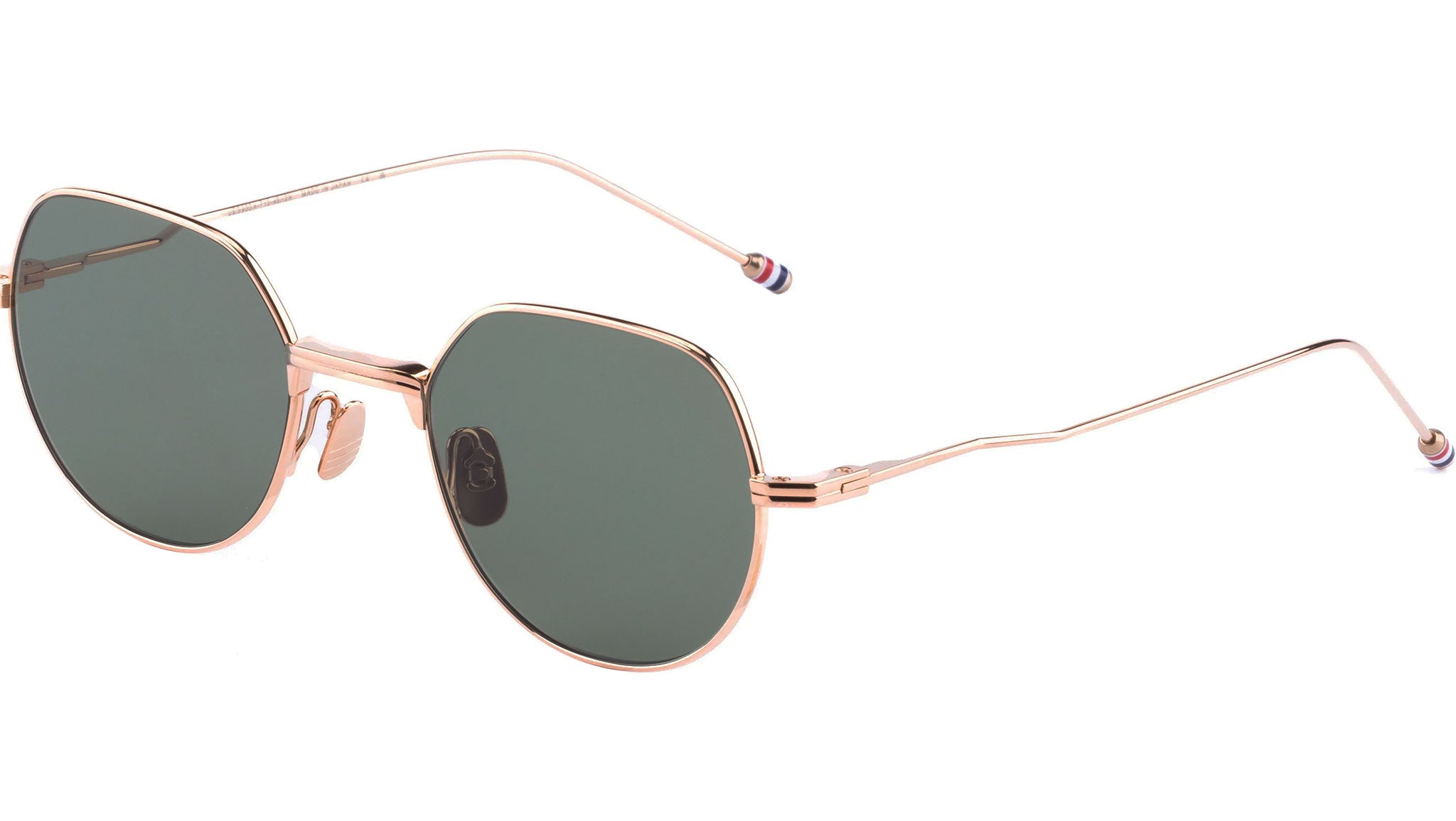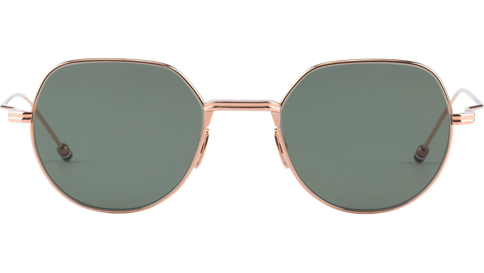 Occhiali da sole Thom Browne unisex modello UES935A con montatura full-rim in titanio oro rosa e lenti color verde G-15. Codice Brand: UES935A. Codice colore: 710. Rivenditore autorizzato Thom Browne online. Gli occhiali vengono consegnati con custodia e accessori originali e sono coperti da garanzia standard di 12 mesi del produttore.