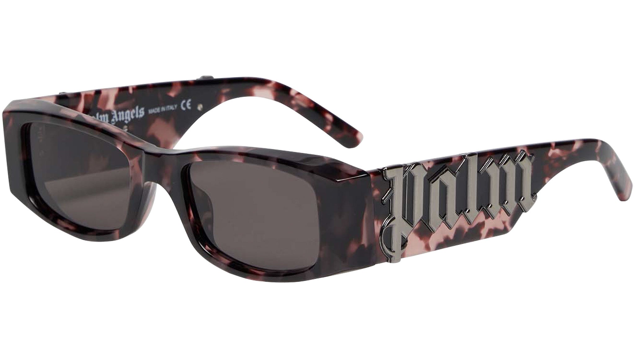 Angel di Palm Angel nasce da un sottile richiamo agli anni 90, che si abbina ad un'attitudine tutta rock. Angel presenta una struttura solida, dove il maxi logo Palm Angels con l'iconico carattere goth del marchio, caratterizza costantemente la personalità, scontrandosi con l'ordinario. La forma è grintosa e rettangolare, caratterizzata dal logo affermativo presente sulle aste. La montatura è interamente realizzata in acetato e gioca sui contrasti e sul volume. La stecca è adornata con metallo galvanizzato sopra il logo in rilievo. Una montatura statement, per uno stile rock anni '90.