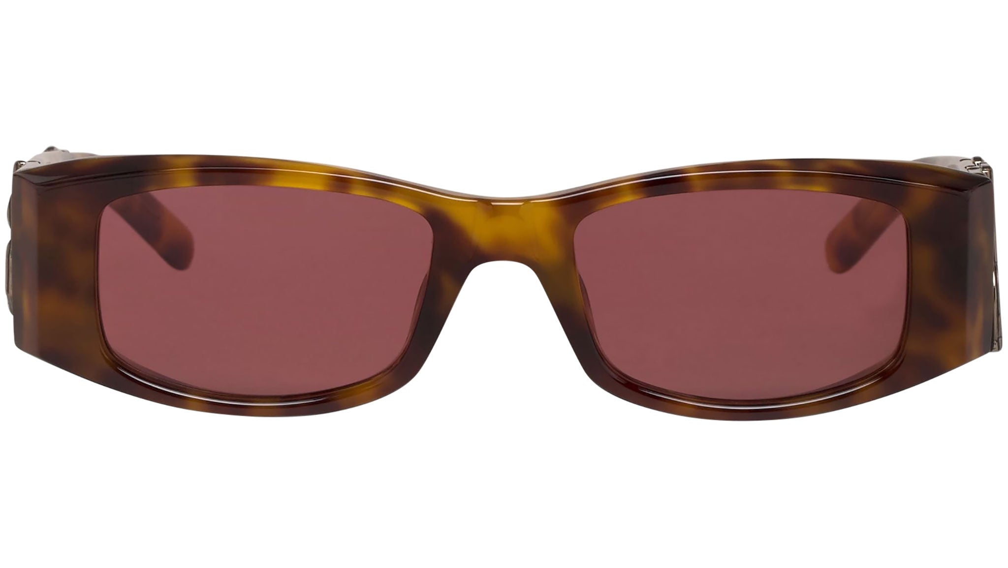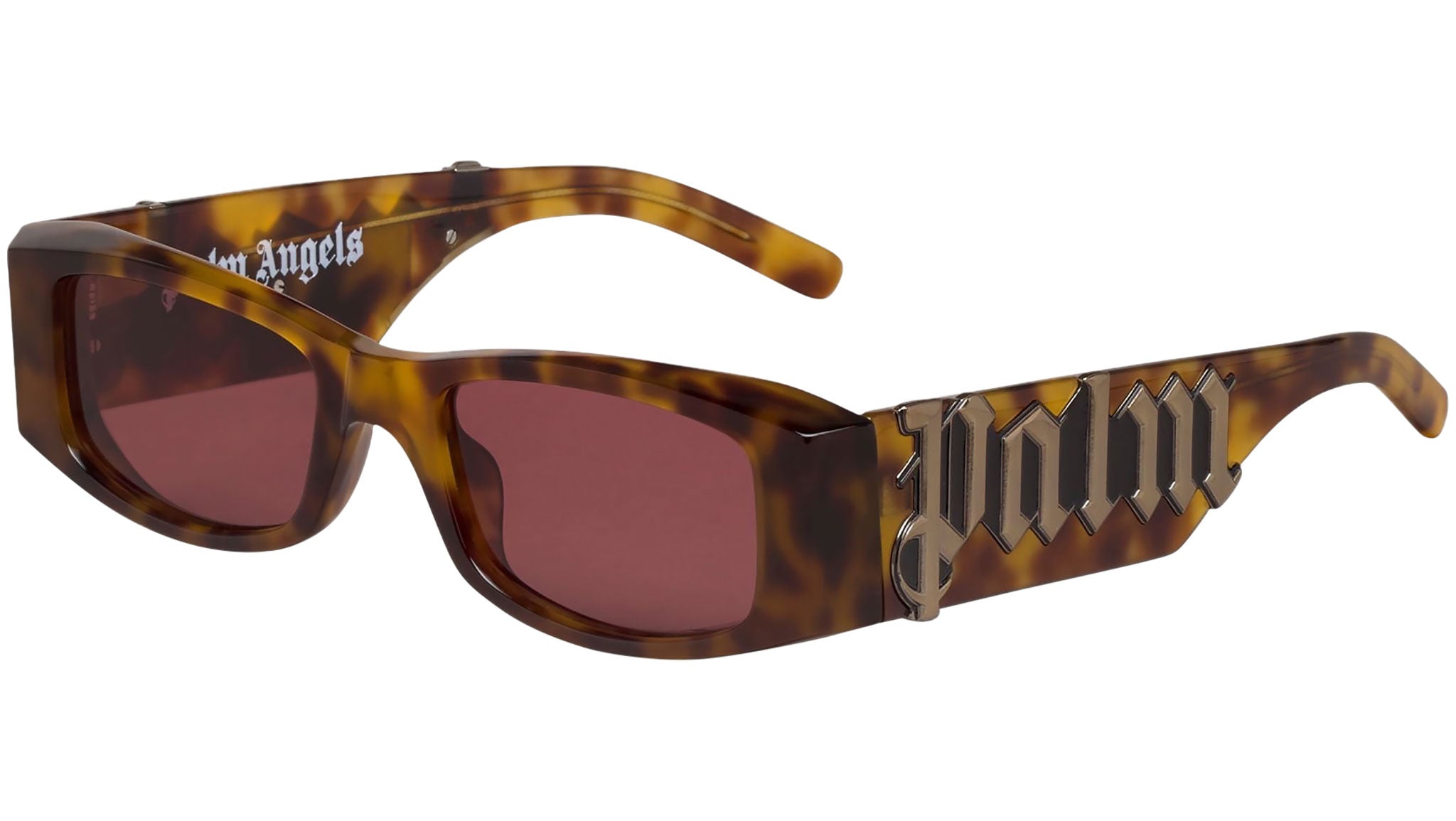 A subtle 90’s feeling matching with a rock attitude: angel presents a solid structure, where the maxi Palm Angels logo in the iconic goth font of the brand steadily marks its personality, clashing the ordinary. Rectangular sunglasses in tortoise brown with purple lenses. "Palm Angels" logo printed at sides. 10% plastic. 80% acetate. 10% metal