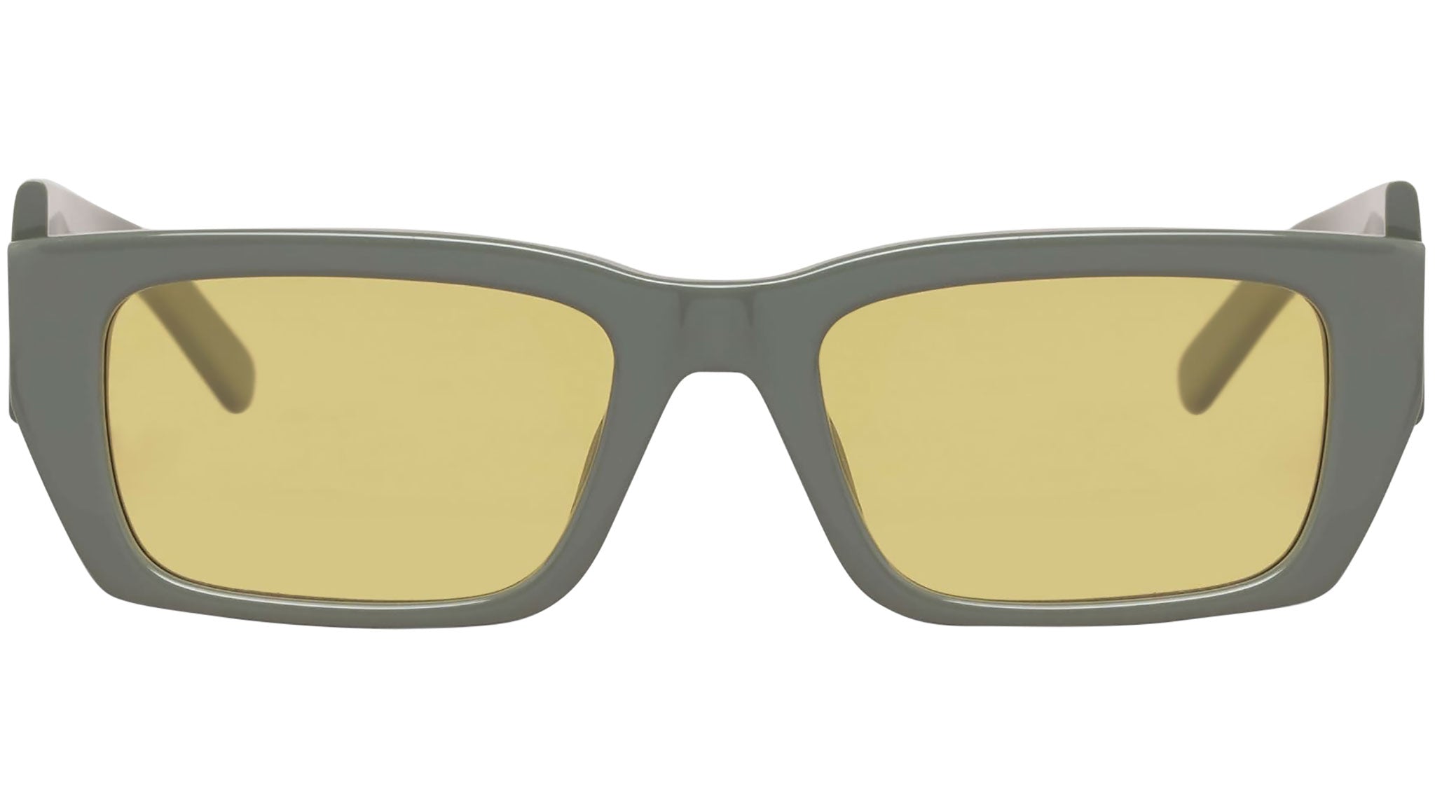 Unexpected is the key word for palm. a dissonance staggers the structure, breaking the temple linearity and creating a distortion in the frame. Rectangular sunglasses in military green with yellow lenses. "Palm Angels" logo printed at sides. 10% plastic. 90% acetate