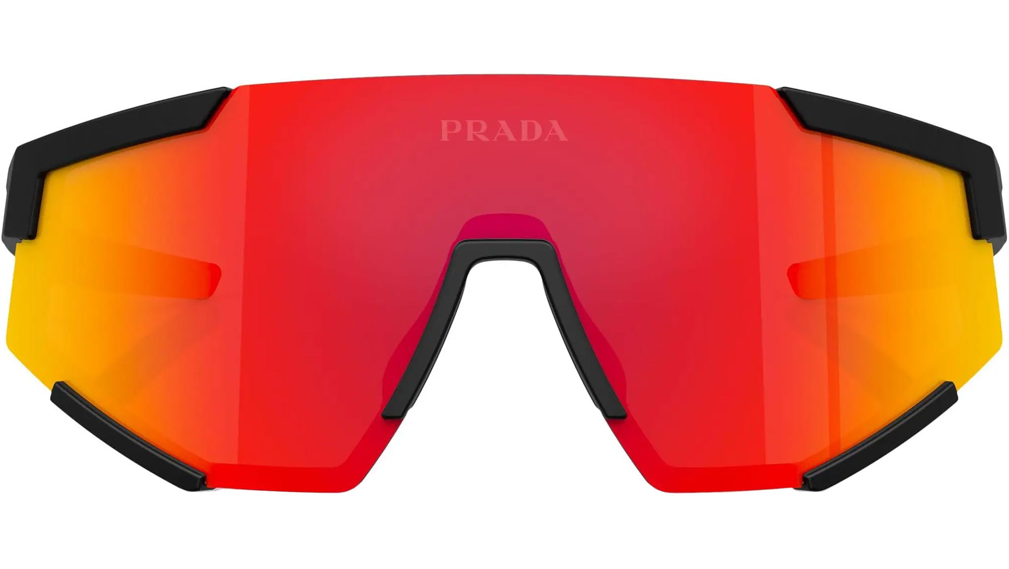 Occhiali da sole Prada Linea Rossa modello PS 04WS codice colore DG002U con montatura geometrica rimless in nylon color nero gommato e lenti in poliammide color marrone a specchio arancione. Rivenditore autorizzato Prada. Ogni prodotto Prada Linea Rossa viene consegnato con astuccio originale e accessori.