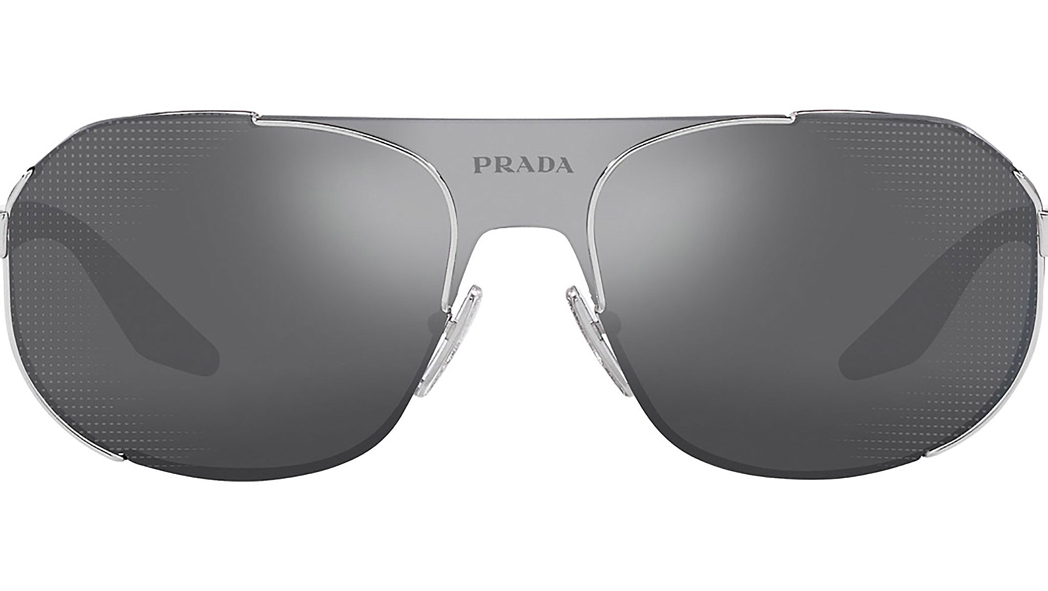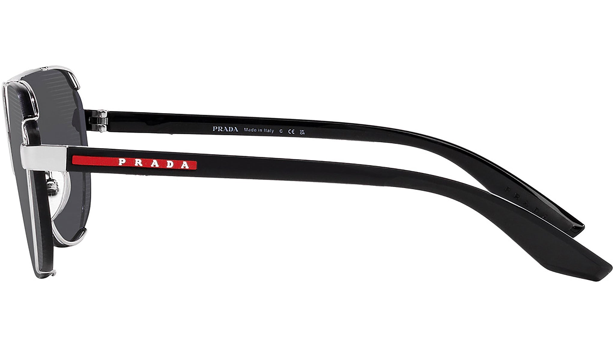 Occhiali da sole Prada Linea Rossa modello PS 53YS codice colore 1BC07U con montatura rettangolare rimless in metallo color argento e lenti in poliammide color grigio a specchio nero. Rivenditore autorizzato Prada. Ogni prodotto Prada Linea Rossa viene consegnato con astuccio originale e accessori.