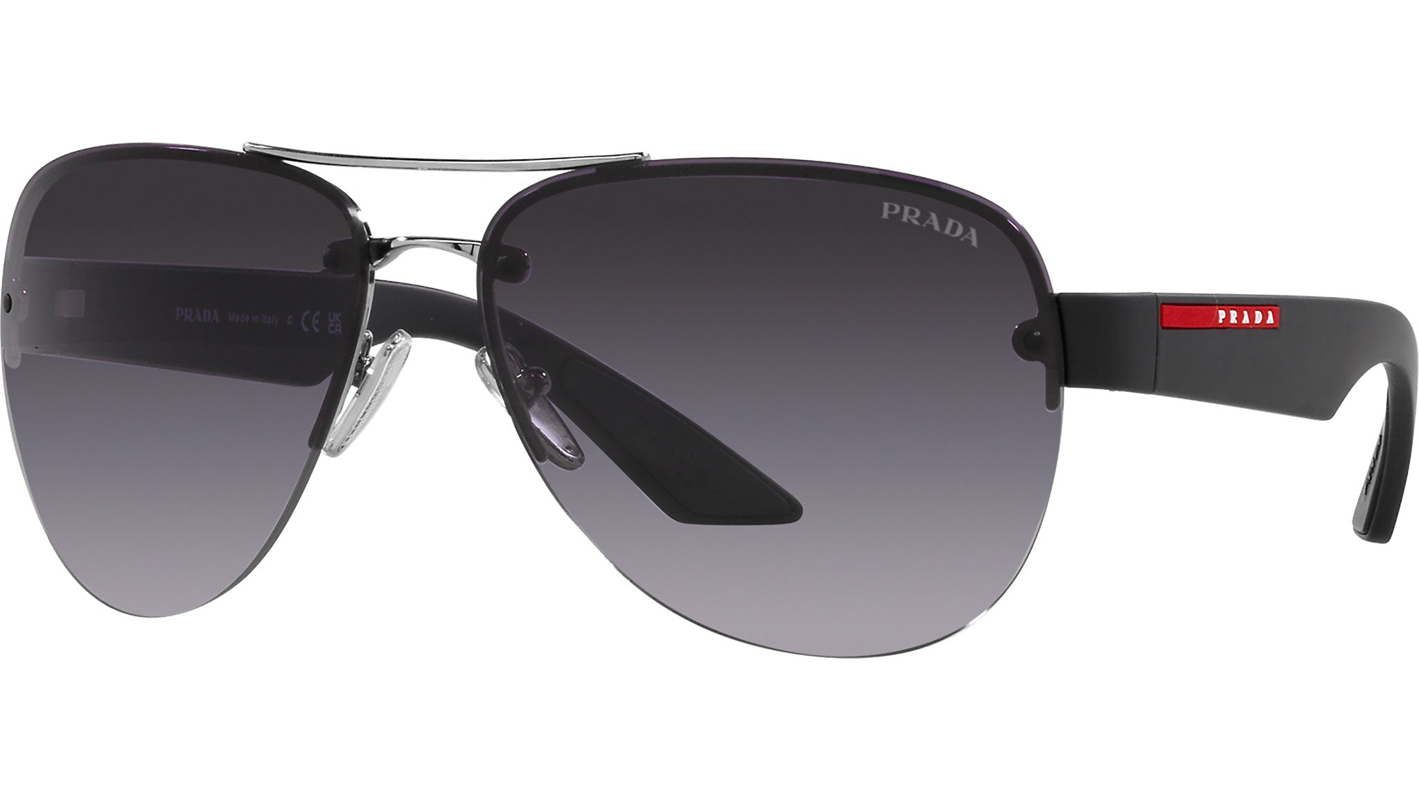 Occhiali da sole Prada Linea Rossa modello PS 55YS codice colore 1BC09U con montatura aviatore semi rim in metallo color argento e lenti in poliammide color grigio sfumato. Rivenditore autorizzato Prada. Ogni prodotto Prada Linea Rossa viene consegnato con astuccio originale e accessori.