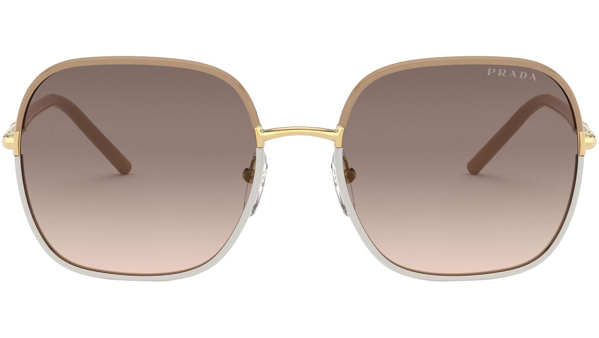 Prada sunglasses model PR 67XS, beige and white frame variant, color code 09G3D0 with light brown gradient light grey lens. Prada represents the best of Italian culture and tradition. It is one of the most innovative, prestigious and widely recognized brands in the fashion and luxury goods industries, with a keen attention to details and new trends.
