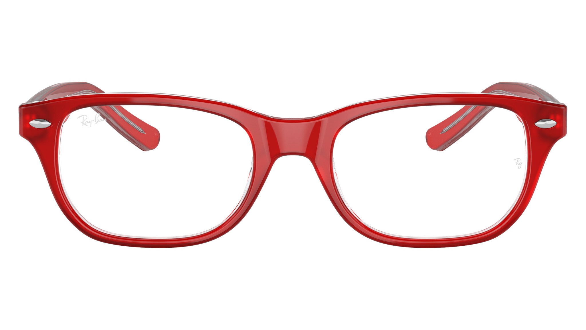 Occhiali da vista Ray-Ban Kids RY1555 color rosso su trasparente in acetato codice colore 3852. Forma quadrata full rim con lenti demo. Con custodia originale e garanzia. Rivenditore autorizzato Ray-Ban.