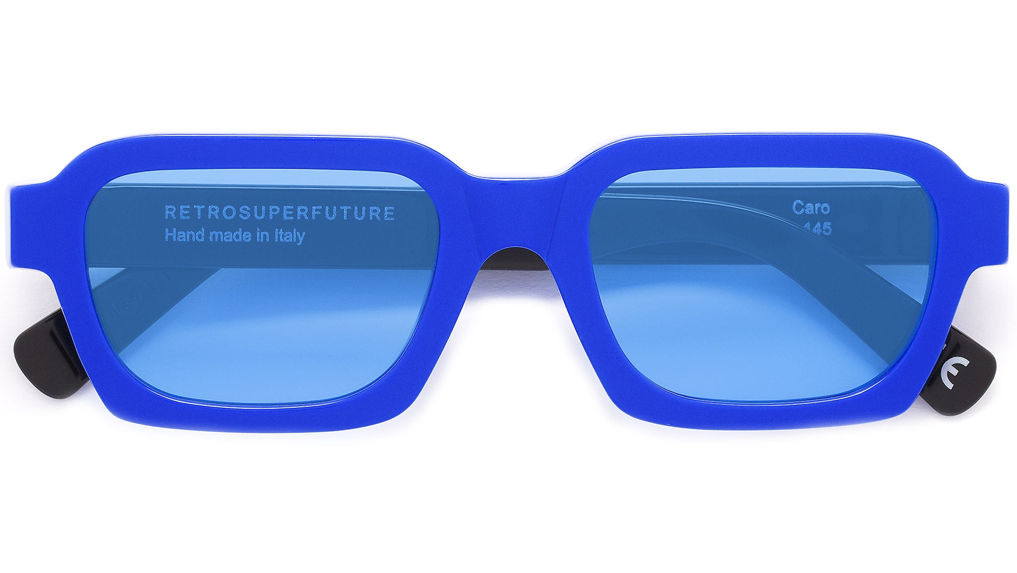Caro is a wide, geometric silhouette that blends 1960s Italianclassicism with 1990s grunge aesthetic. The model features a well-rounded design with a thick, sturdy acetate structure, squared temple tips and angular rims on the lower half of the frame. This version of Caro comes with tinted blue lenses, electric blue frontal piece and black temples. The box contains a semi-hard case and a cleaning cloth.