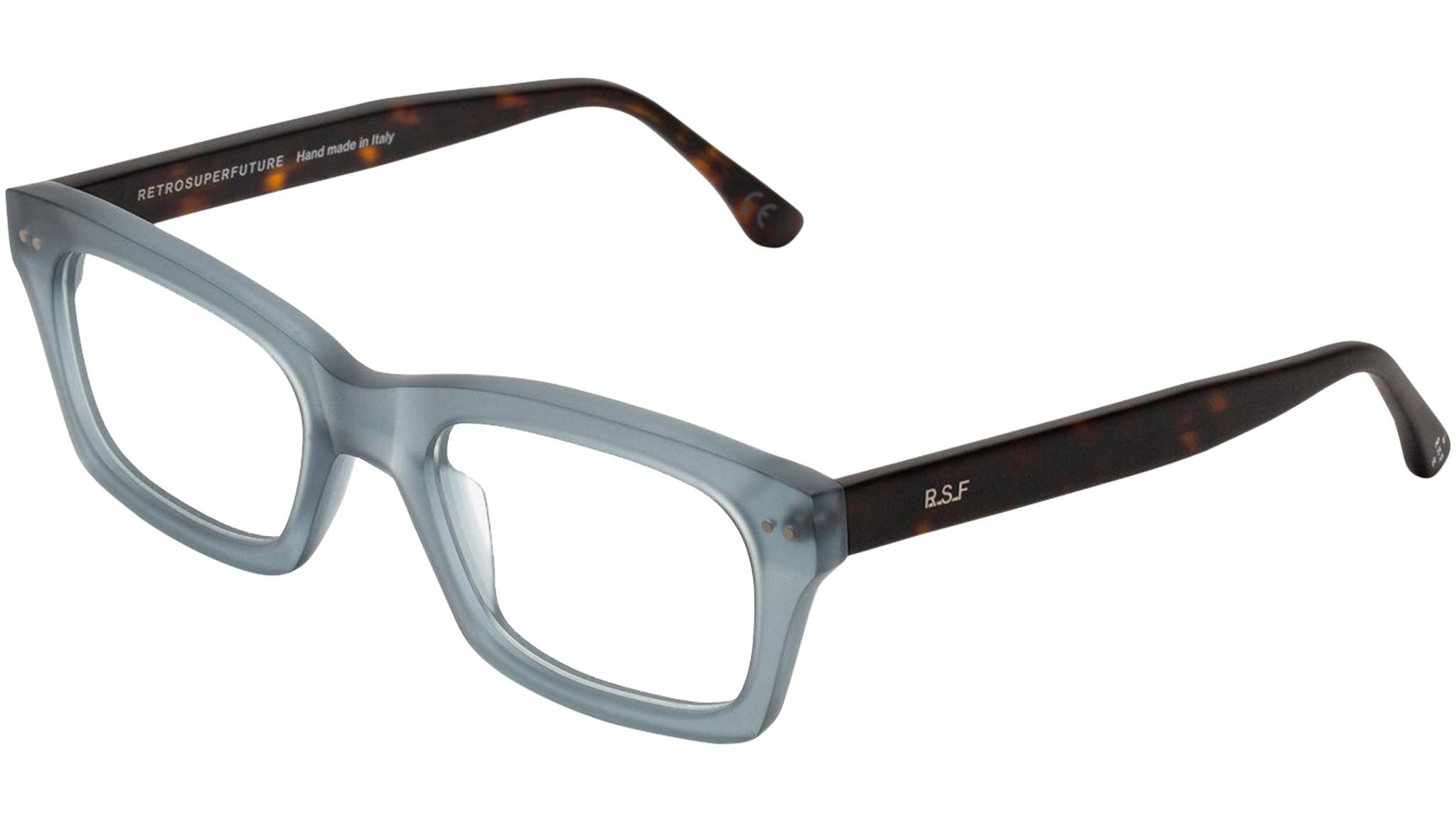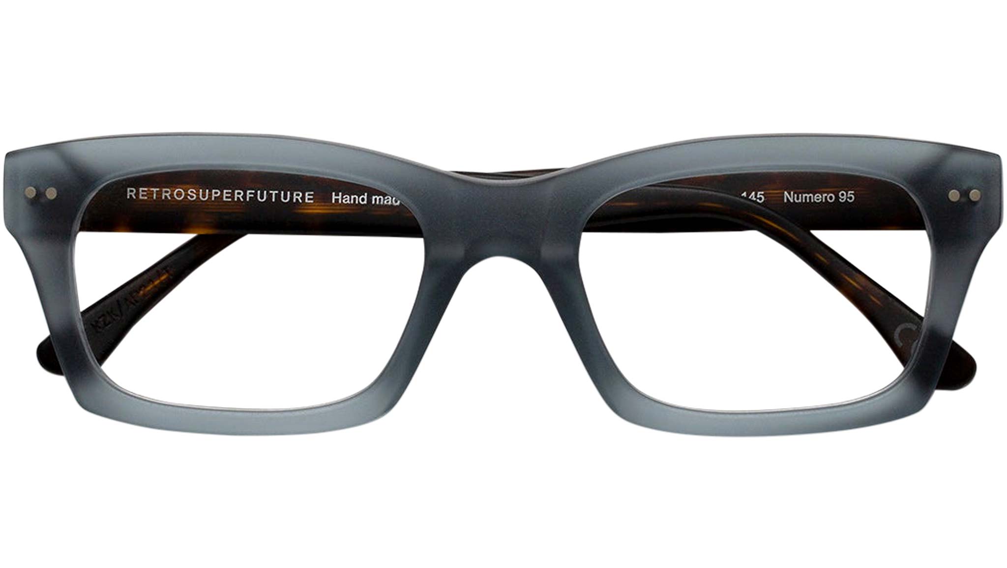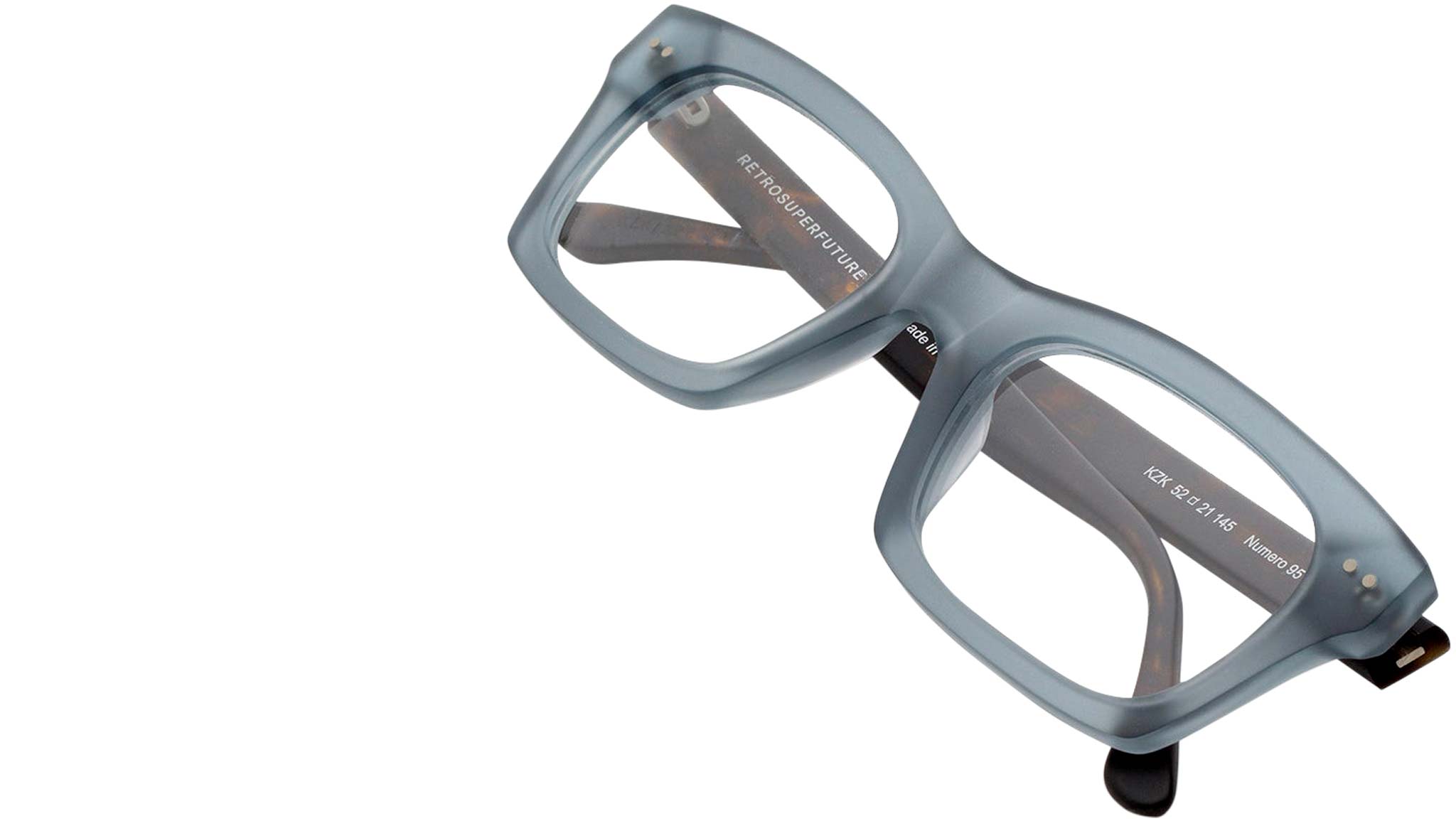 Numero 95 by Retrosuperfuture is an essential piece of eyewear conceived as an everyday staple, yet with a distinct street edge. Its carefully carved solid frame, features a comfortable nose saddle and sturdy acetate rims allows this shape to be well suited both for more formal everyday style as well as a casual urban approach. This model comes in a matte teal crystal front and matte Havana temples Sizes: R Lens Width: 52 mm Frame Front: Frame Side: 145 mm Product Code Size R: KZK