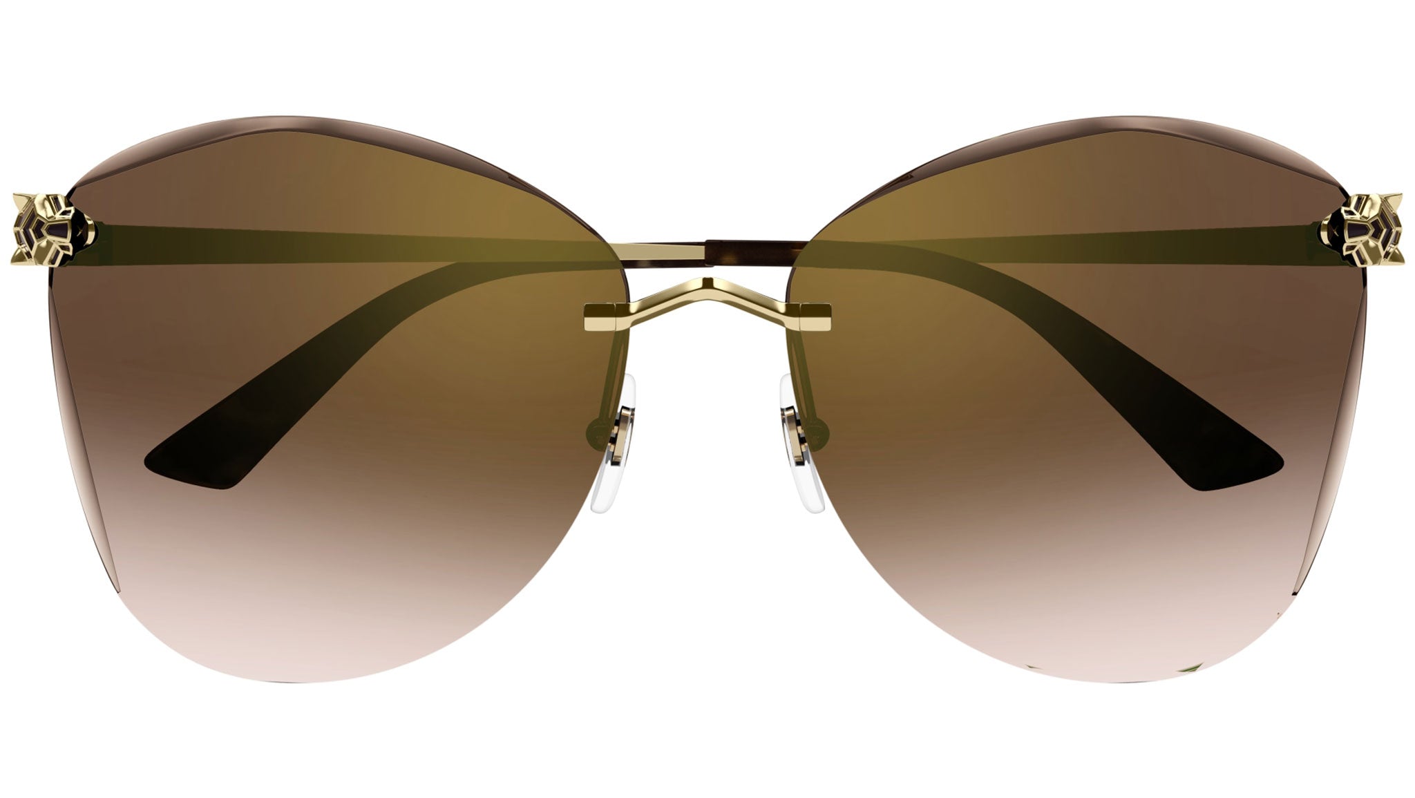 Occhiali da sole Cartier linea Core Range CT0398S 002 con montatura oro finitura smooth e lenti color marrone sfumato con flash oro.
